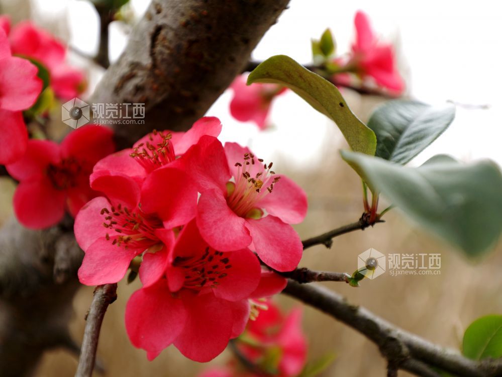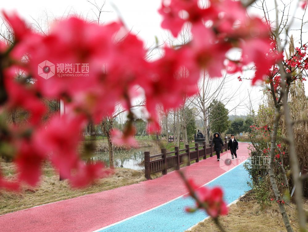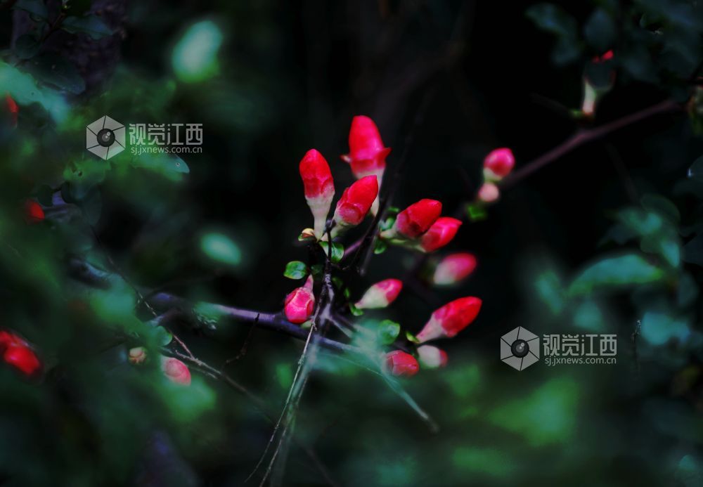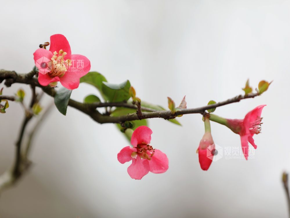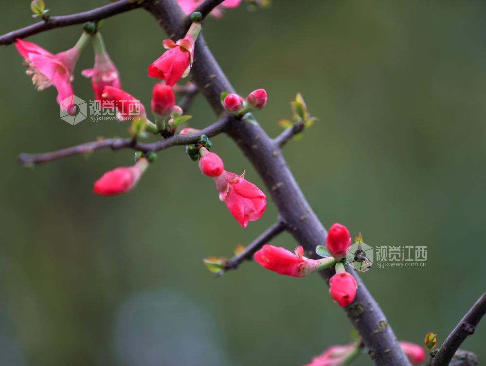 春雨凝寒冷未消,贴梗海棠竞妖娆。2024年2月26日,在江西省分宜县钤山湖生态湿地公园里,数十株贴梗海棠绽放出绚烂的“中国红”。贴梗海棠花梗极短,花朵紧贴在枝干上,火红色的海棠花鲜润丰腴、绚烂耀目。那一簇簇、红彤彤的花朵,美不胜收,吸引着市民的目光。