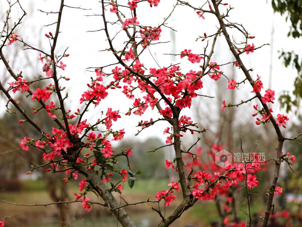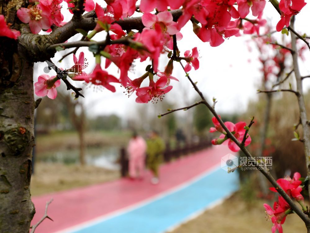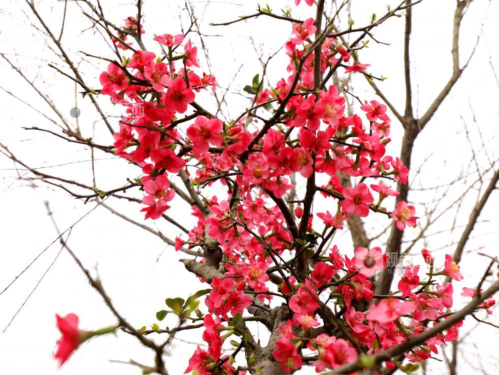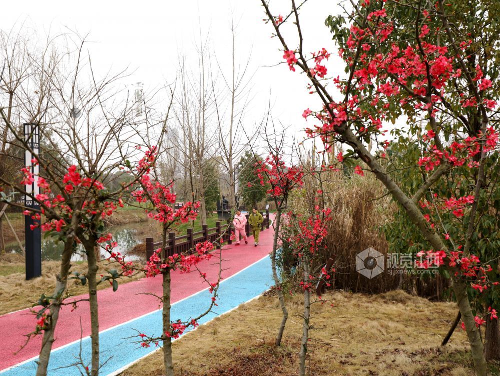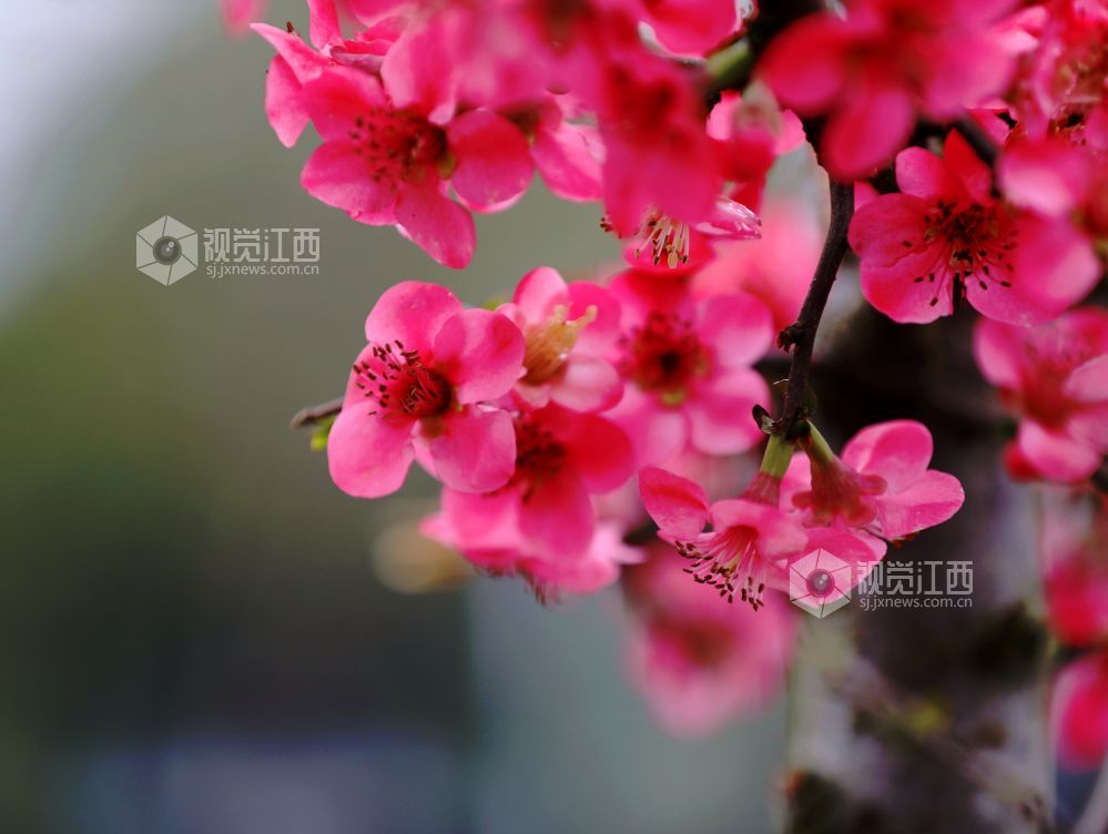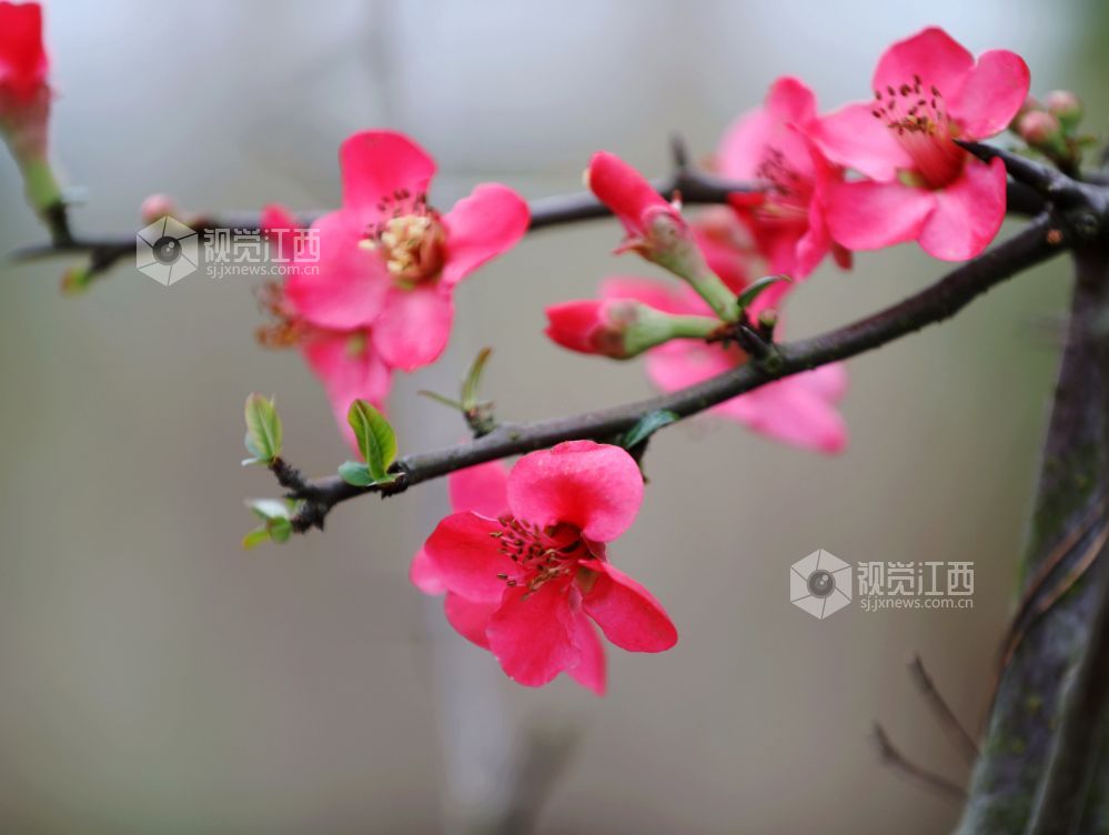春雨凝寒冷未消,贴梗海棠竞妖娆。2024年2月26日,在江西省分宜县钤山湖生态湿地公园里,数十株贴梗海棠绽放出绚烂的“中国红”。贴梗海棠花梗极短,花朵紧贴在枝干上,火红色的海棠花鲜润丰腴、绚烂耀目。那一簇簇、红彤彤的花朵,美不胜收,吸引着市民的目光。
