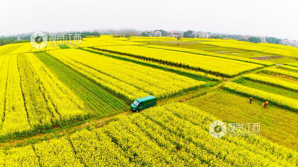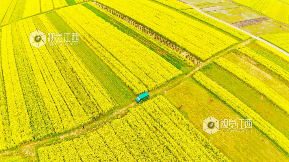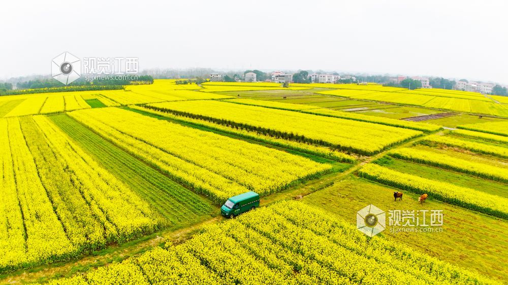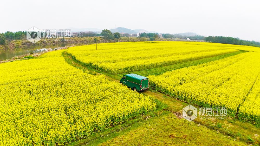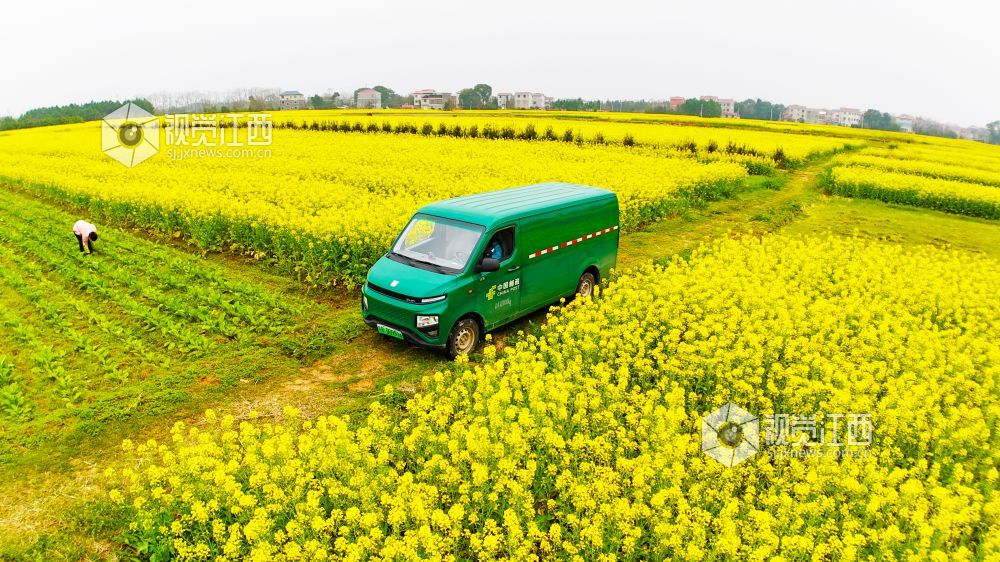 春回大地,万物生长。3月2日,在江西省泰和县马市镇武溪街村,一片片油菜花竞相绽放,把乡村田野装扮得一片金黄。一辆绿色的邮政投递车徜徉在这金色的“海洋”中,显得格外耀眼。铺满田野的油菜花,粉墙黛瓦的房屋,金色“海洋”中的“邮政绿”,与远处的山峦相映成趣,构成了一幅美丽绝伦的乡村美景。
