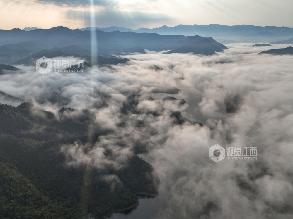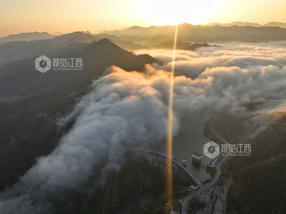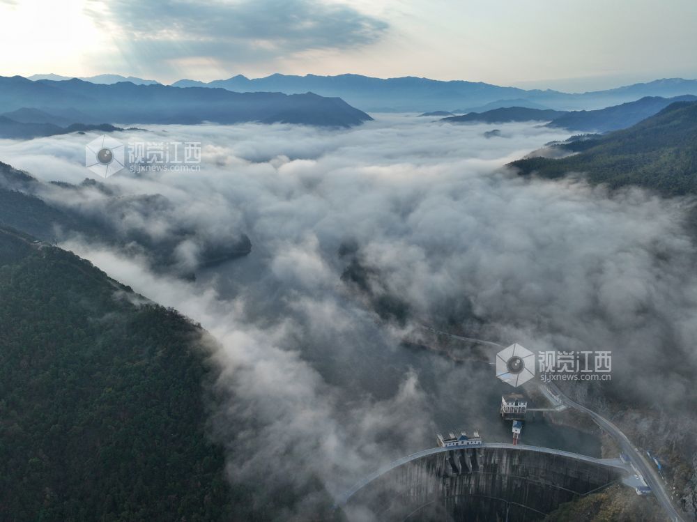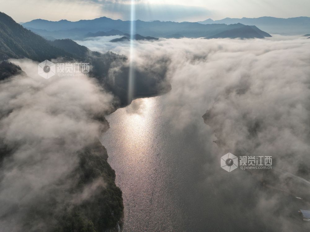 2024年3月3日,航拍江西省萍乡市芦溪县山口岩水库,云雾缭绕,朝霞映江水,宛如仙境,美不胜收。