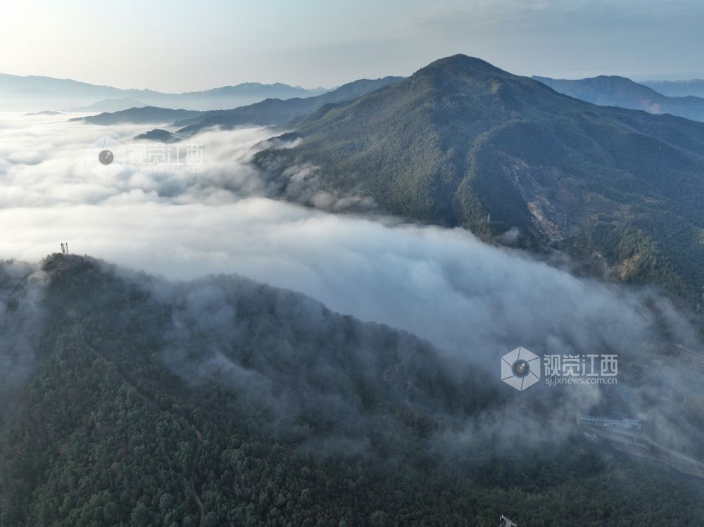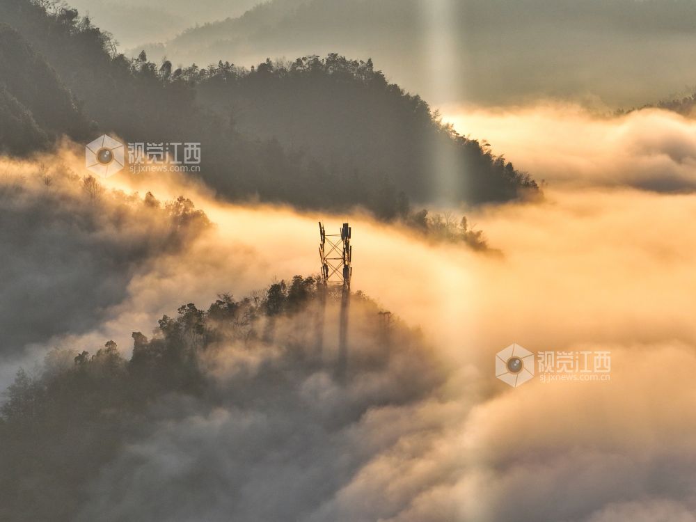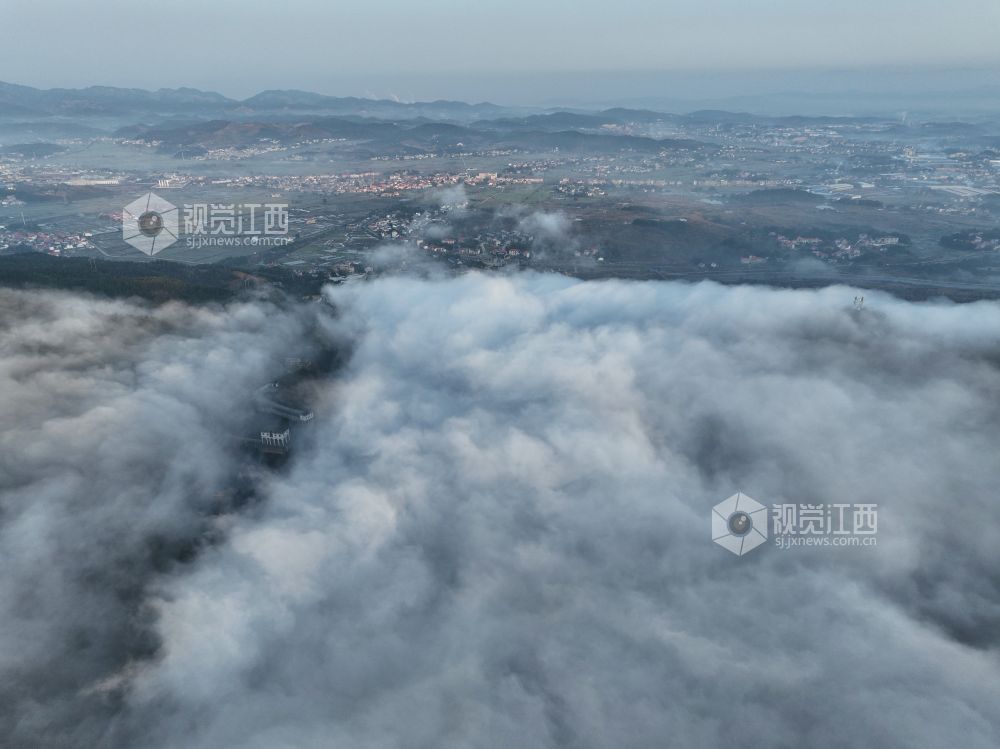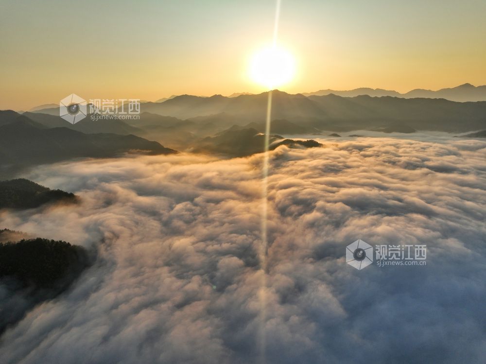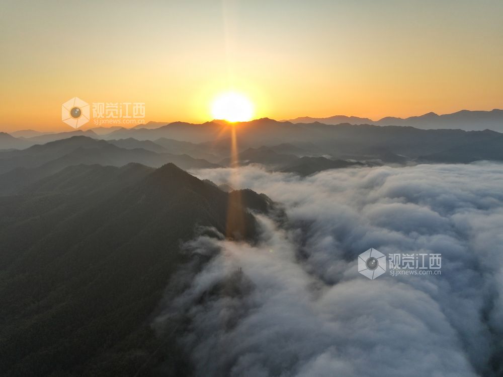 2024年3月3日,航拍江西省萍乡市芦溪县山口岩水库,云雾缭绕,朝霞映江水,宛如仙境,美不胜收。