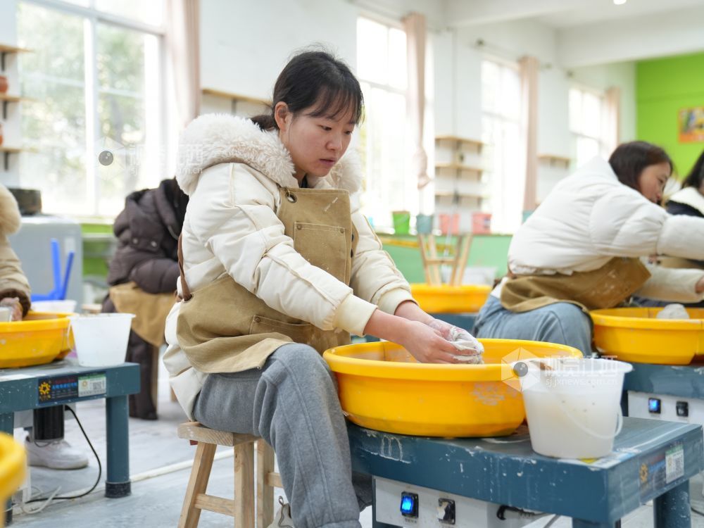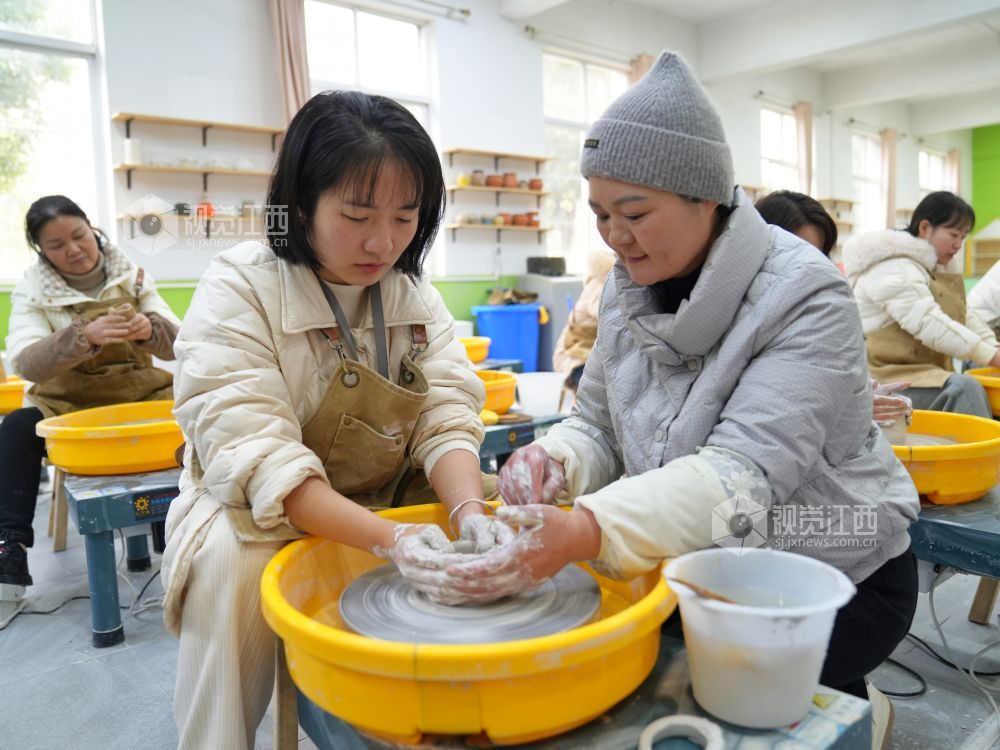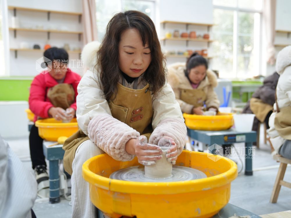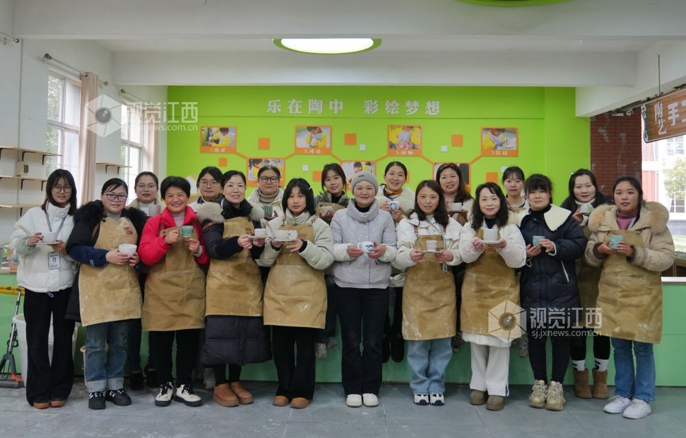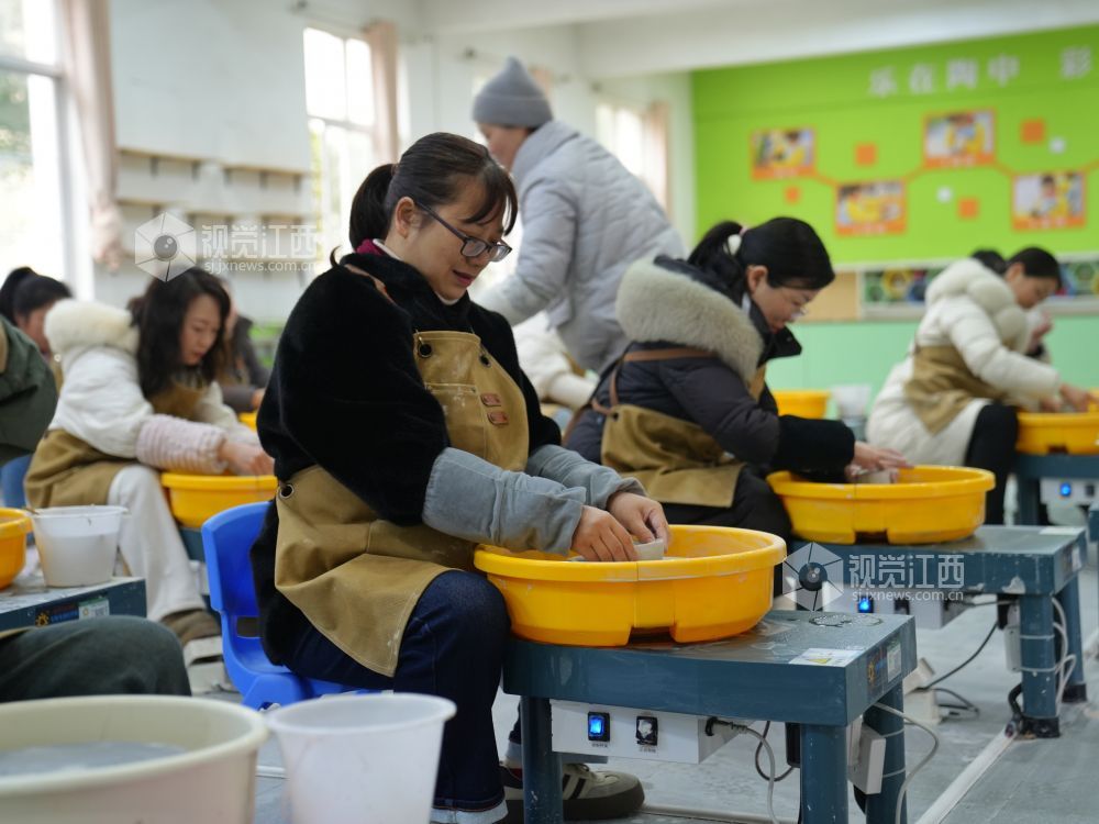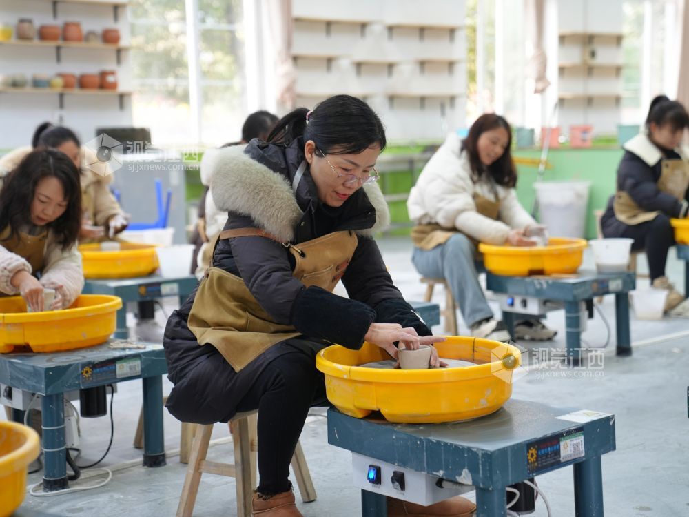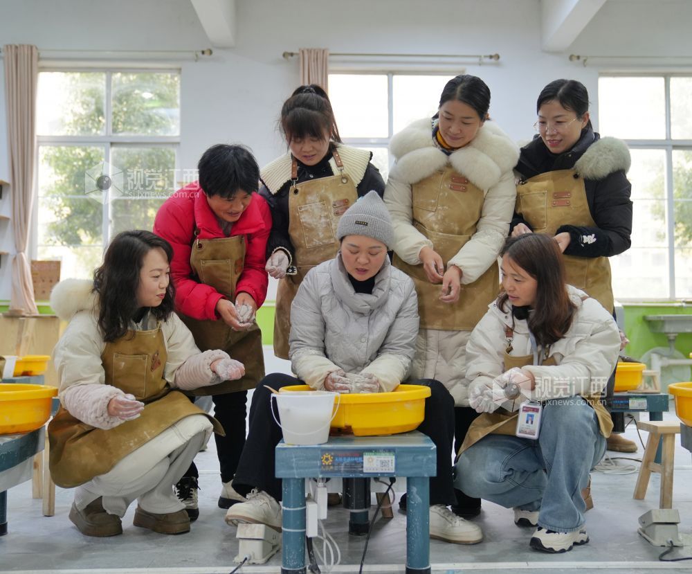 女教师们在非遗陶艺技能人才的指导下,学习非遗陶艺的制作技艺,以独特的方式迎接自己的节日。