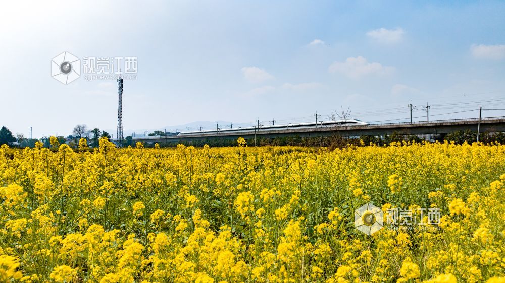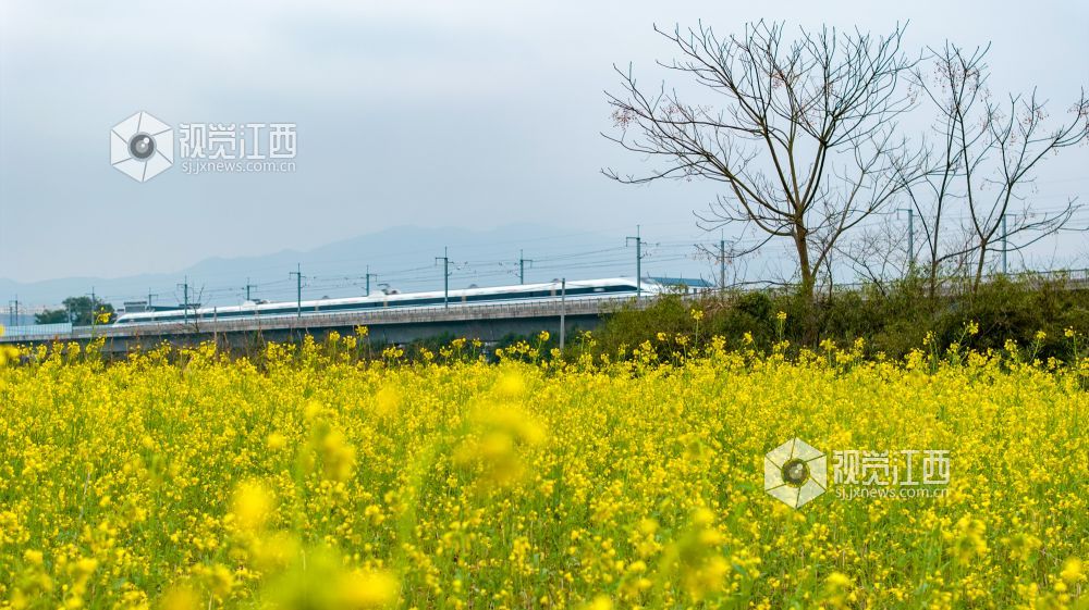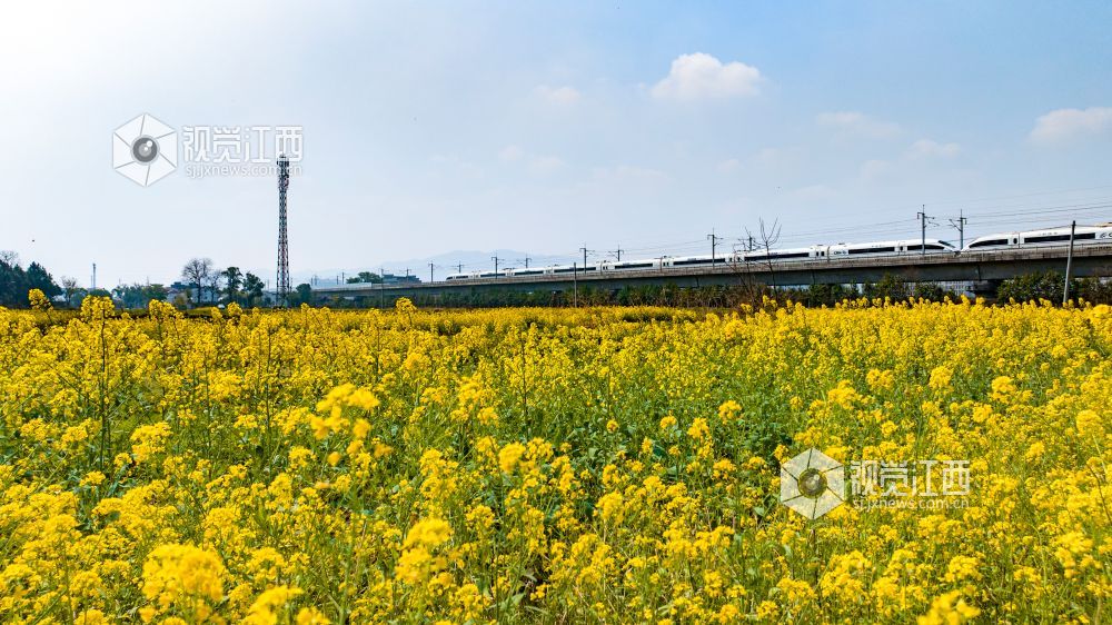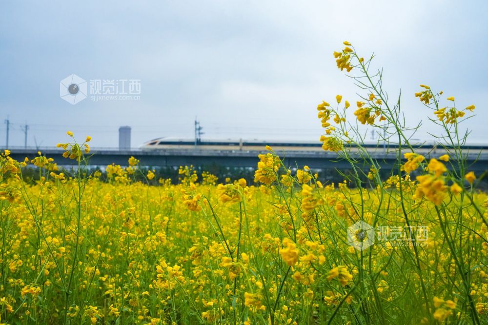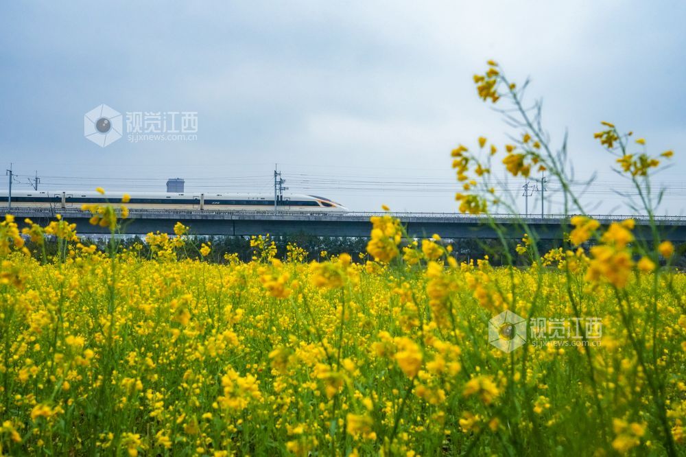 近日,江西省吉安市峡江县水边镇的油菜花竞相开放,金黄色的花海装点着向昌赣高铁沿线,成片的花海随着微风轻轻翻动,在阳光下金光闪闪,高铁来回穿梭于盛开的油菜花田,呈现出一幅迷人的金色画卷。