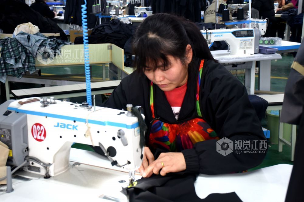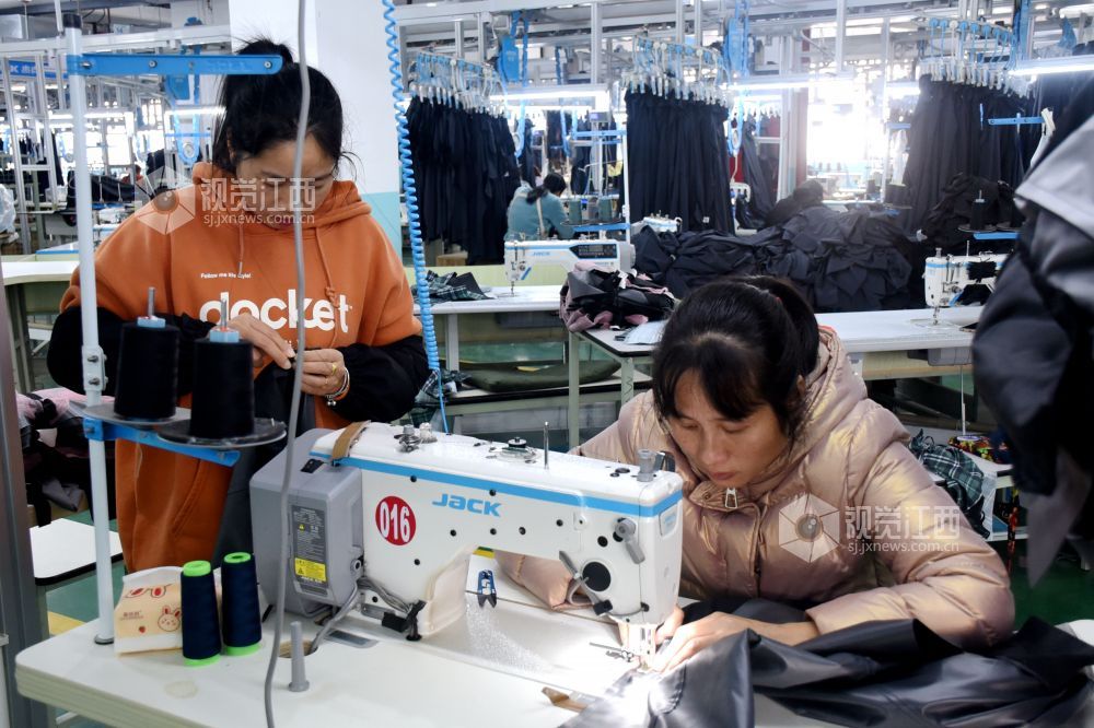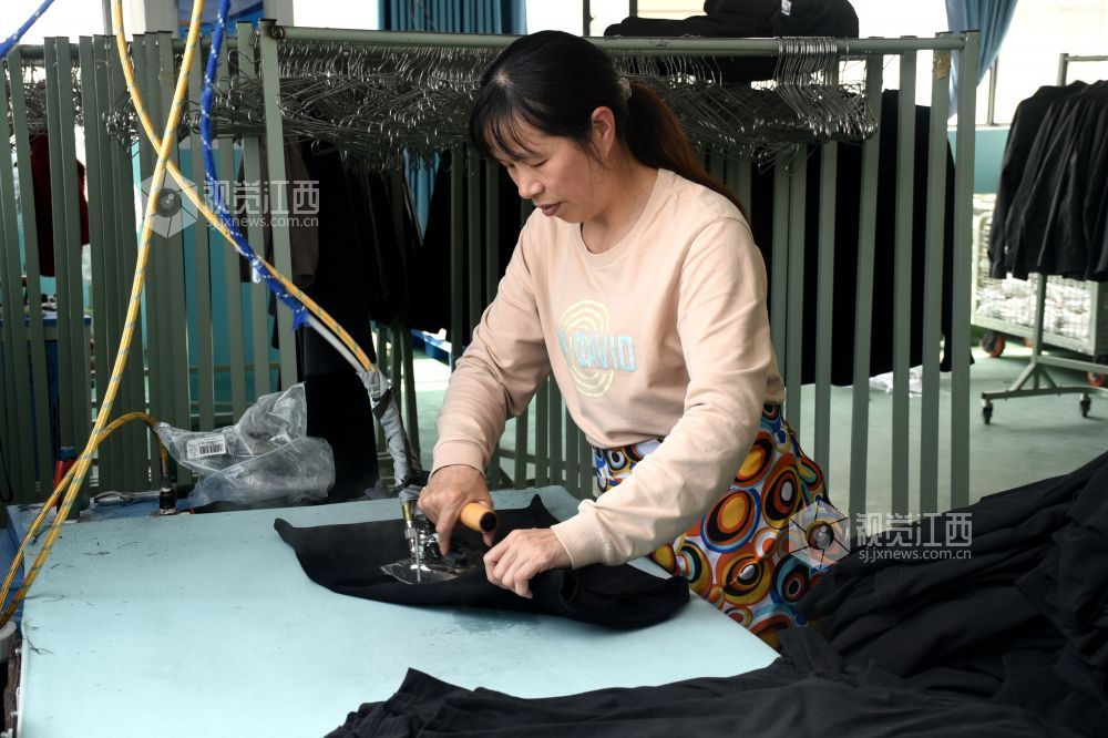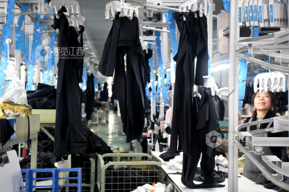 2024年3月8日,在江西省抚州市南丰县黄金工业园的一公司生产车间内,工人正在智能吊挂流水线上加工生产出口服装,准备销往欧美,奋力实现首季“开门红”。