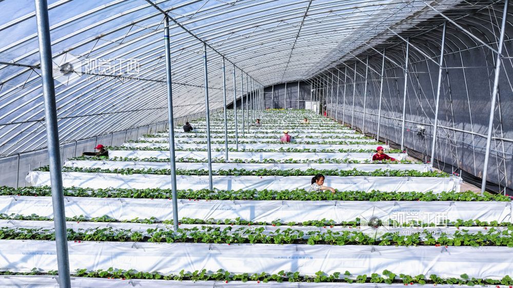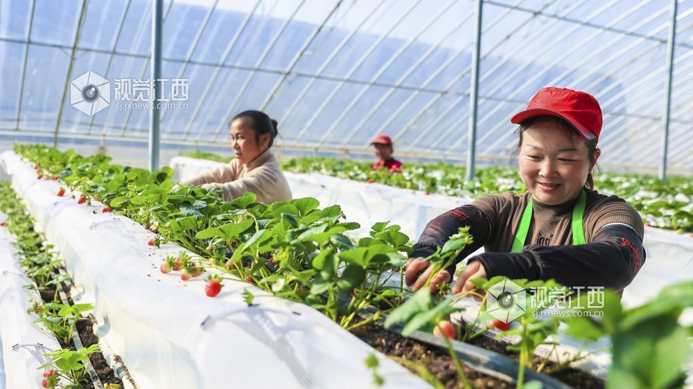 2024年3月12日,江西省瑞昌市农发公司茂源智慧农业蔬菜基地温控大棚内,工人们正在管护无土栽培的草莓。