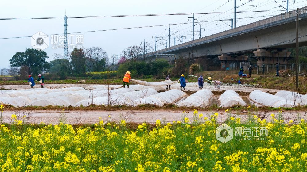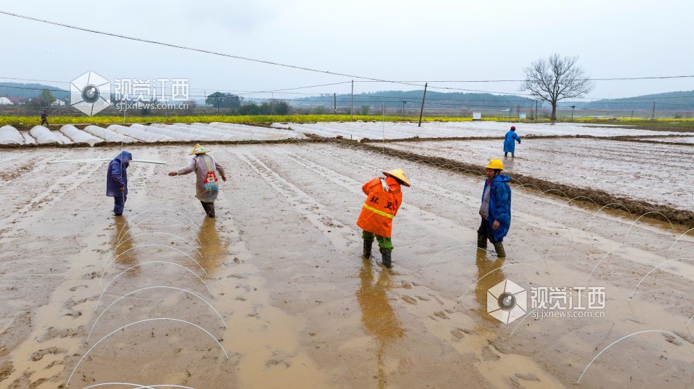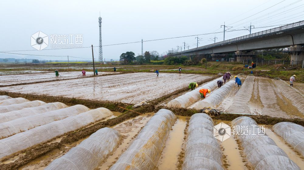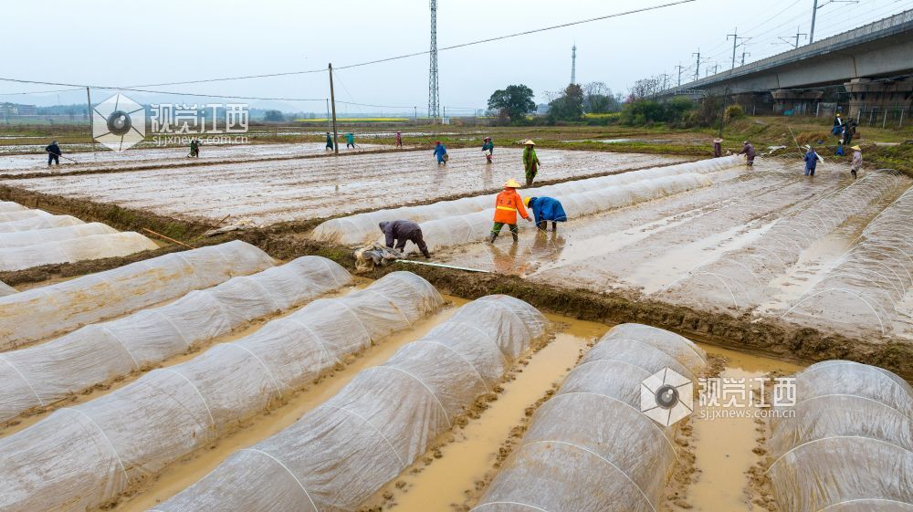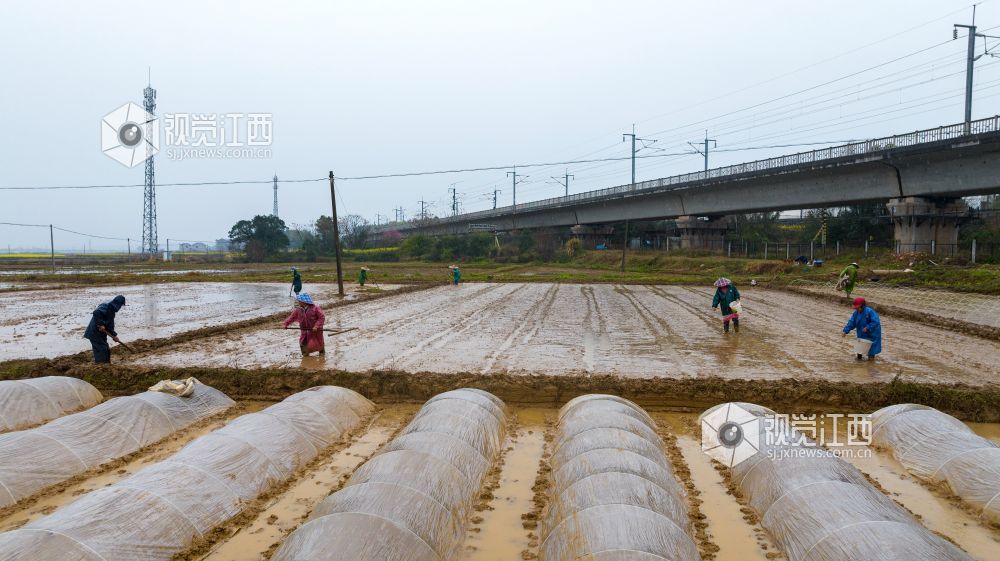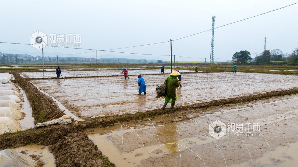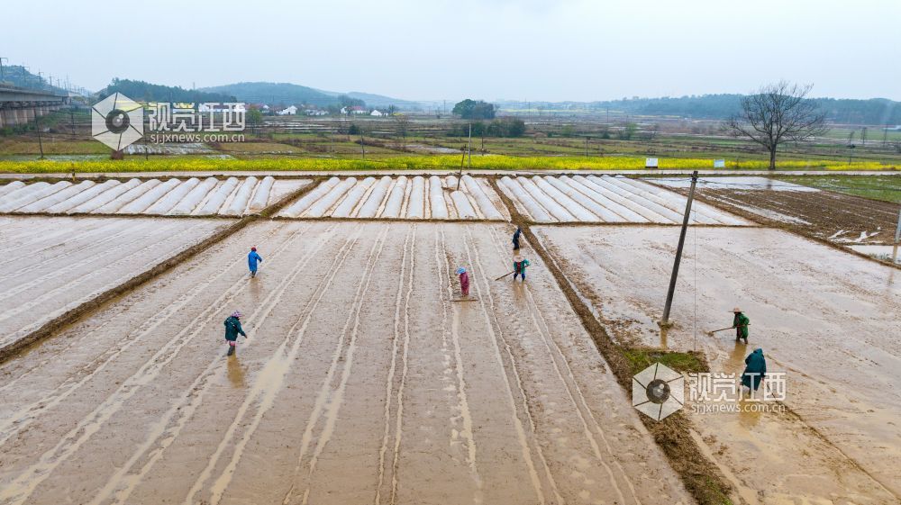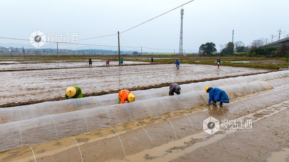 2024年3月14日,江西省吉安市吉水县金滩镇前进村,村民正在早稻秧田中平地、播种、覆膜,田间地头一片忙碌。