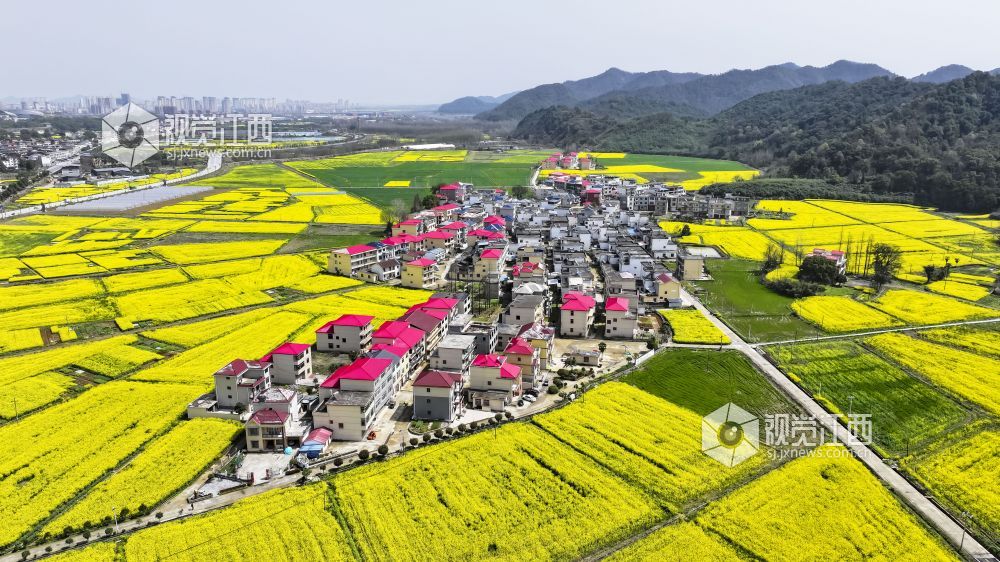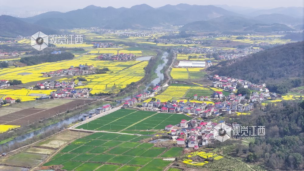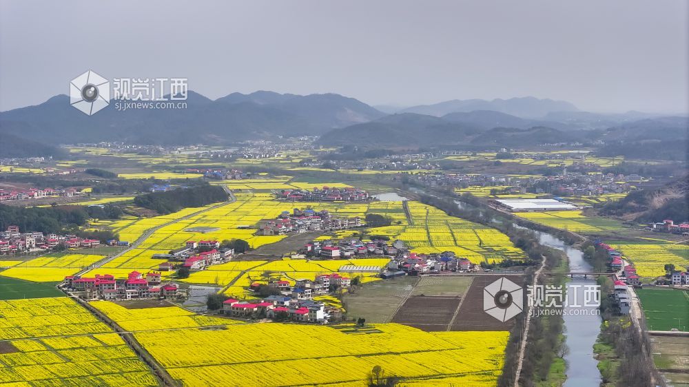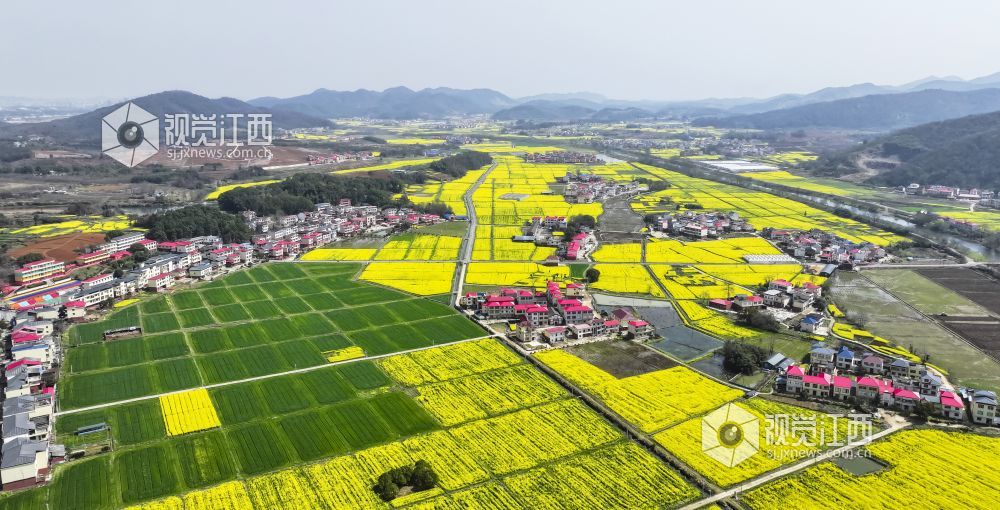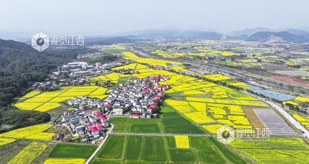 2024年3月19日,俯瞰江西省瑞昌市桂林街道,满地金黄的油菜花与村庄、河流、青山等相互映衬,构成一幅美丽的春日乡村画卷。