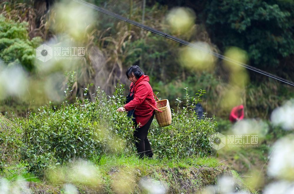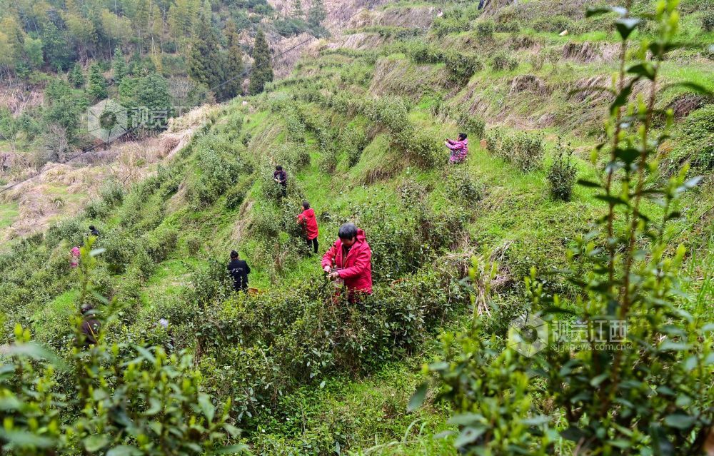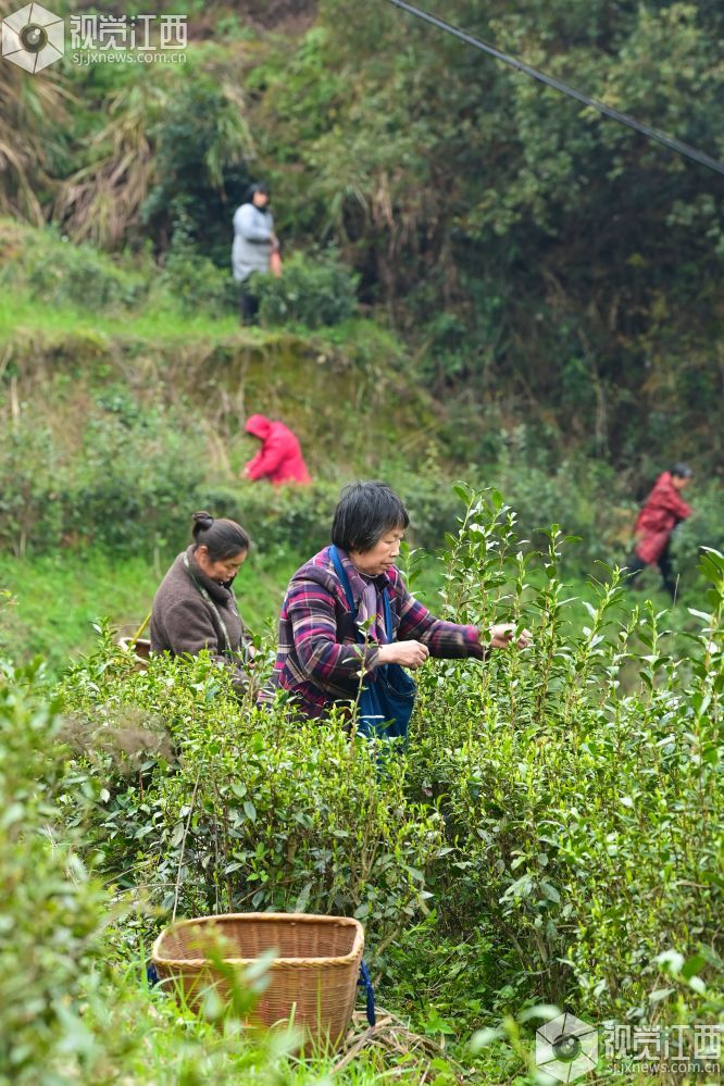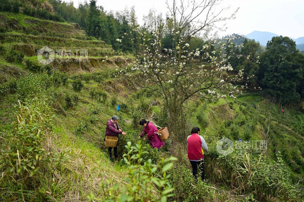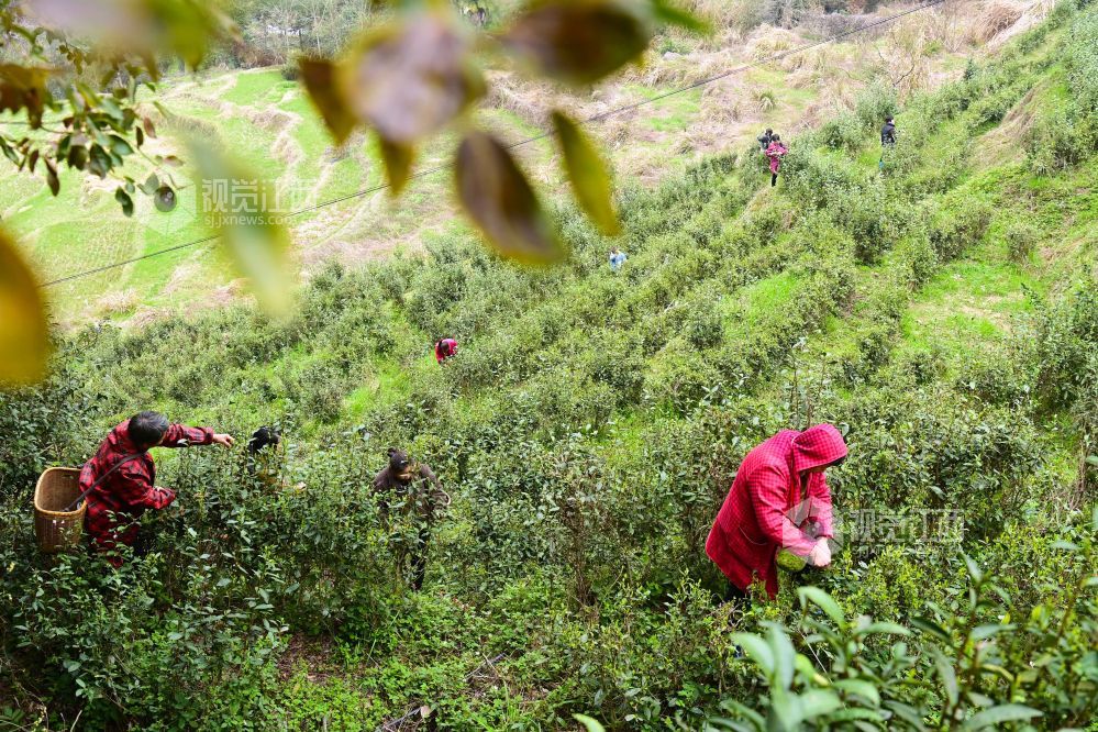 2024年3月21日,江西省宜春市万载县茭湖乡上峰村的高山茶园,村民正在采摘春茶。
