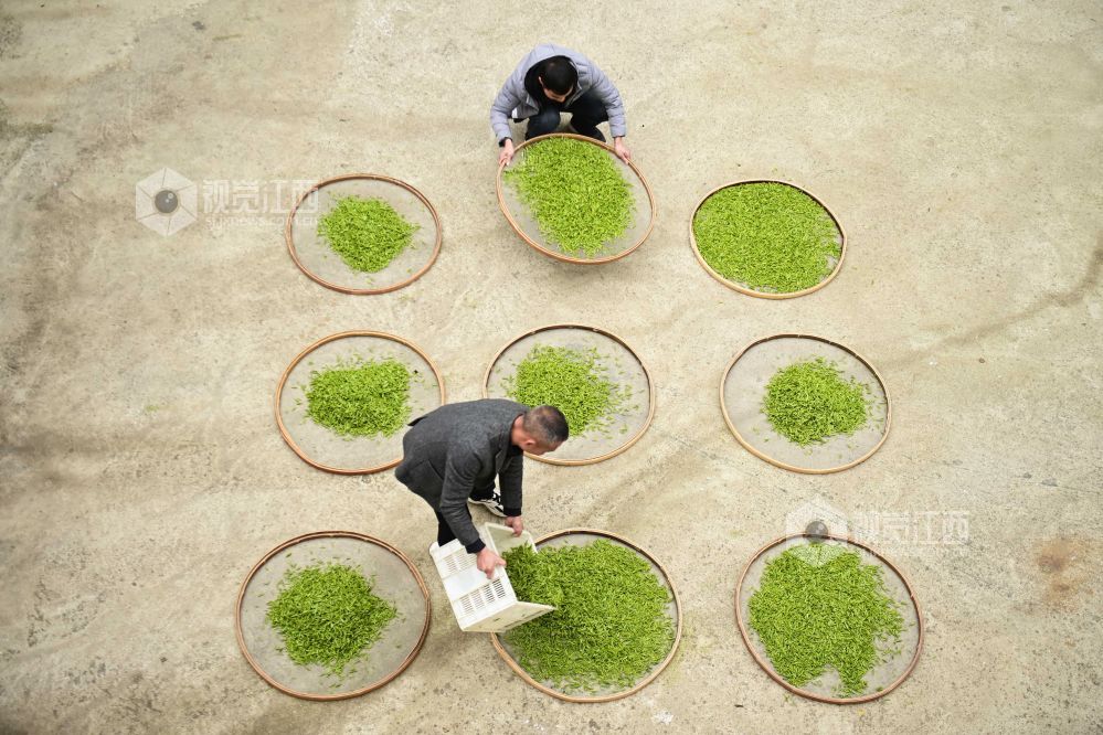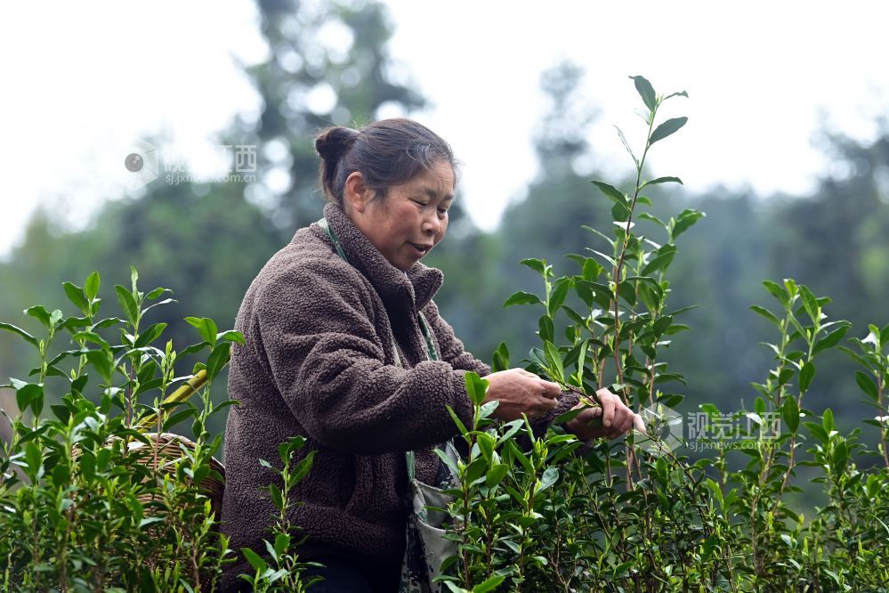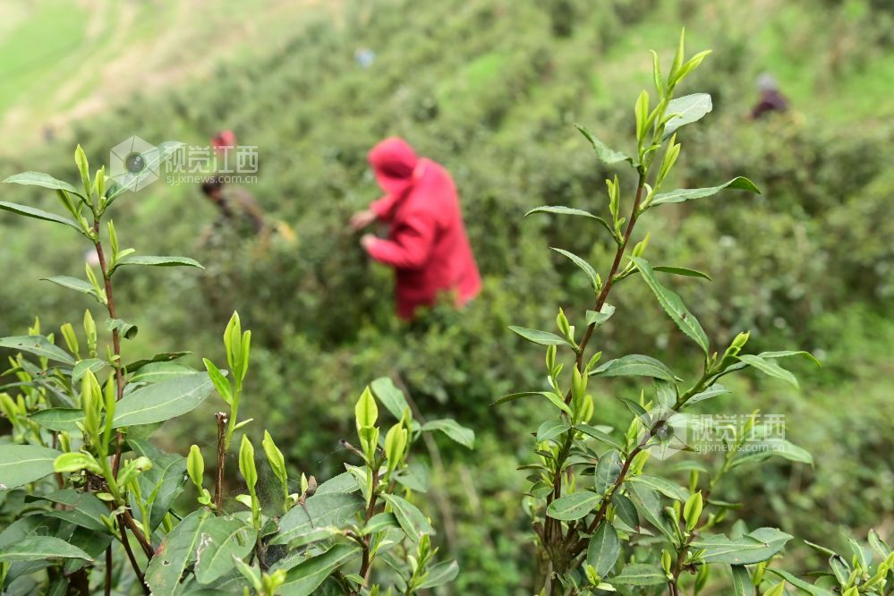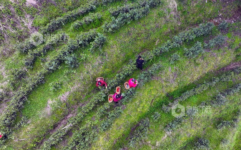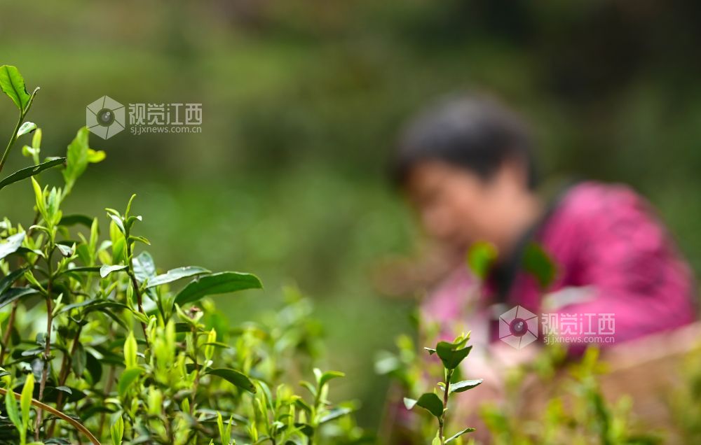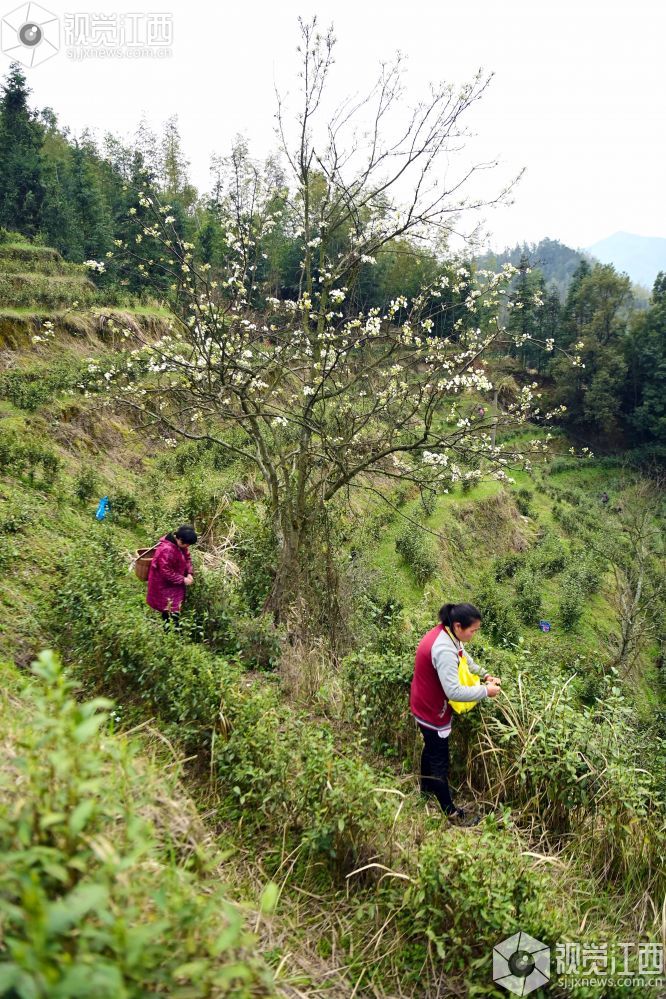 2024年3月21日,江西省宜春市万载县茭湖乡上峰村的高山茶园,村民正在采摘春茶。