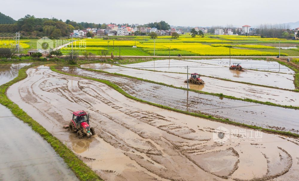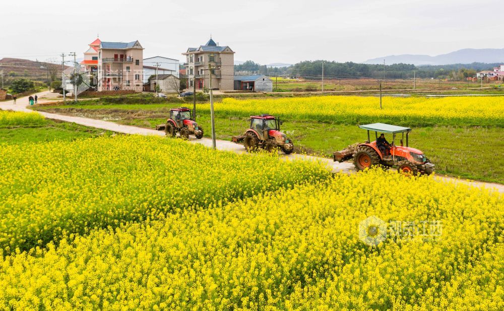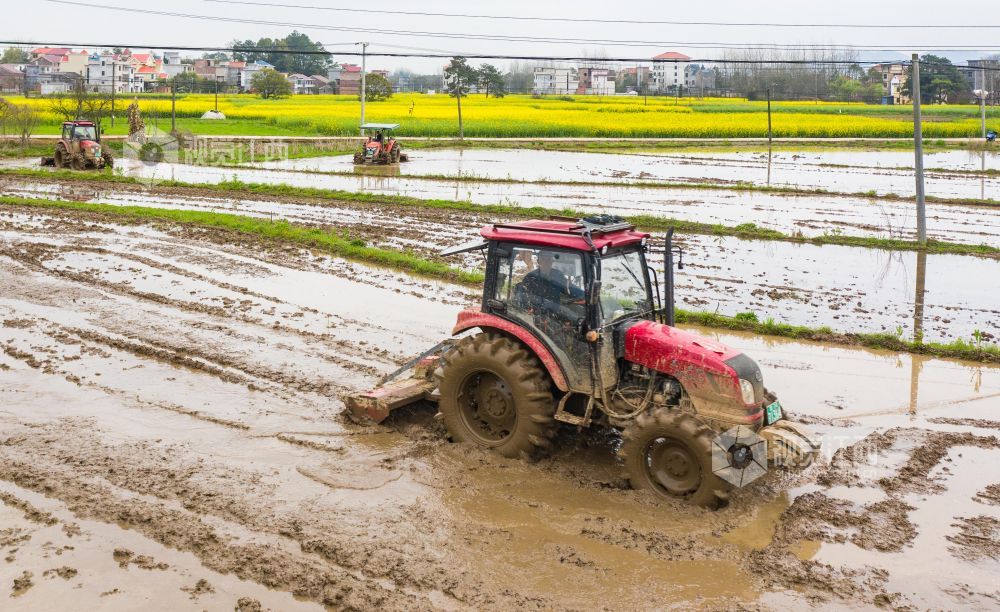 3月21日,江西省永新县沙市镇涂下垅村的田野里机声轰鸣,该村运程农机服务专业合作社的农机手正驾驶农机翻耕稻田。