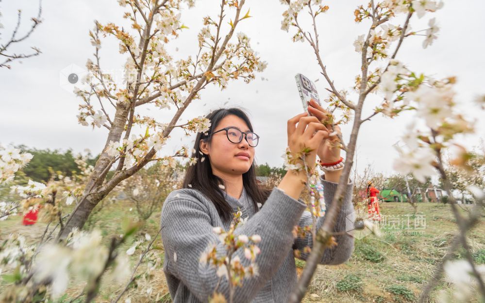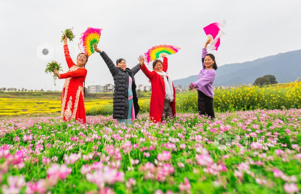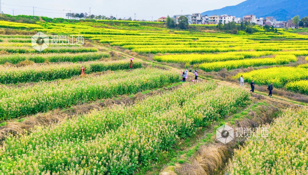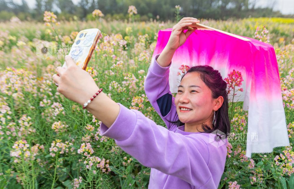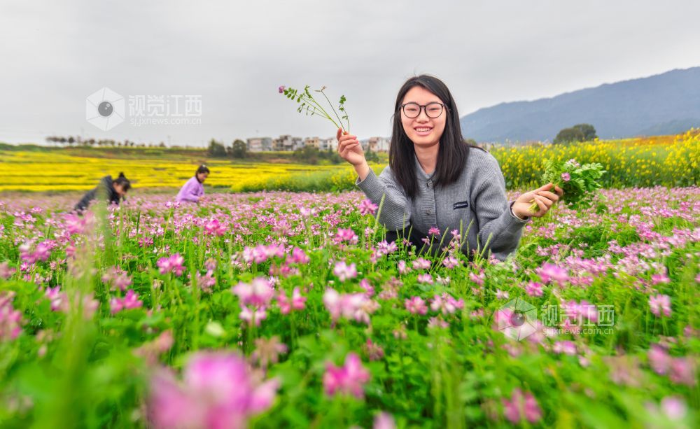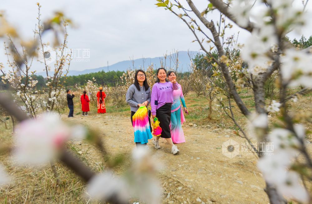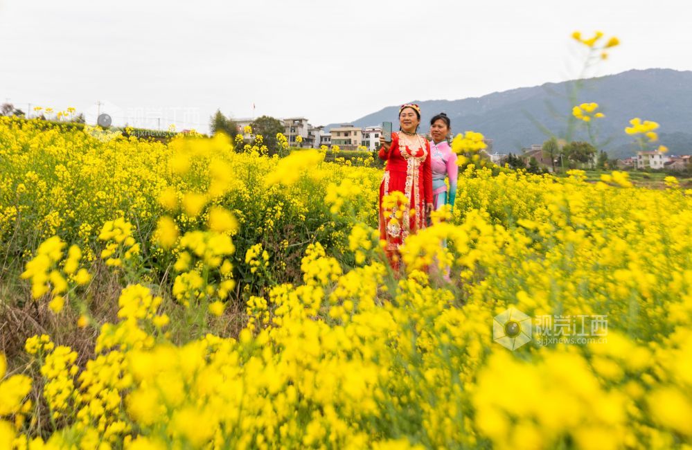 3月21日,游客在江西省永新县台岭乡程佳村的田野上赏花、拍照、游玩。春风和煦,该乡各个村庄的紫云英、樱桃花、油菜花等春花竞相绽放,美不胜收,乐享春日美好时光。