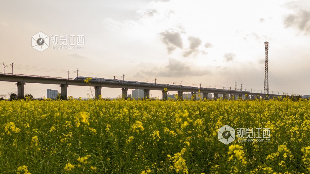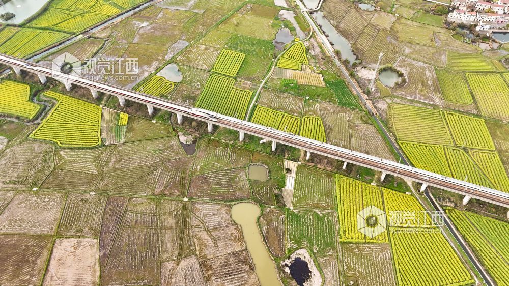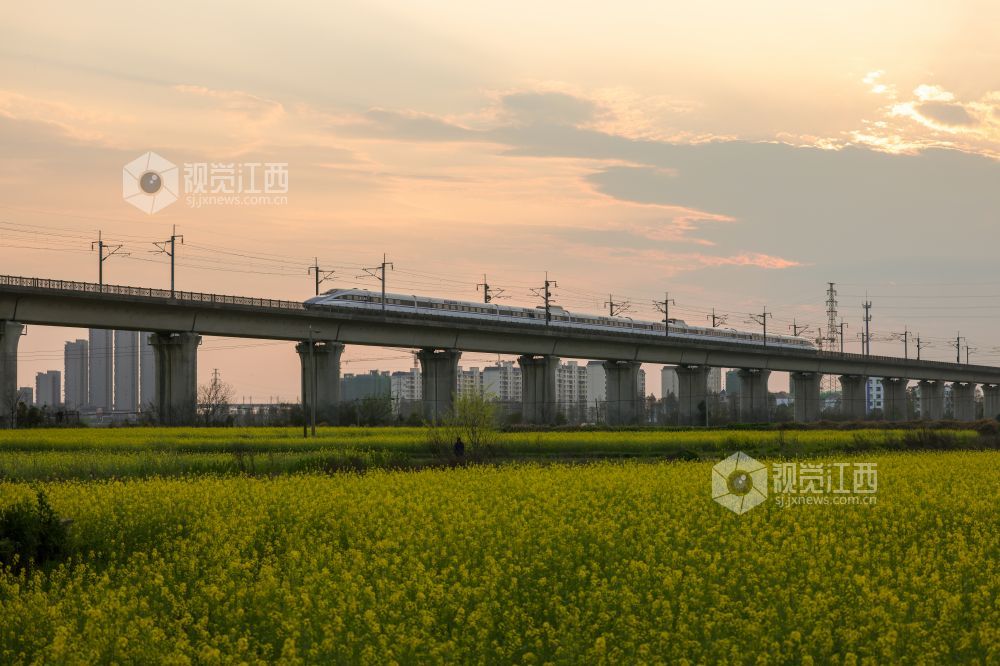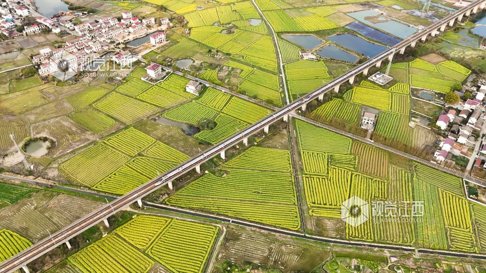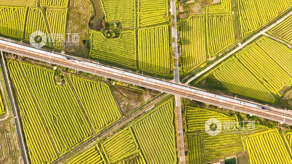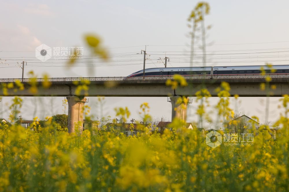 阳光明媚,春意盎然。2024年3月24日,位于江西省南昌市南昌县向塘镇一带,沪昆高铁沿线的油菜花竞相绽放。一列列高铁载着南来北往的旅客驰骋在铁道线上,摇曳的花朵与飞驰的高铁绘就出一幅动人的春日画卷,沿途风景美不胜收。