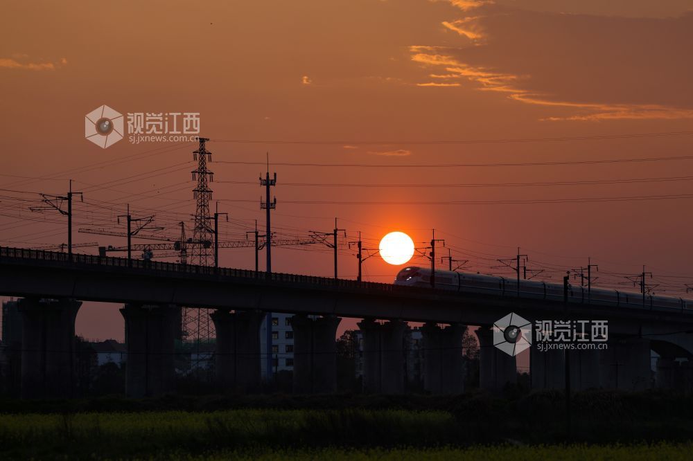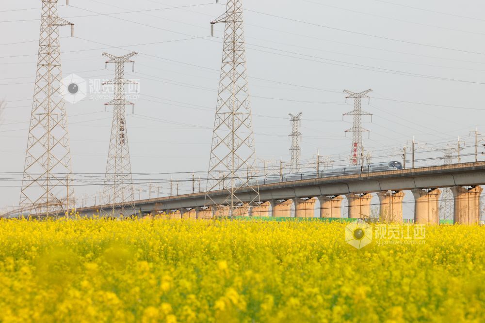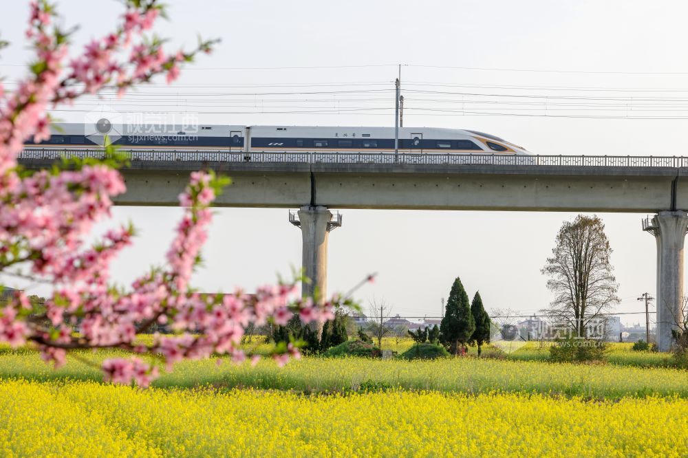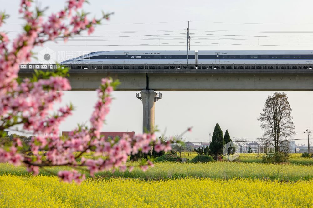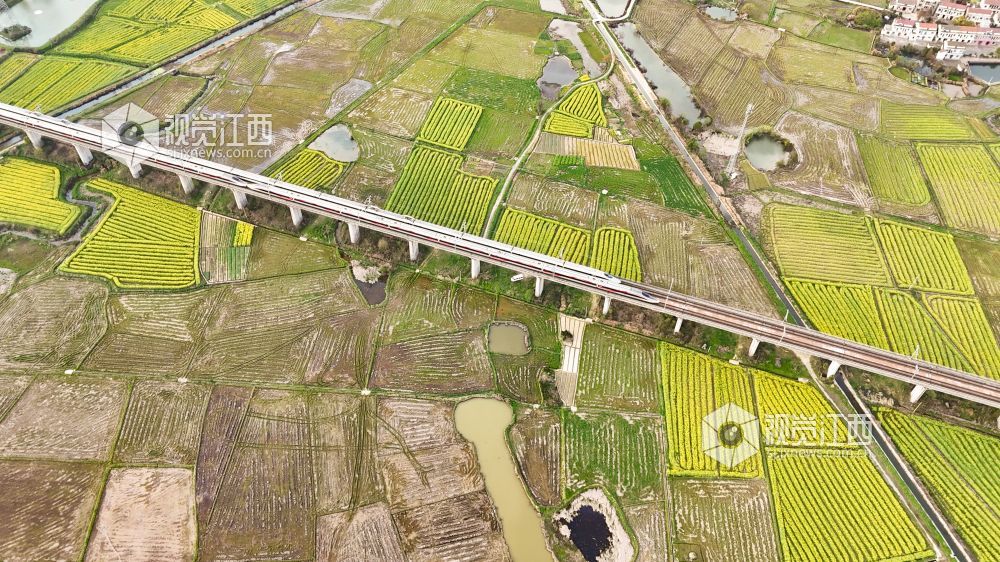 阳光明媚,春意盎然。2024年3月24日,位于江西省南昌市南昌县向塘镇一带,沪昆高铁沿线的油菜花竞相绽放。一列列高铁载着南来北往的旅客驰骋在铁道线上,摇曳的花朵与飞驰的高铁绘就出一幅动人的春日画卷,沿途风景美不胜收。