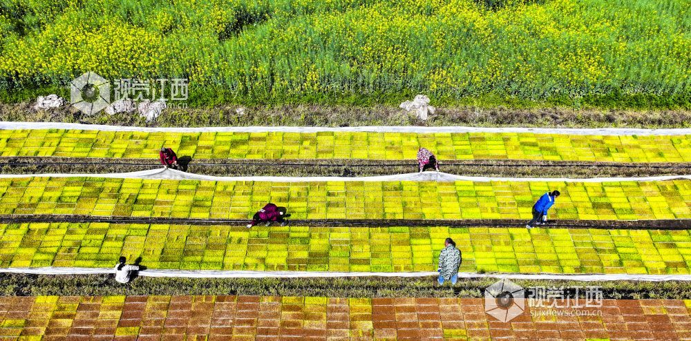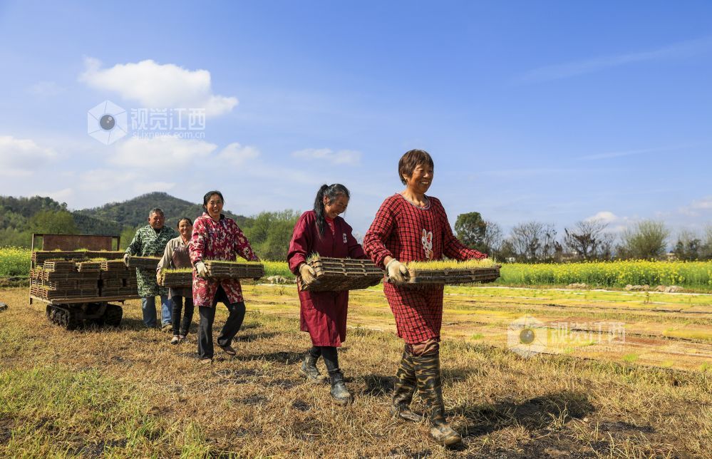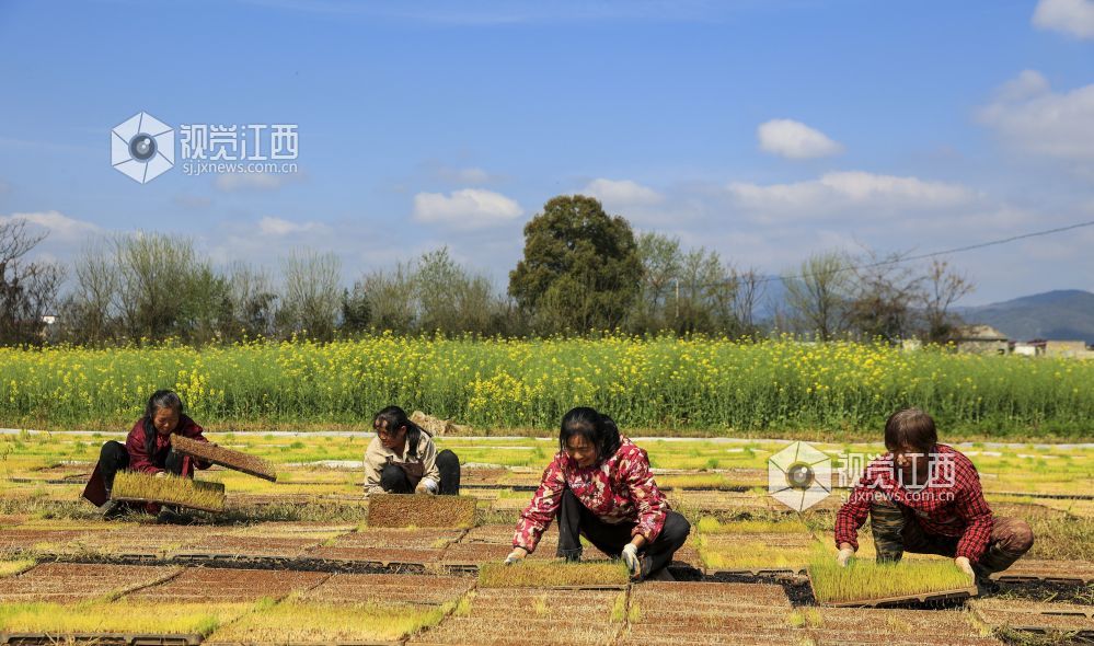 2024年3月26日,江西省瑞昌市范镇良田村,村民正在稻田内移放早稻秧盘。