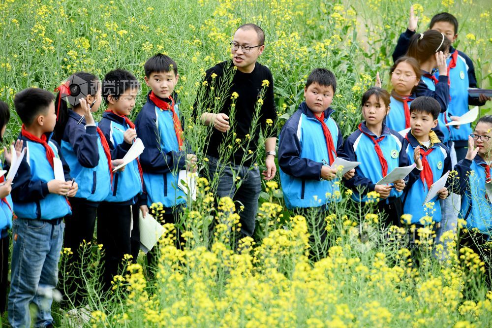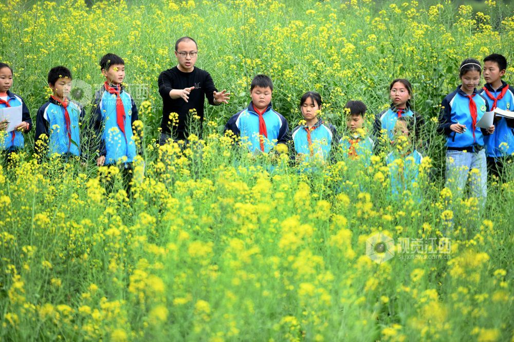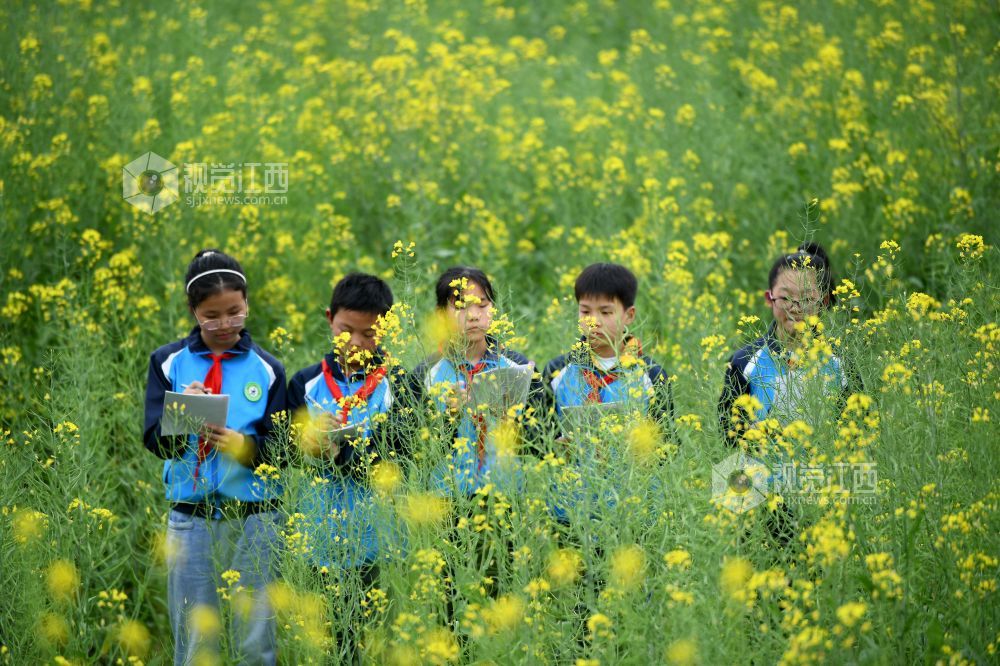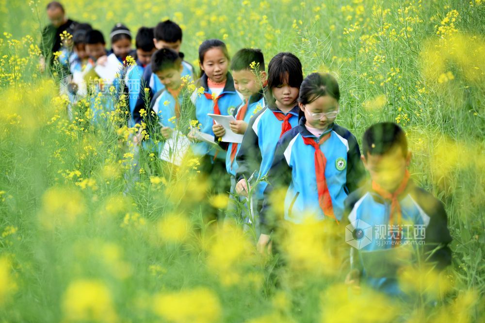 2024年4月1日,江西省婺源县太白中心小学的学生在老师的带领下,来到当地农家油菜花田里,感悟美丽春色,描绘田园风光。