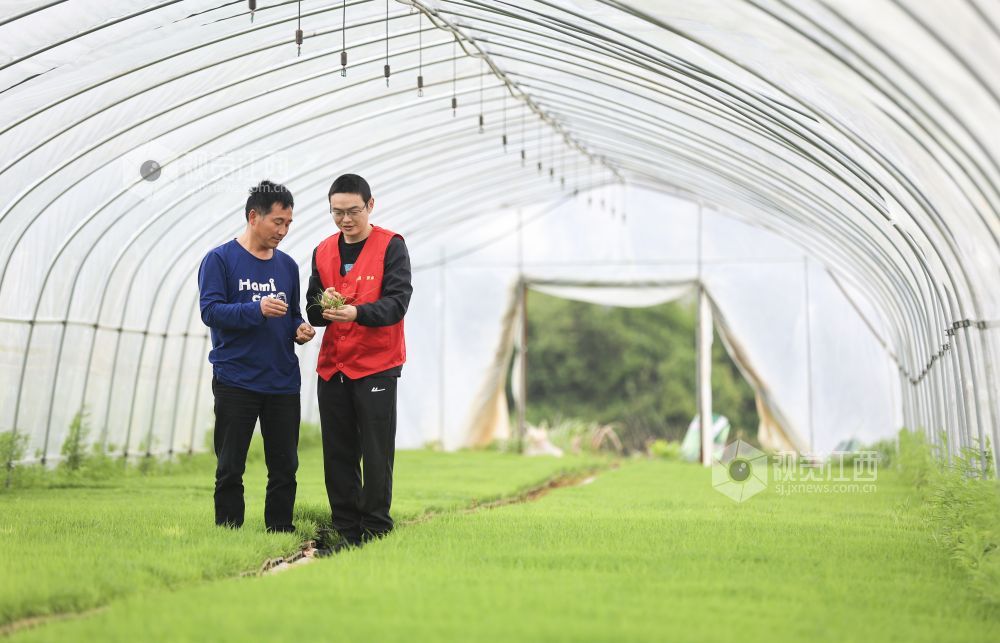 2024年4月4日,江西省瑞昌市黄金乡昌新水稻集中育秧中心,党员农技服务人员正指导农户管护水稻秧苗。