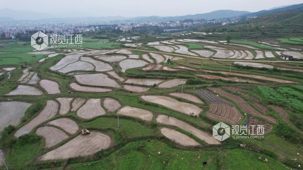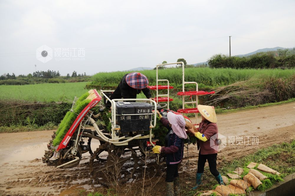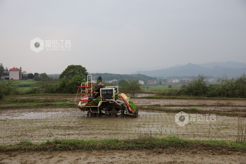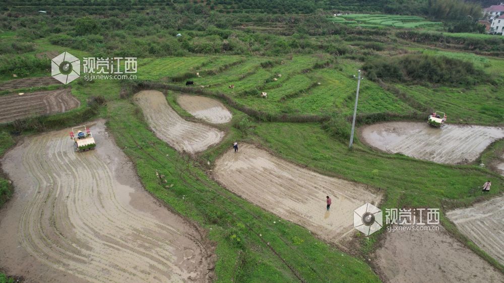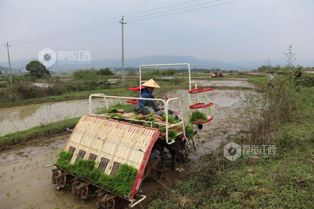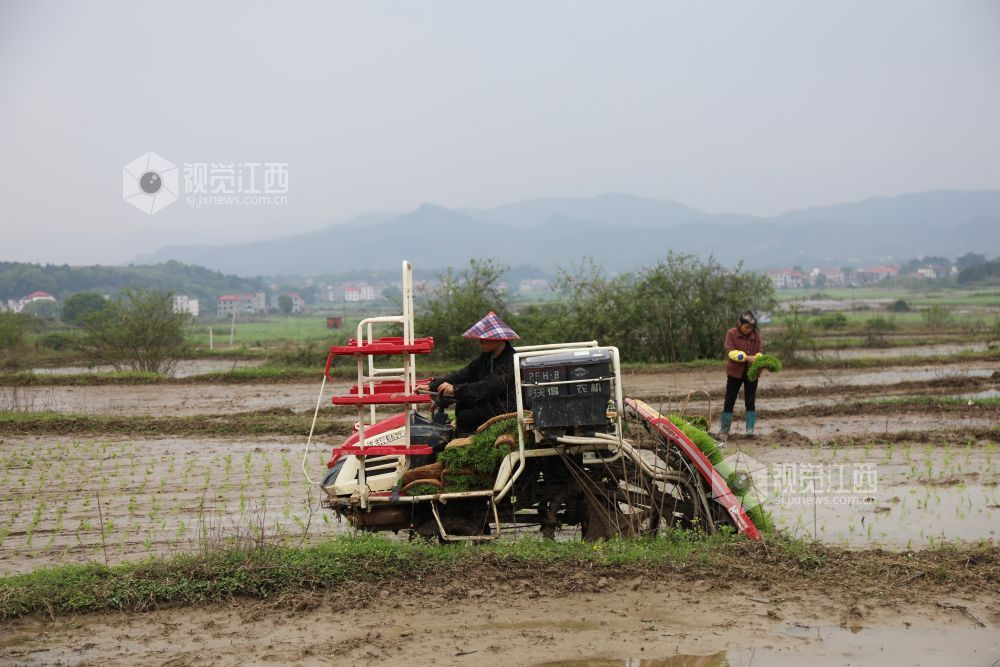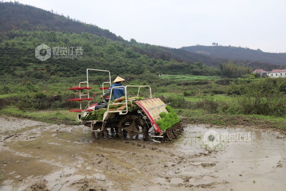 4月8日,在江西省莲花县良坊镇井一村杨梅垄,农机手驾驶插秧机在不规则的梯田里来回穿梭, 插秧机过后,稻田里一行行秧苗整齐挺立,在插秧机不能到达的边角田块,村民则立即通过抛秧补上了秧苗,很快稻田就铺上了一层淡淡的绿装。