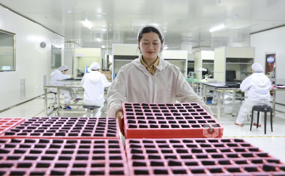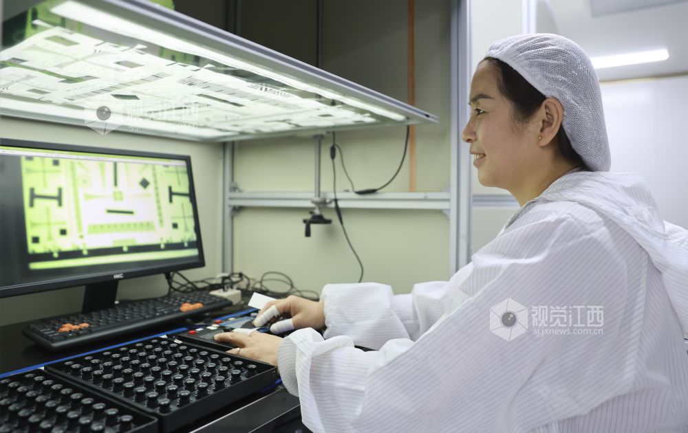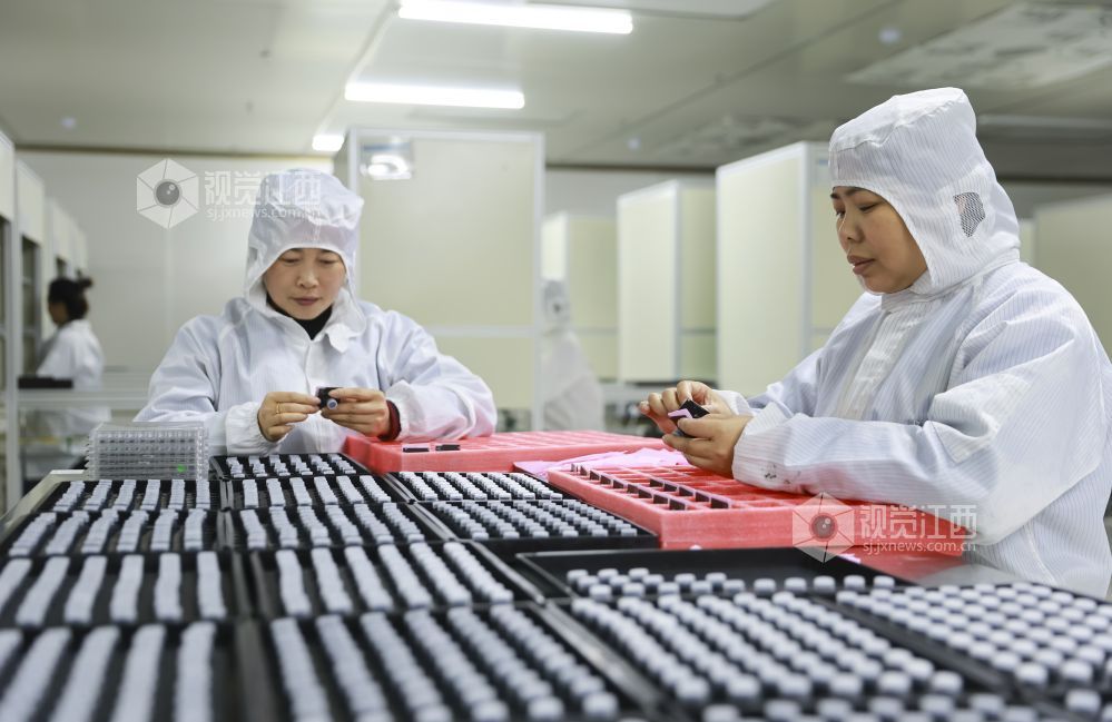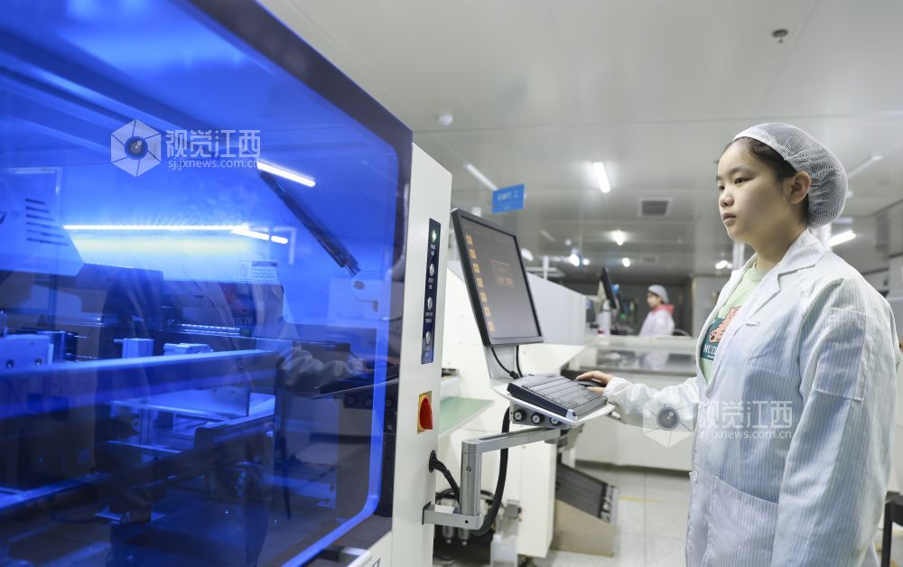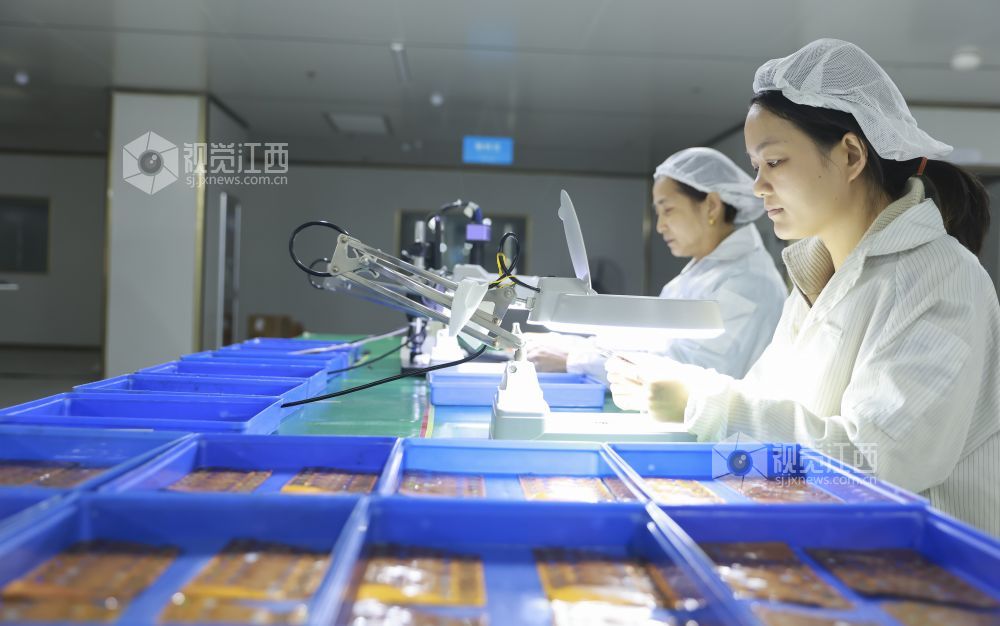 2024年4月9日,江西省瑞昌经开区科技园江西瑞欣影像智能科技有限公司车间内,工人们正在生产线上赶制国内外订单。