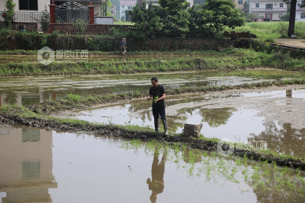 4月15日,江西省莲花县升坊镇沙屋村,趁着晴好天气,农机手驾驶插秧机在稻田里来回穿梭,为稻田披上了一层淡淡的“绿装”。在田块比较小的地方,村民采取抛秧的方式,让稻田染上一片新绿。