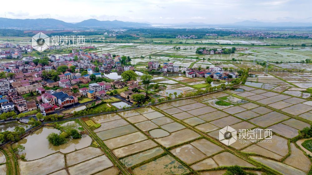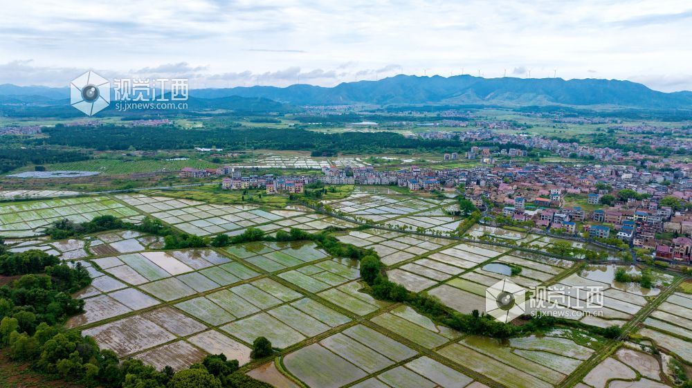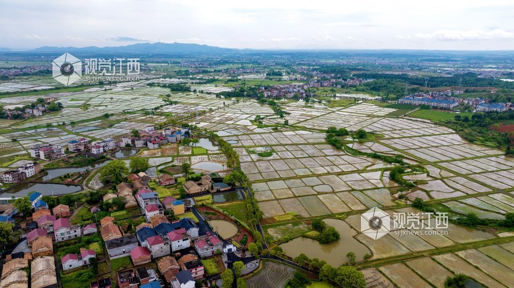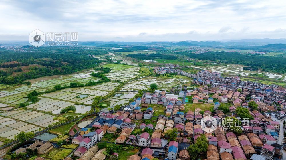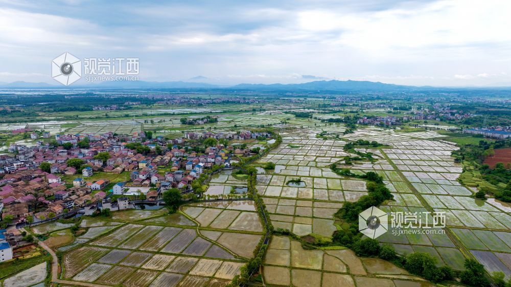 2024年4月17日,俯瞰江西省吉安市吉水县盘谷镇上曾家村,水田如镜、阡陌纵横,古朴雅致的古村民居和如黛的远山交相辉映,构成一幅如诗的田园春景水墨画。