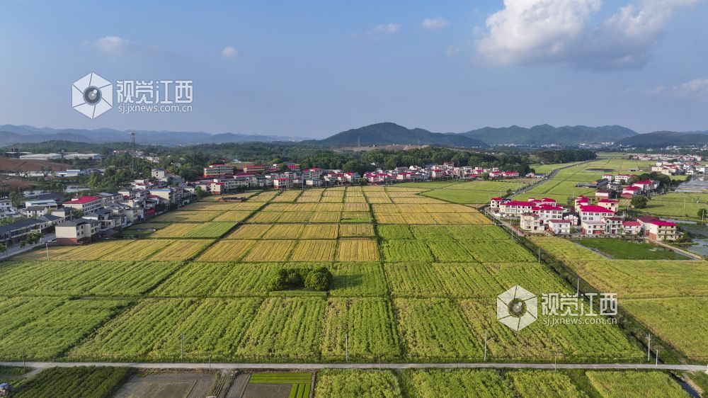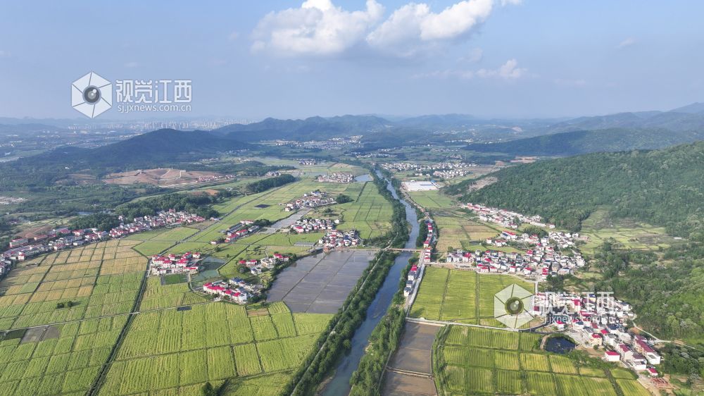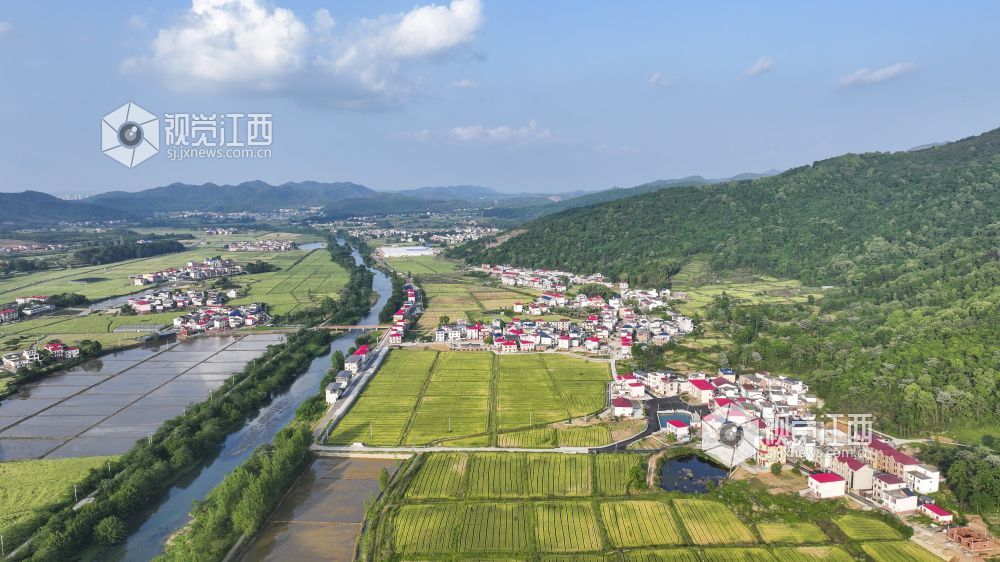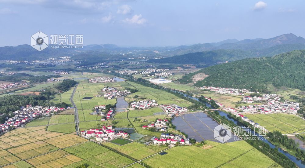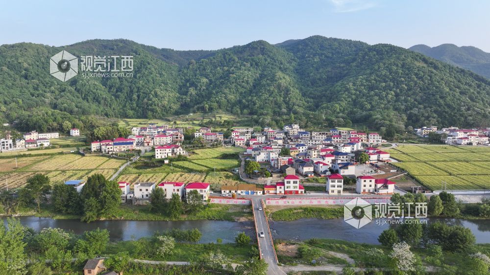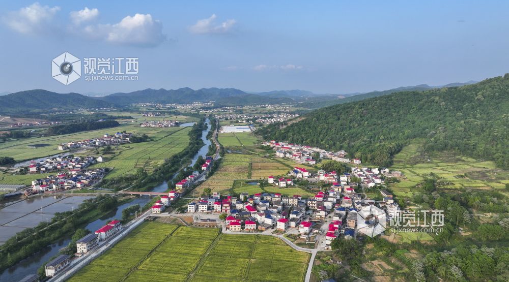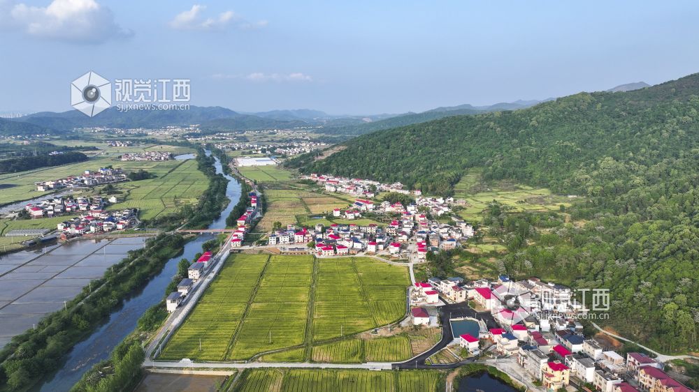 2024年4月26日,俯瞰江西省瑞昌市桂林街道,阡陌纵横的农田、层峦叠翠的青山及错落有致的民居等相互映衬,勾勒出一幅和谐秀美的乡村生态画卷。