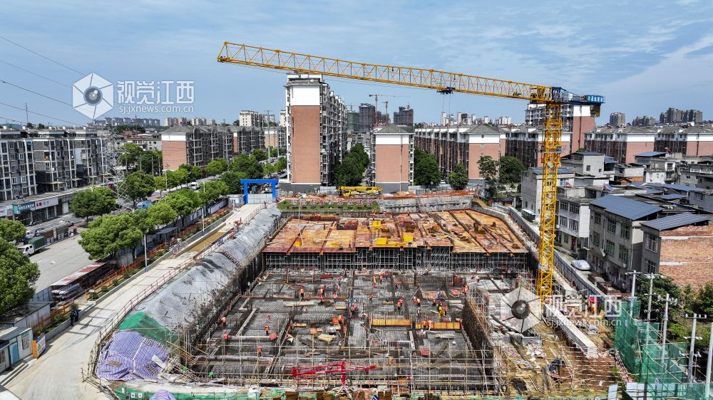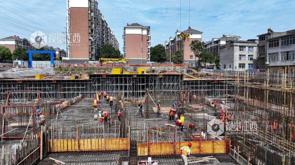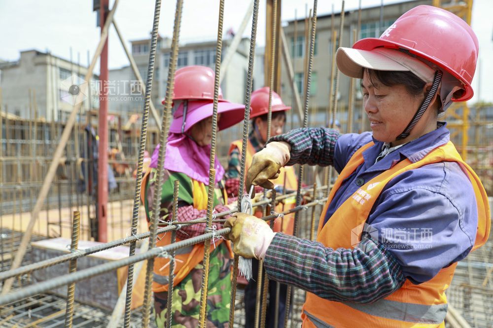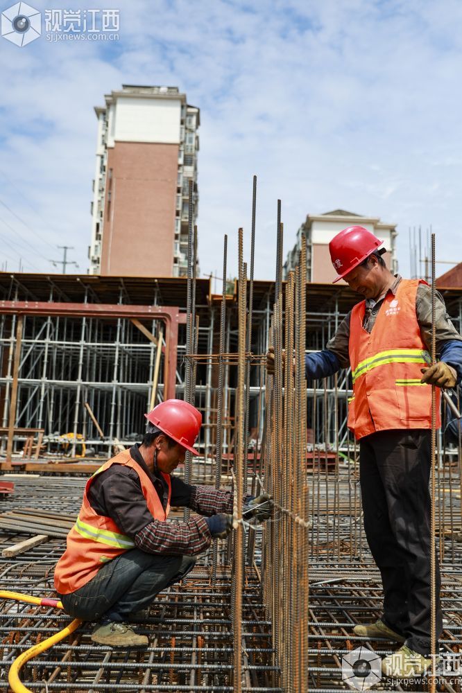2024年5月1日,“五一”国际劳动节,在江西省瑞昌市第九幼儿园项目建设工地,工人们正在加紧施工作业。