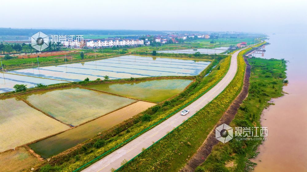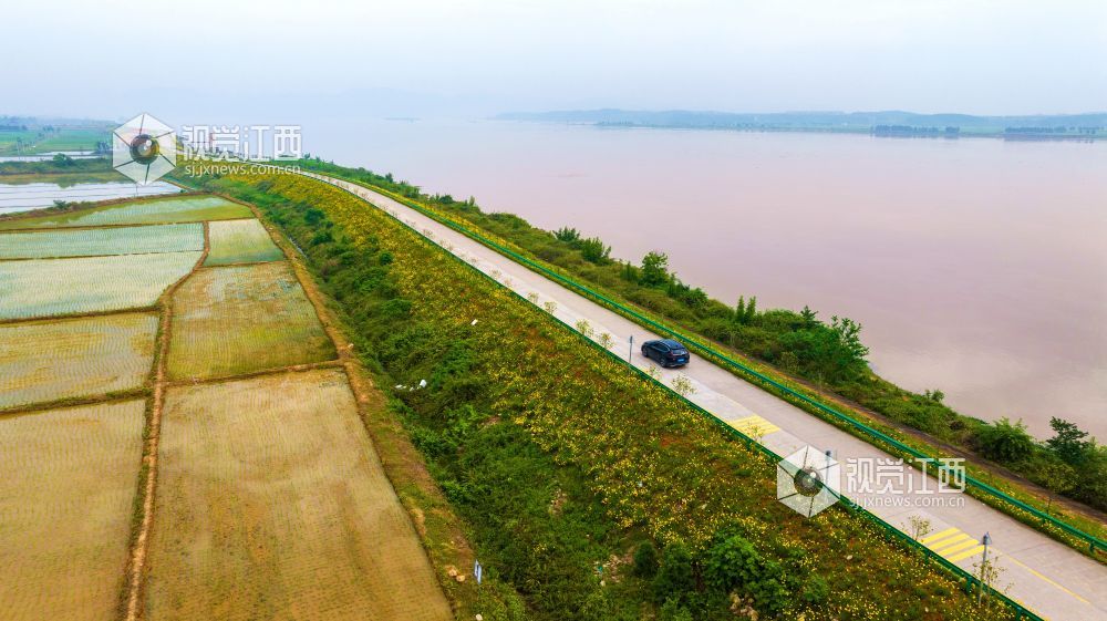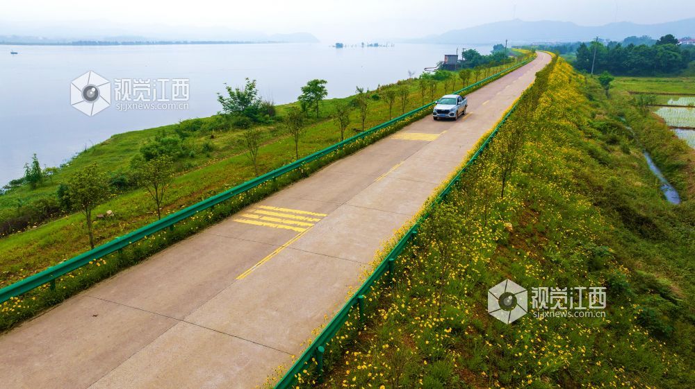 2024年5月7日,江西省吉安市吉水县沿湖西路两旁的野菊花盛开,车辆行驶在宽阔平整的公路上,构筑成赣江岸边一道美丽的风景线。