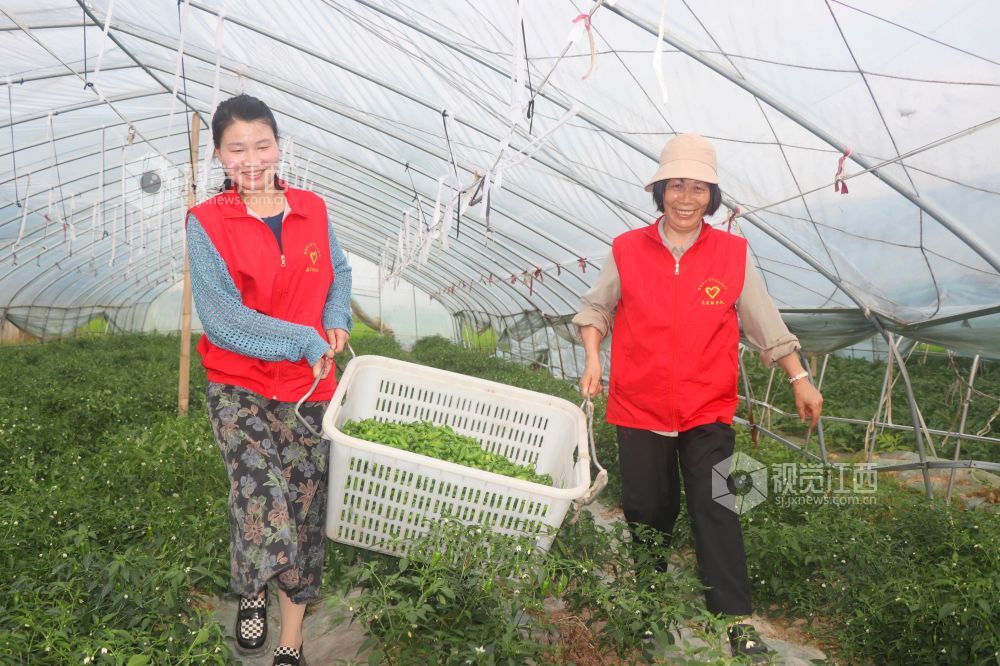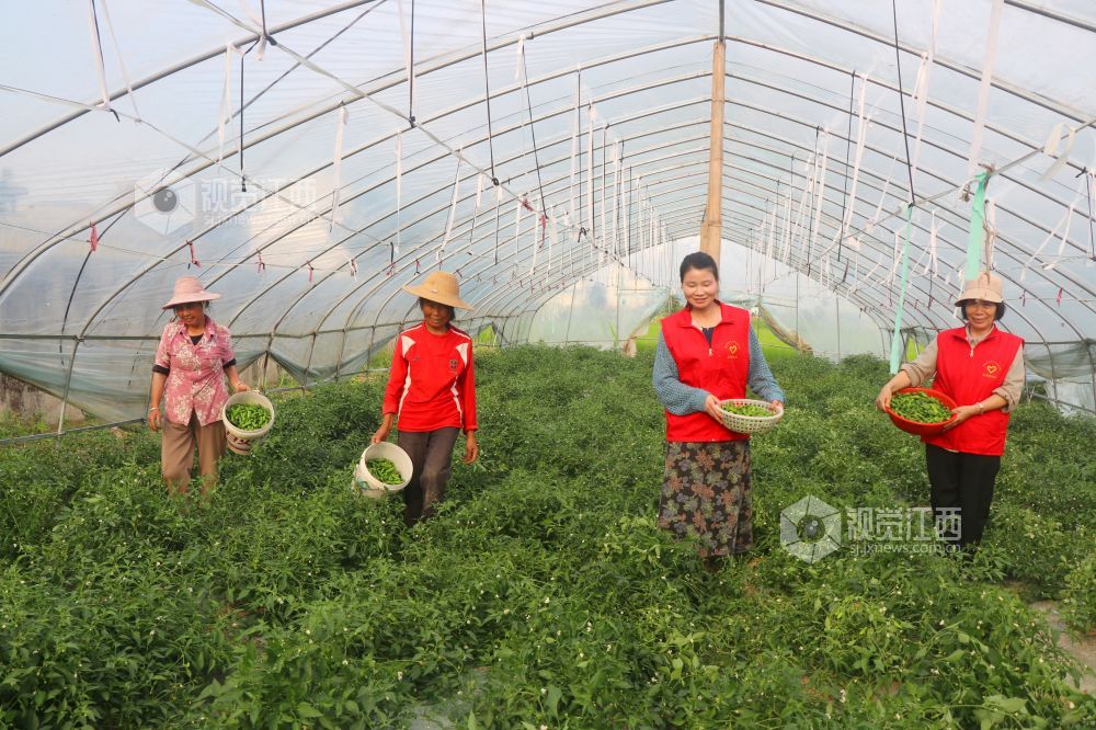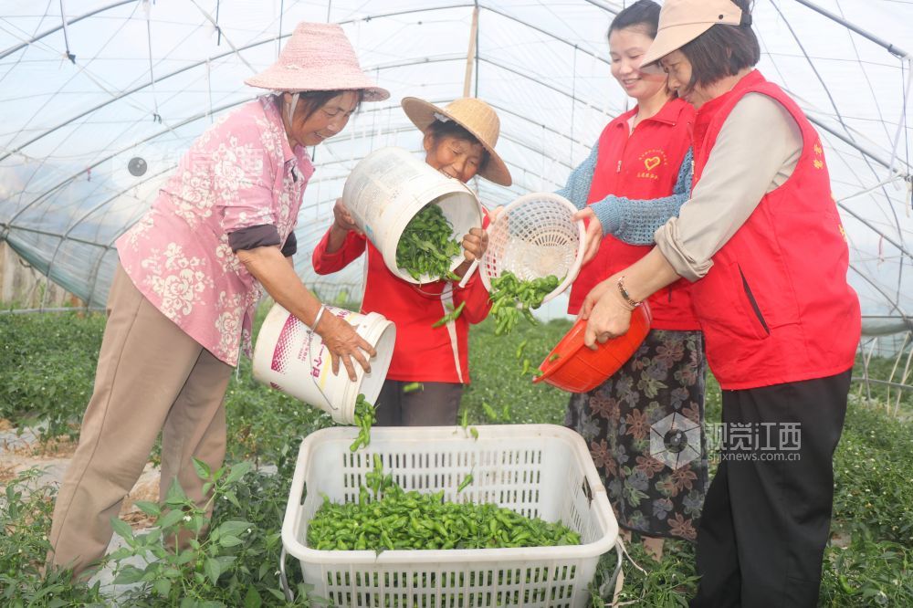 5月8日,江西省余干县鹭鸶港乡沿河村蔬菜种植基地,30多亩辣椒迎来丰收季,党员志愿者帮助农户采摘辣椒。