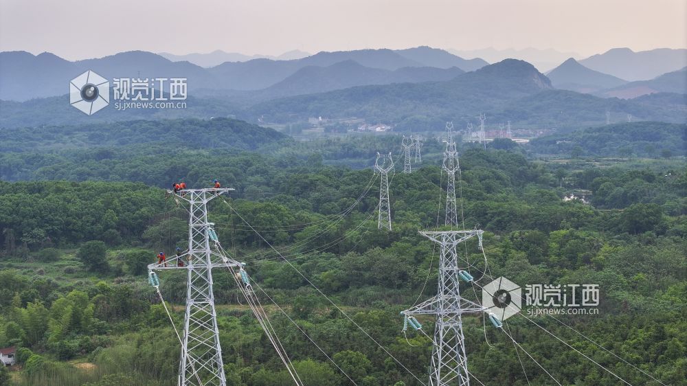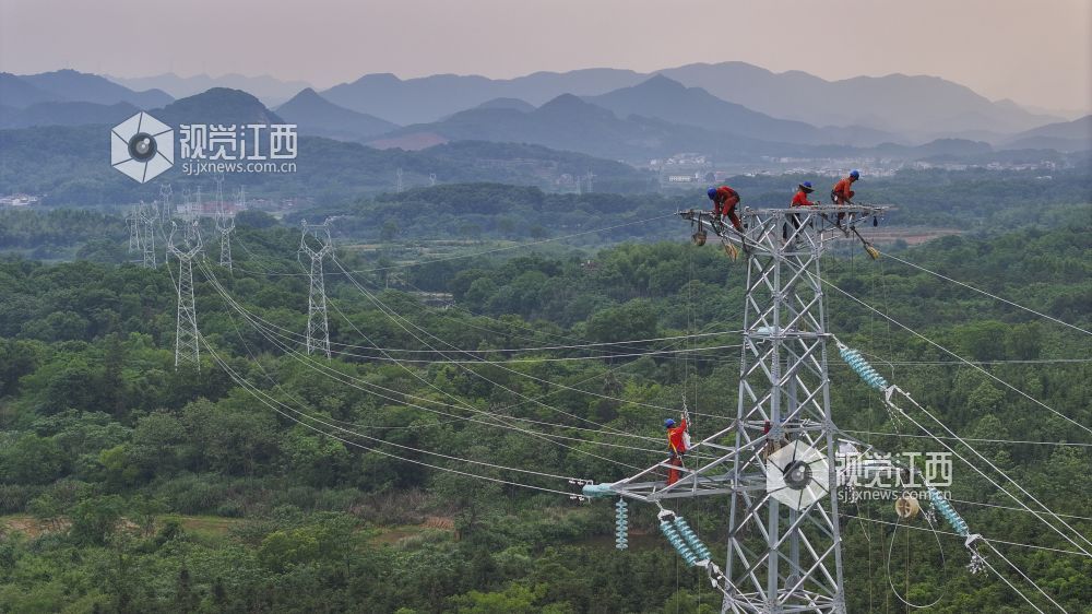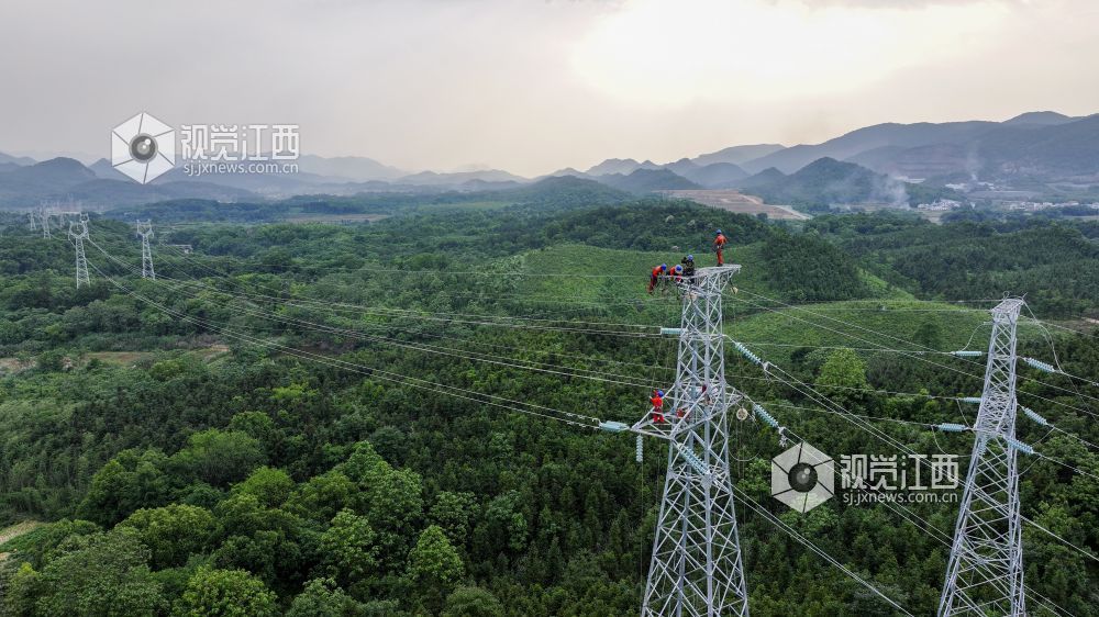 2024年5月8日,江西省瑞昌市码头镇,供电公司电力工人在110千伏输变电线路上作业。