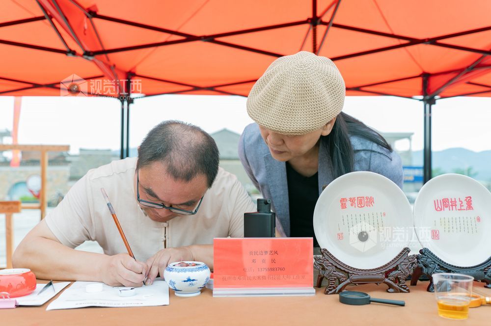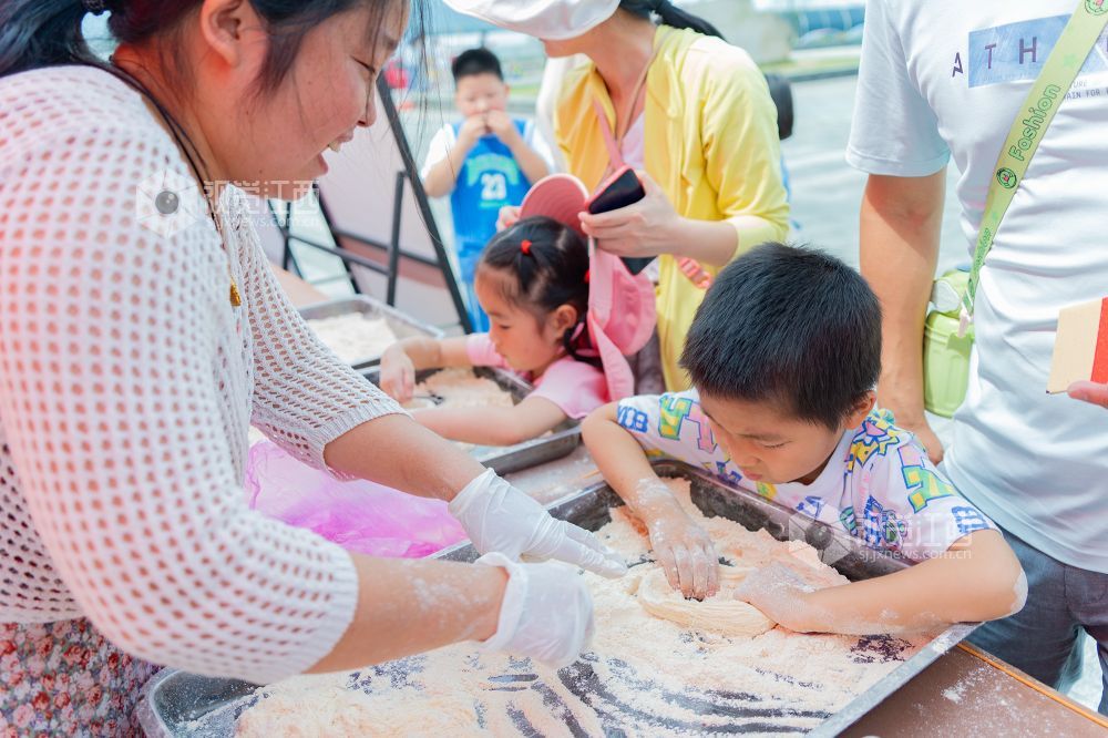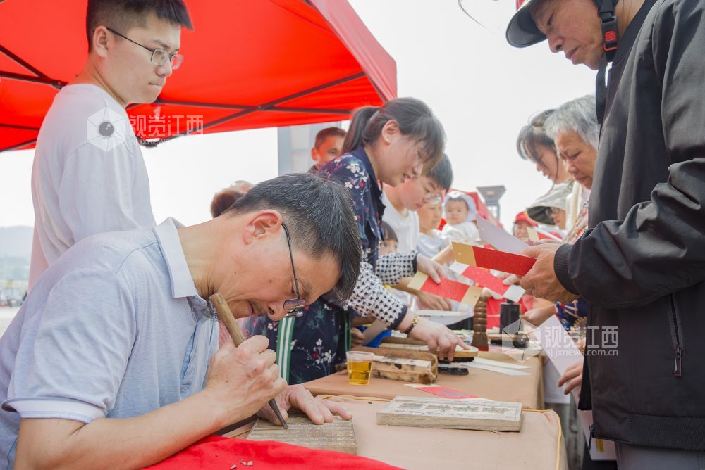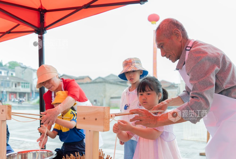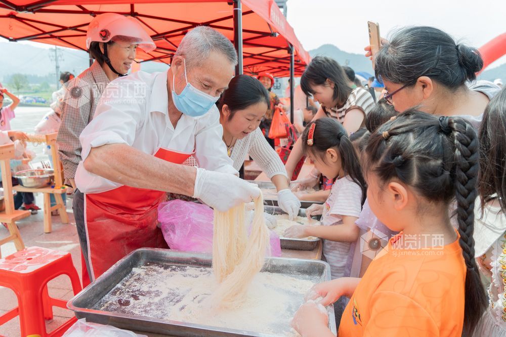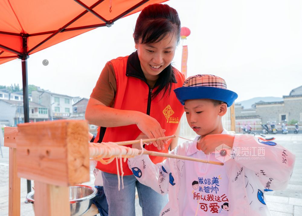 仪式现场,活动形式多样,当地群众在非物质文化遗产传承人、民间工艺大师、党员志愿者和爱心人士的指导和帮助下,参加手摇狮、藕丝糖、雕版印刷、浒湾油面和大米微书等非遗活动。
