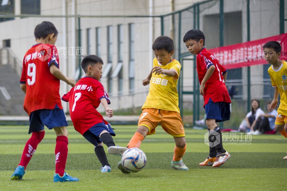 2024年5月21日,在江西省吉安市吉水县体育馆足球场,小运动员们正在绿茵场上激烈角逐。