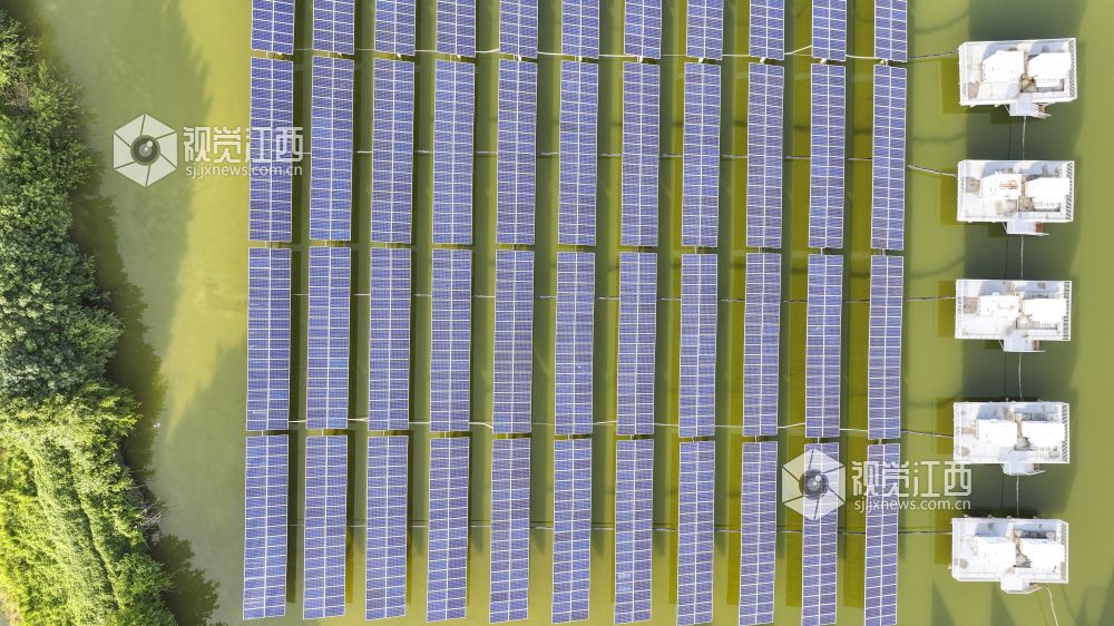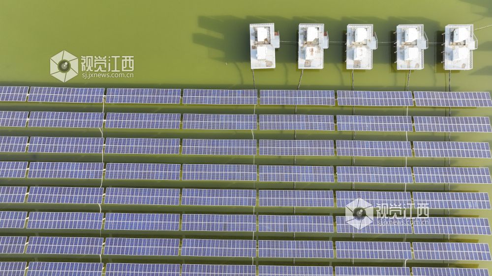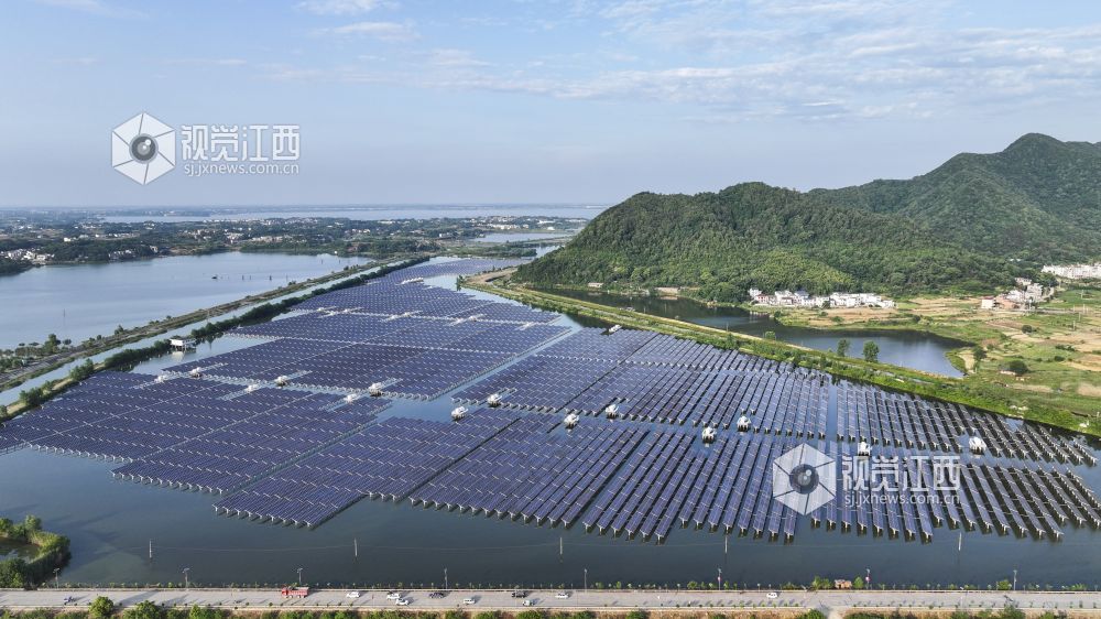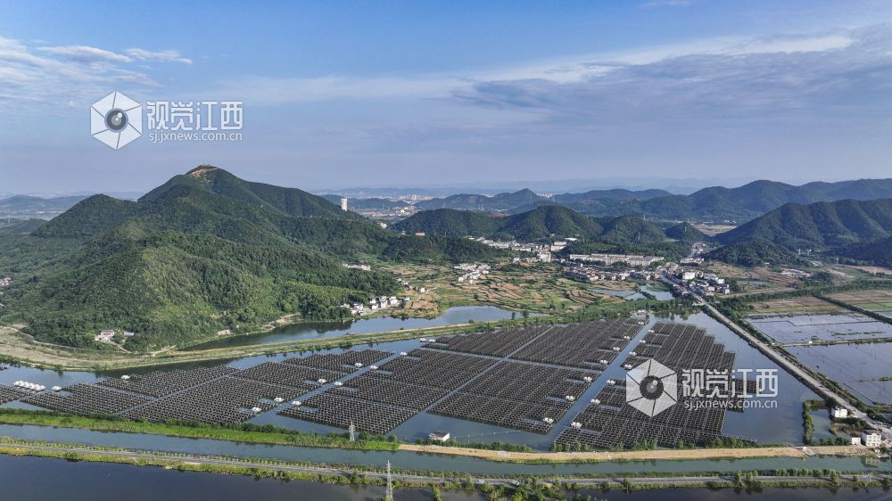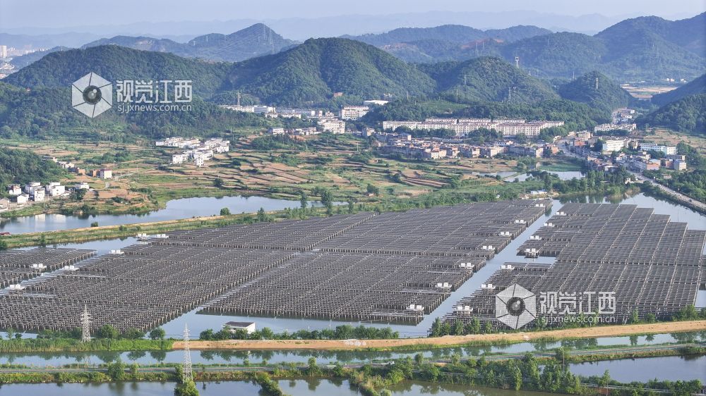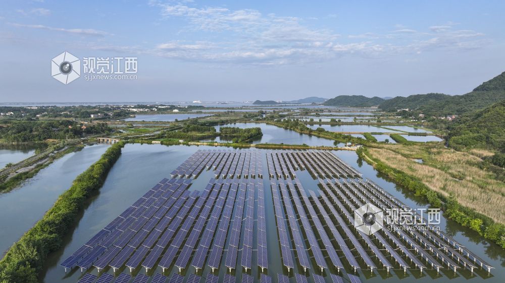 2024年5月24日,江西省瑞昌市武蛟乡达尔湖50兆瓦光伏发电站与周边景致相映成景,构成一幅美丽画卷。近年来,瑞昌市因地制宜实施“渔光互补”光伏电站项目,形成了“水上能发电、水下能养鱼”的生态美景。