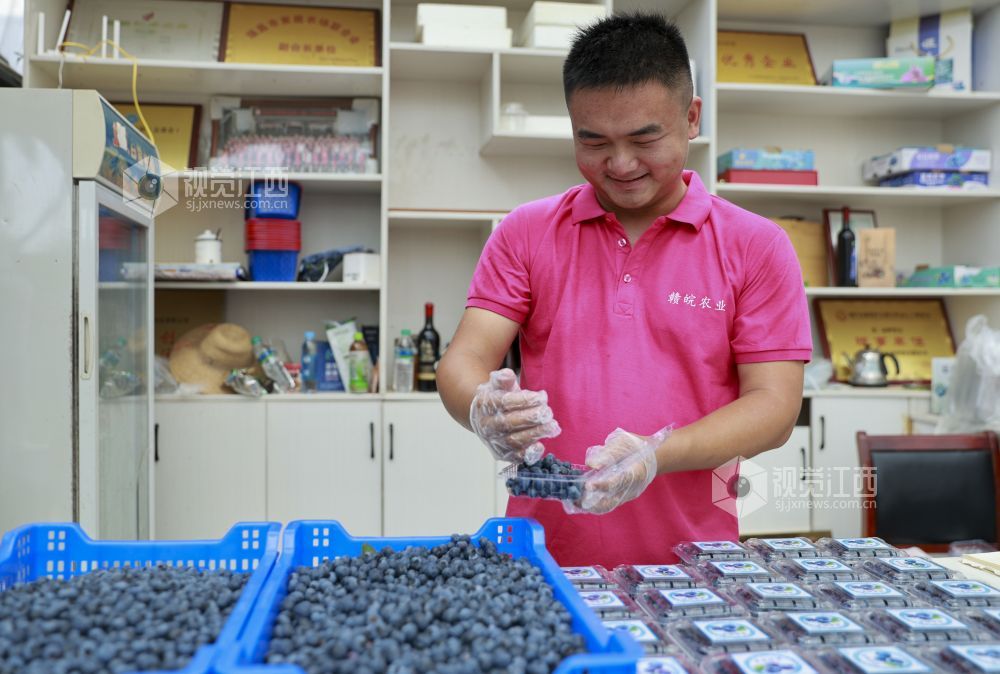 2024年5月26日,江西省瑞昌市赛湖农场蓝莓种植基地,市民正在采摘成熟的蓝莓。