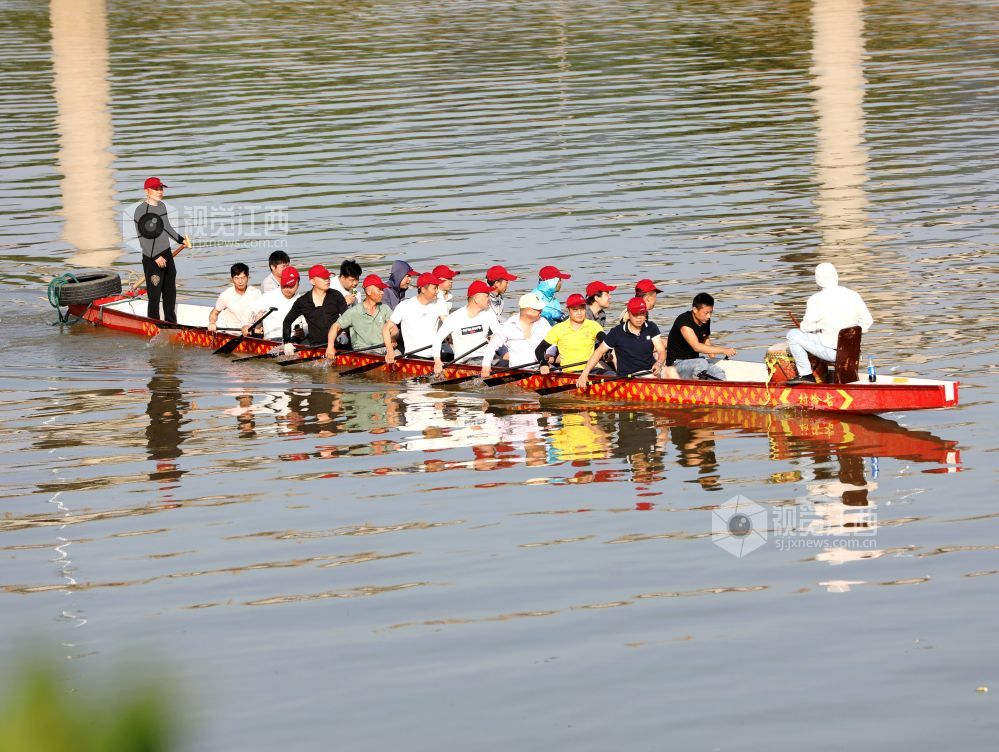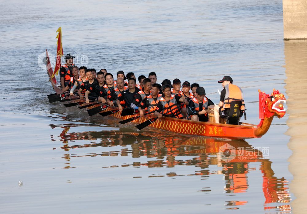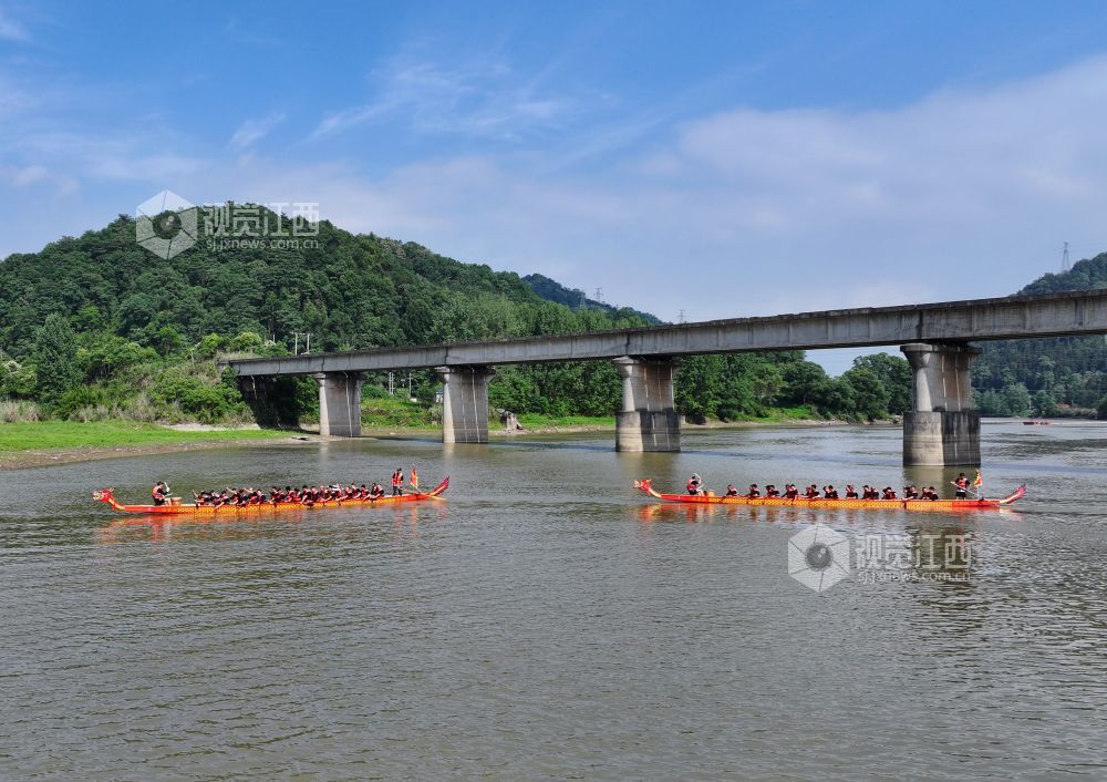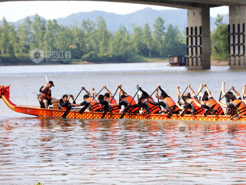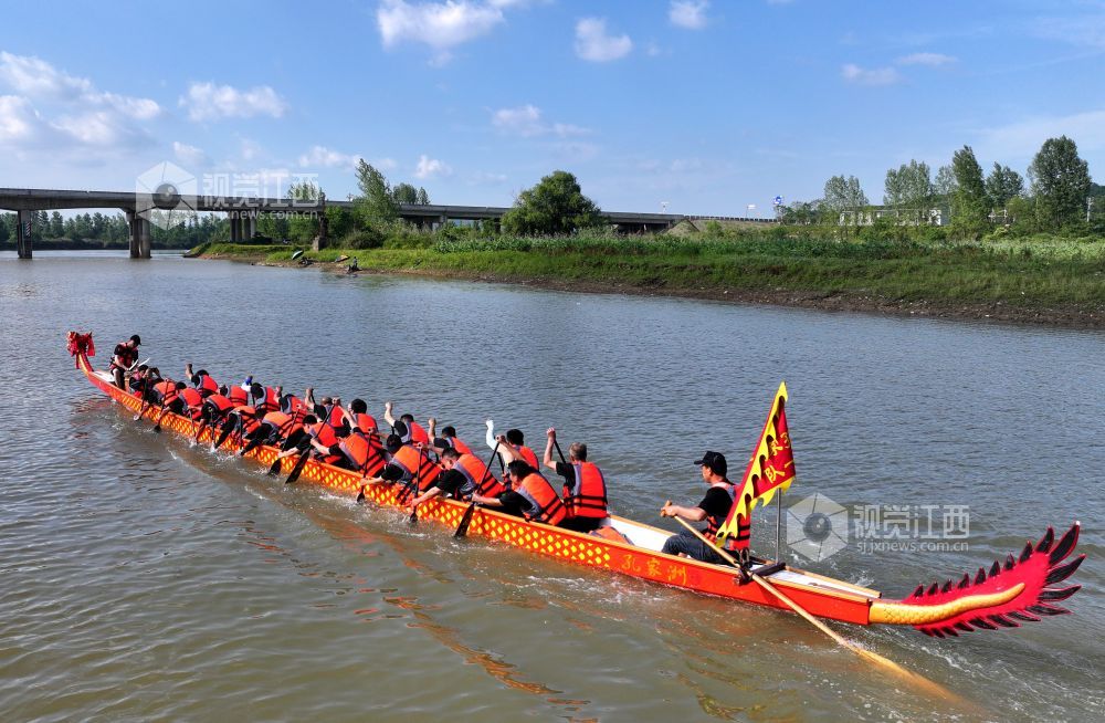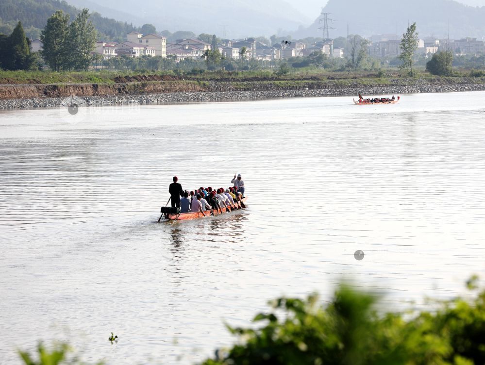 2024年5月28日,江西省分宜县分宜镇角元村孔家洲村小组的村民在村庄附近的袁河水域训练划龙舟,备战村庄自发的端午龙舟赛。