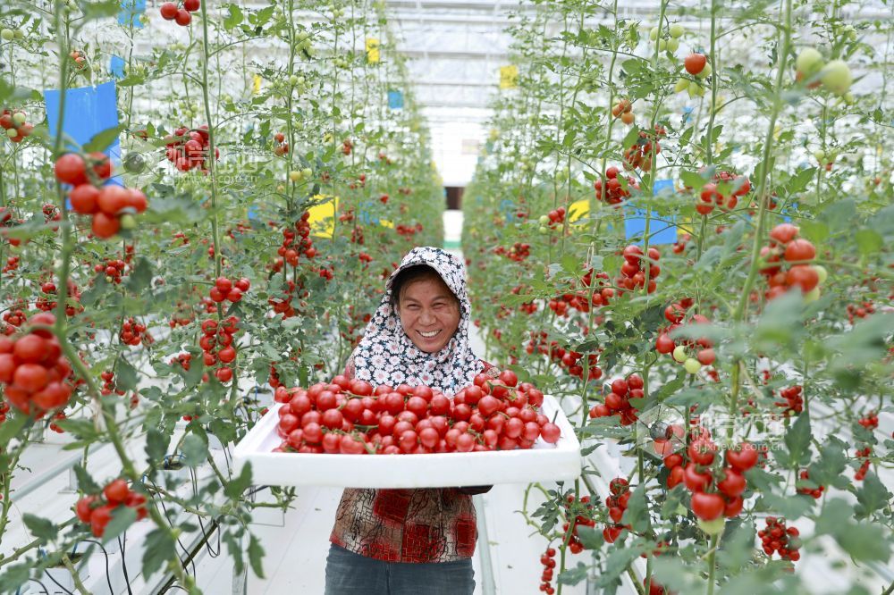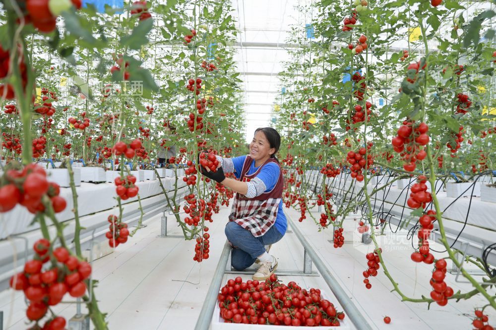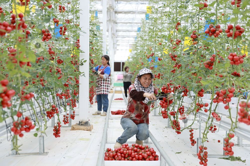 2024年6月2日,江西省瑞昌市高标准设施蔬菜示范中心,工人正在采摘西红柿,供应市场。