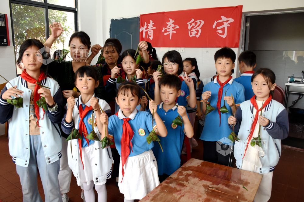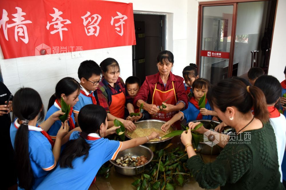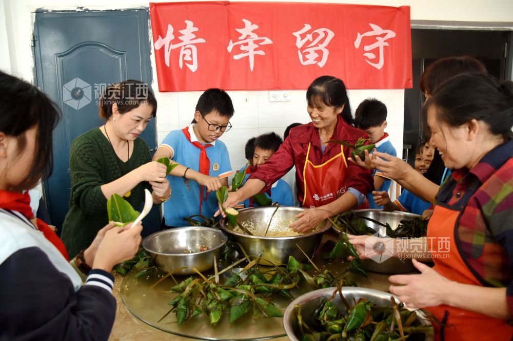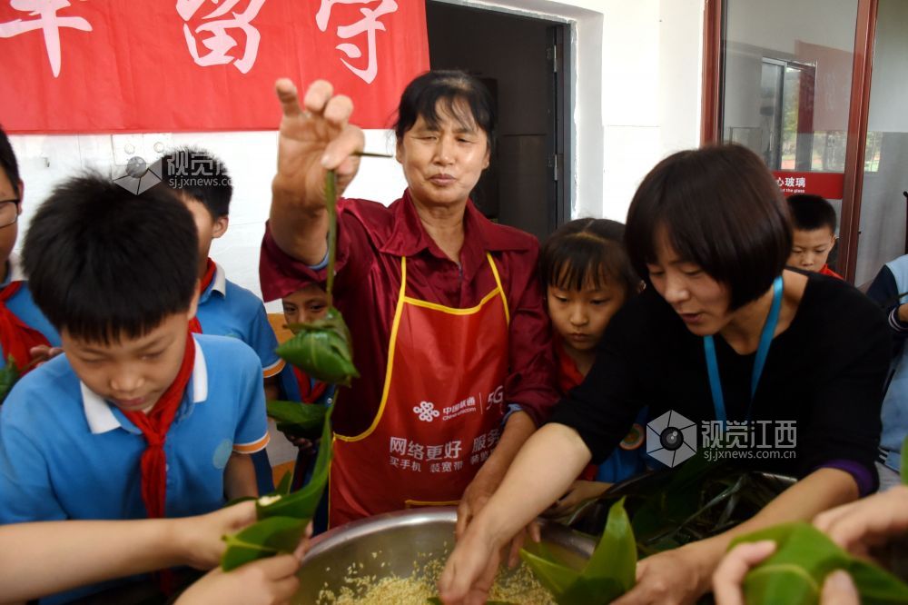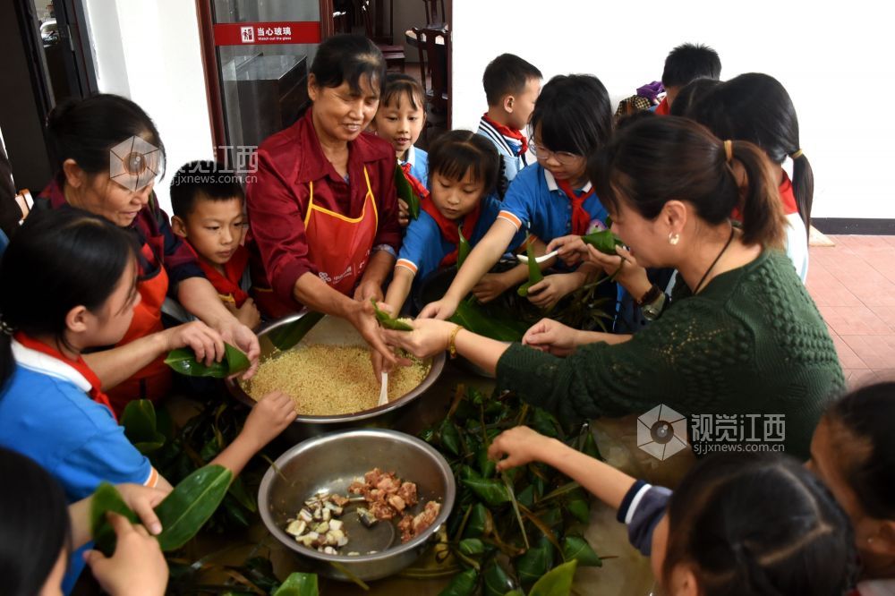 2024年6月6日下午,江西省抚州市南丰县市山镇中心小学食堂里,厨师、老师和小学生们一起包粽子,迎接端午节的到来。