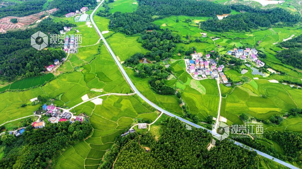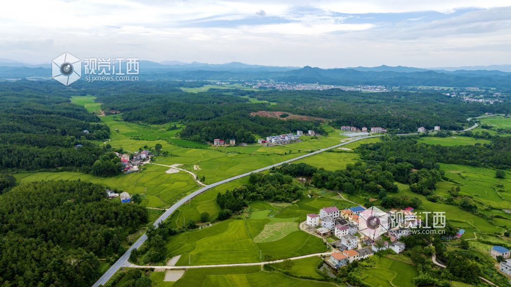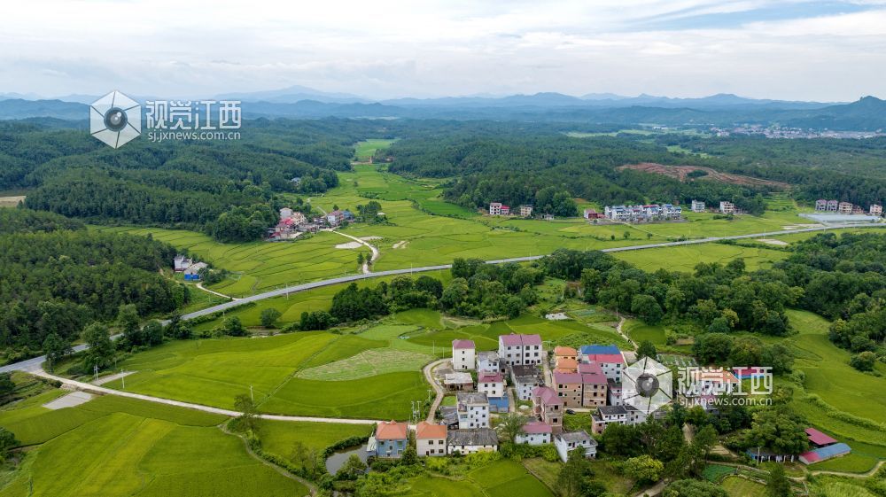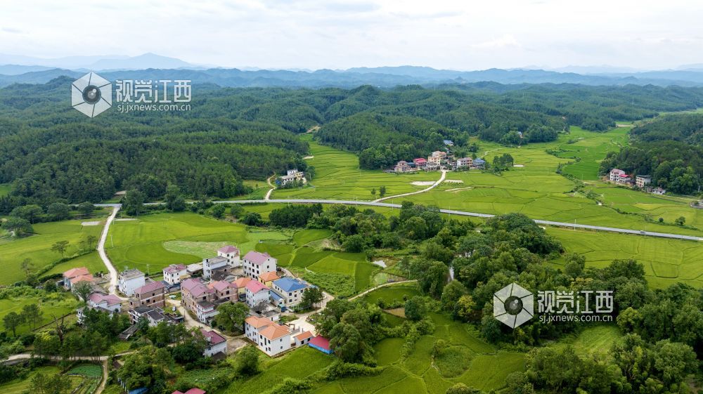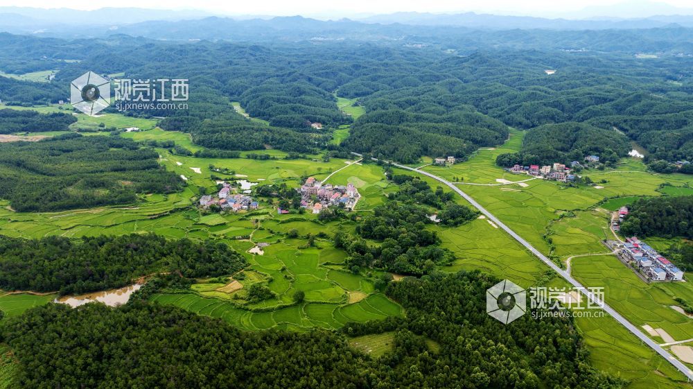 2024年6月19日,江西省吉安市吉水县白沙镇河口村绿意盎然,山林、田园、道路、民舍交相辉映,构成一幅秀美的乡村生态画卷。