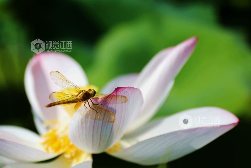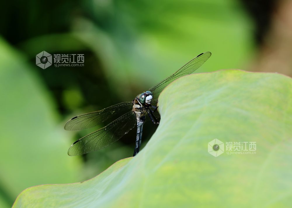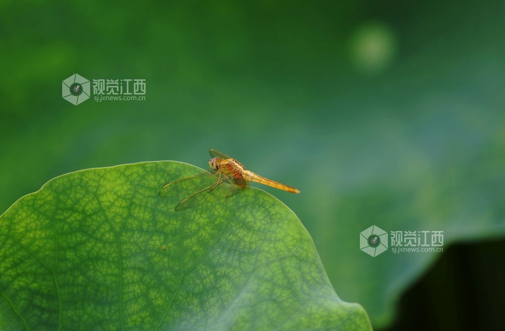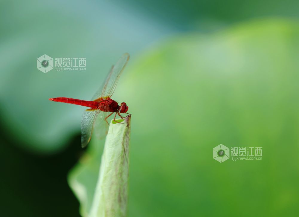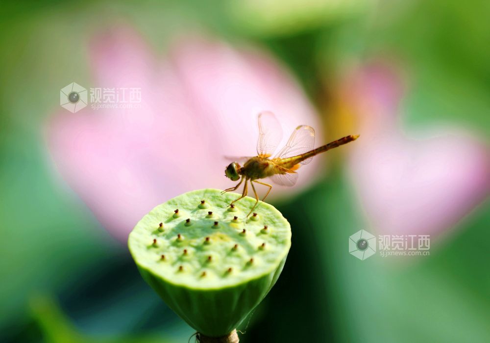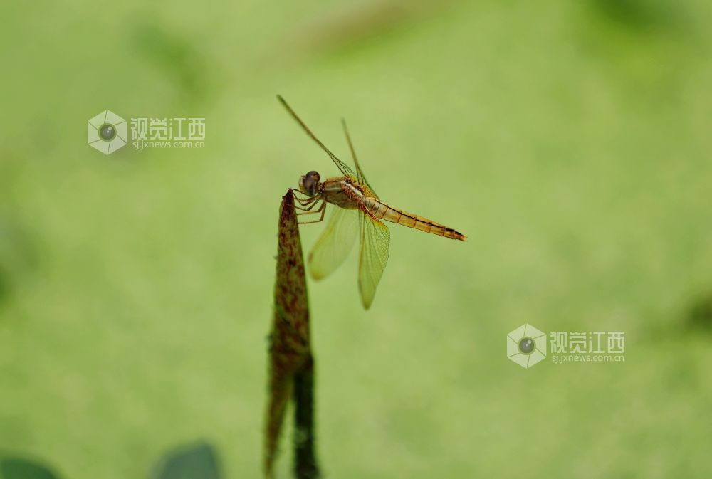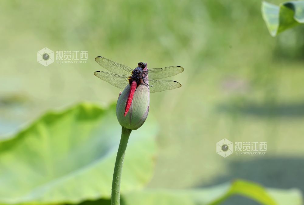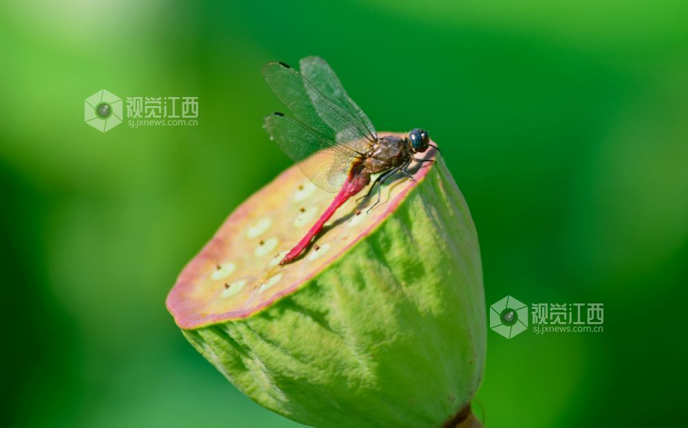 在荷花丛中,一只只种类不同、色彩迥异的蜻蜓翩翩起舞,时而落在荷尖和莲蓬上,时而站在荷叶与荷杆上,姿态各异,与荷相伴,亲密和谐,用灵活的身躯演绎着荷塘趣事。