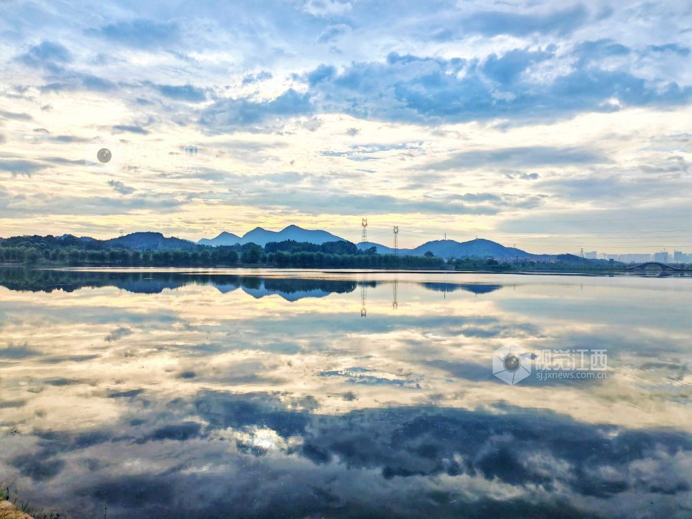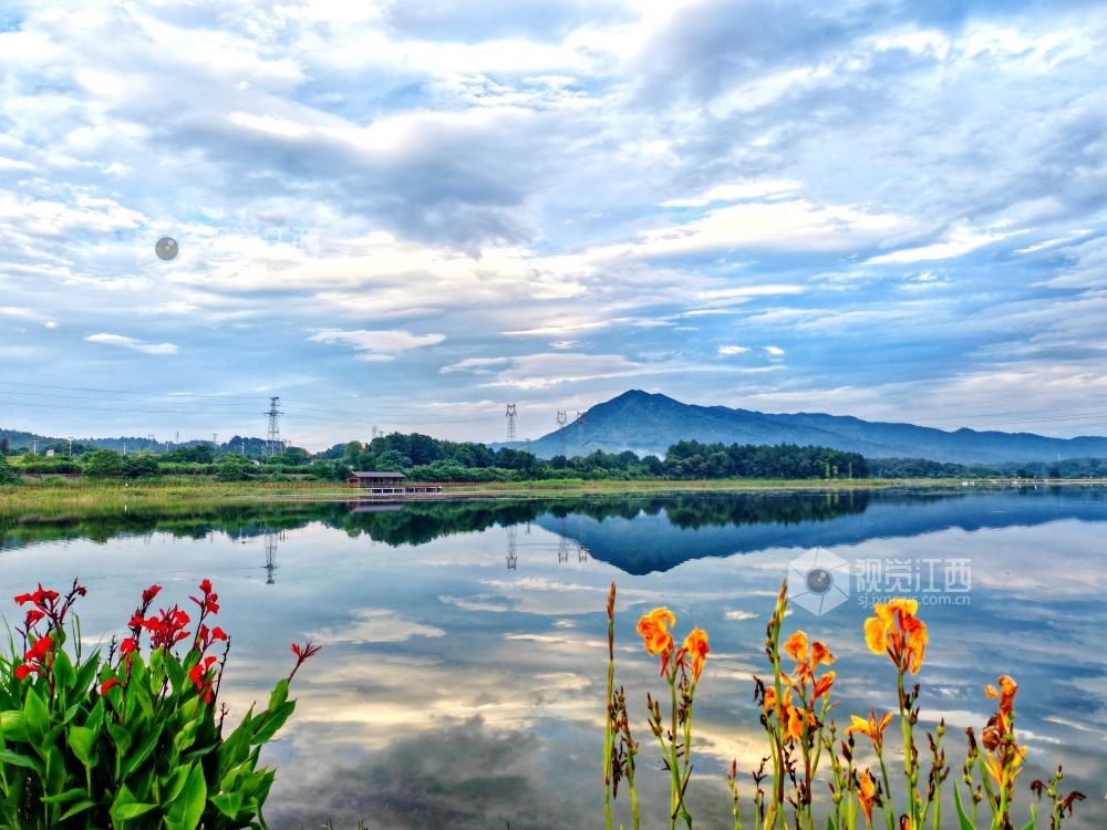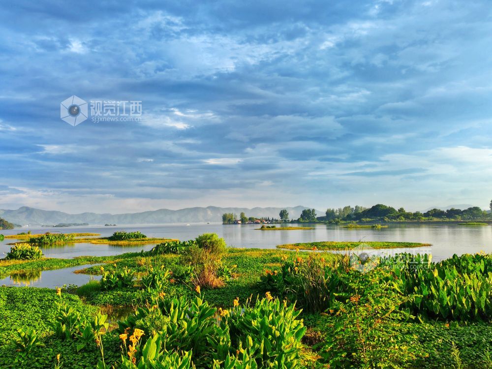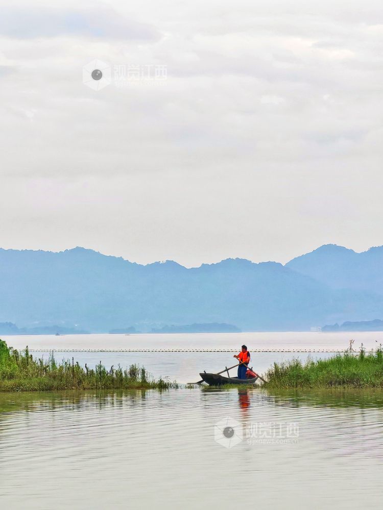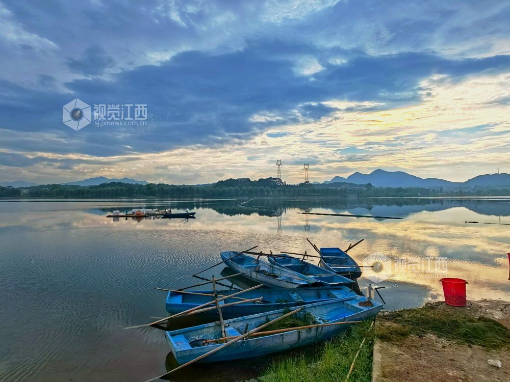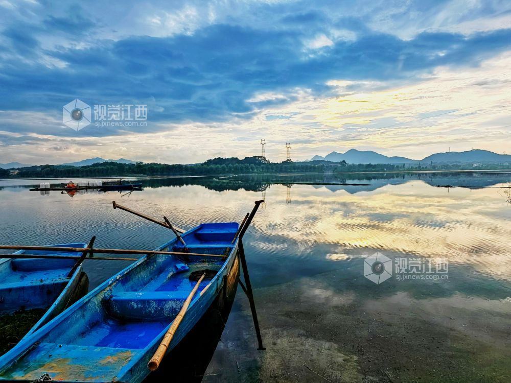 2024年6月30日,江西省分宜县介溪湿地公园,落日余晖与远山、村庄、湖水、小船相映成景。金黄色的光洒向湿地的每一处,给湿地披上了一层金黄的霞衣,让介溪湿地公园充满诗情画意。