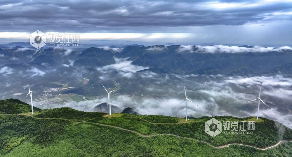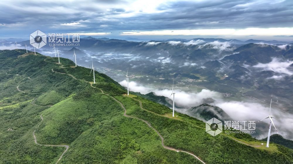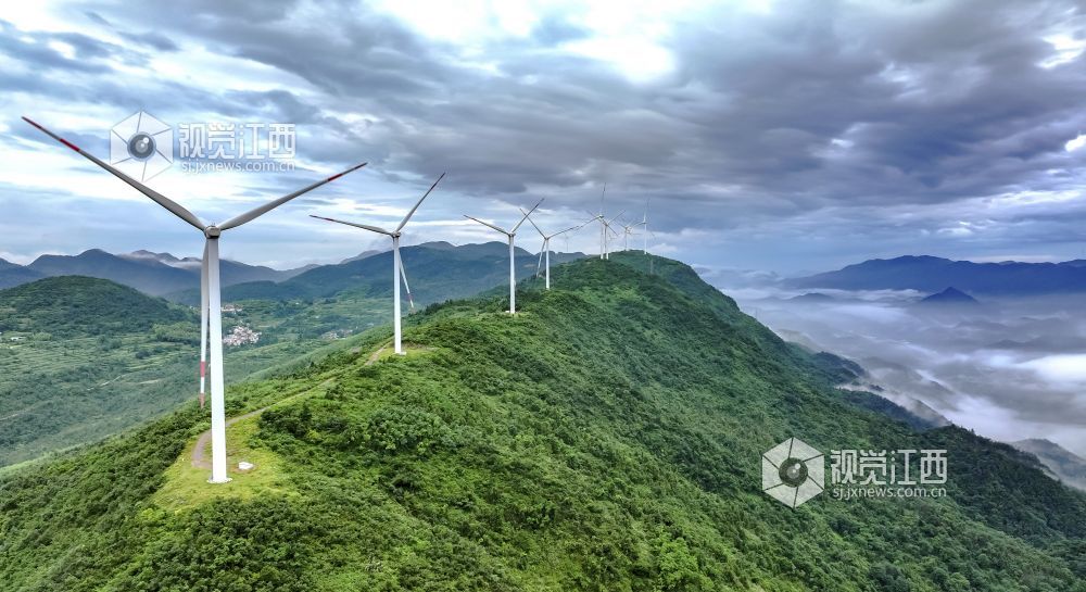2024年7月3日,江西省瑞昌市洪下乡蜈蚣山风电场,风电机组与青山、云雾等相映成画。 近年来,瑞昌市坚持绿色发展理念,利用高山风力资源优势,大力发展绿色清洁能源,实现经济效益与生态保护双赢。
