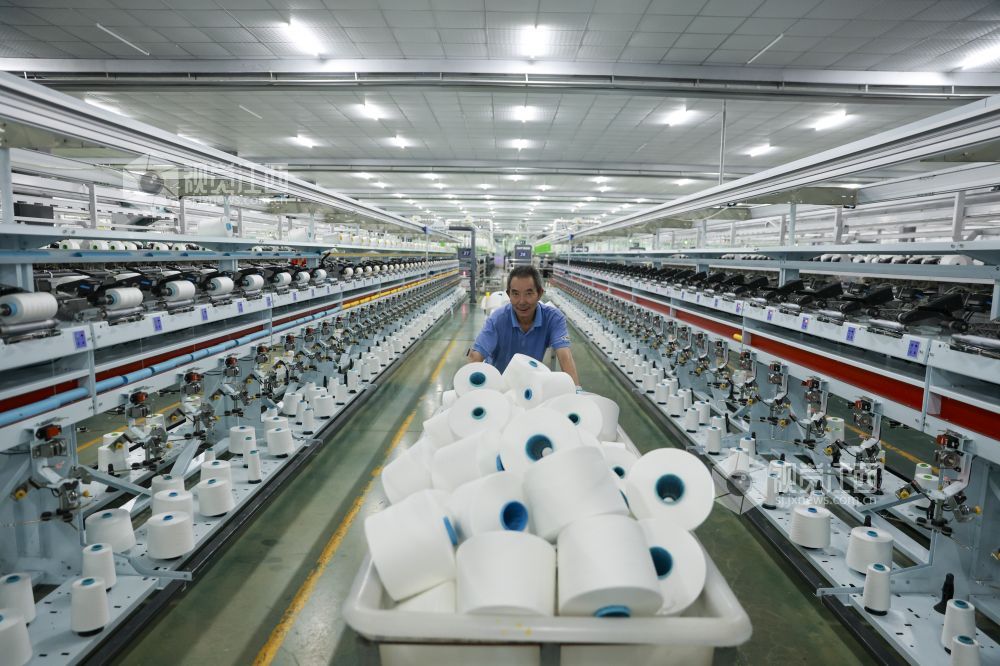 2024年7月3日,江西省瑞昌市华瑞(中国)缝纫线有限公司数字工厂内一派繁忙景象,工人在智能生产线上赶制国内外订单。