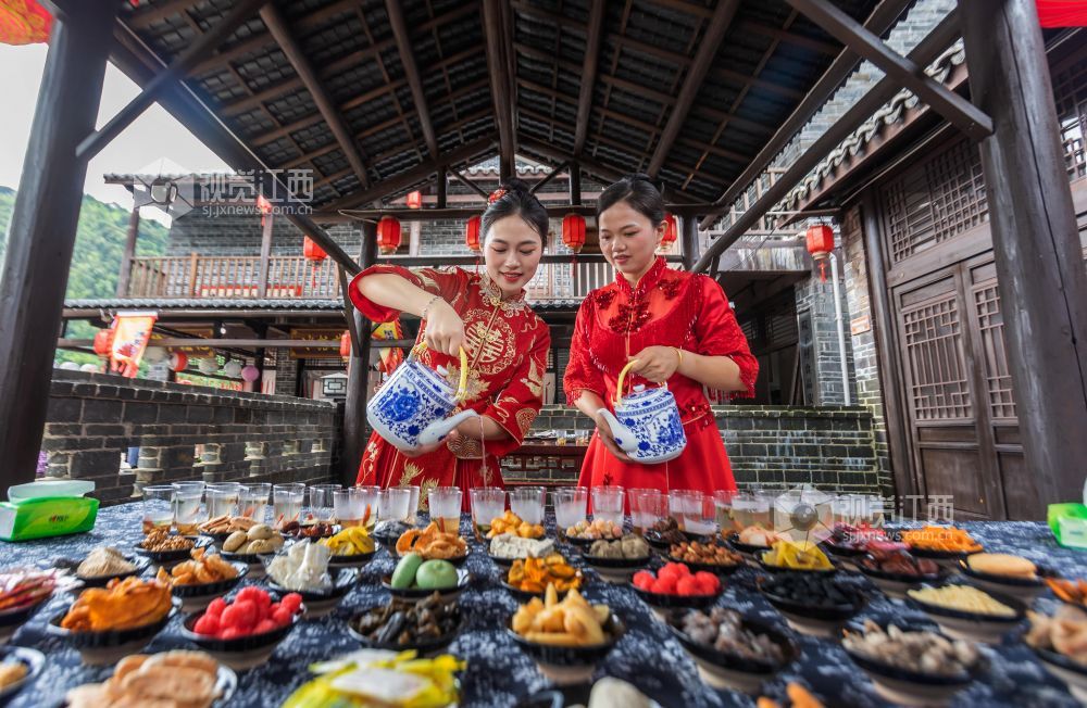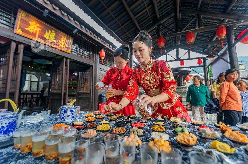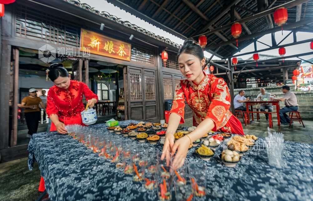 永新“新娘茶”,也称“新人碗茶”、“新人开水”,是永新千百年来流传下来的主要婚俗之一。在永新,新人成亲后,由婆婆或妯娌出面邀请全村或部分女性村民到新人家聚会所喝的茶饮和茶点,称“新娘茶”。新娘茶是新娘初来乍到认识亲朋邻里、展示自我能力的一种方式。永新新娘茶具有鲜明的地方特色,精心选择本地食材,多用炒黄豆、胡萝卜干、盐姜、橙皮冲泡,并用和子四珍(橙皮、酱姜、酱萝卜、蜜茄)等茶点佐茶。