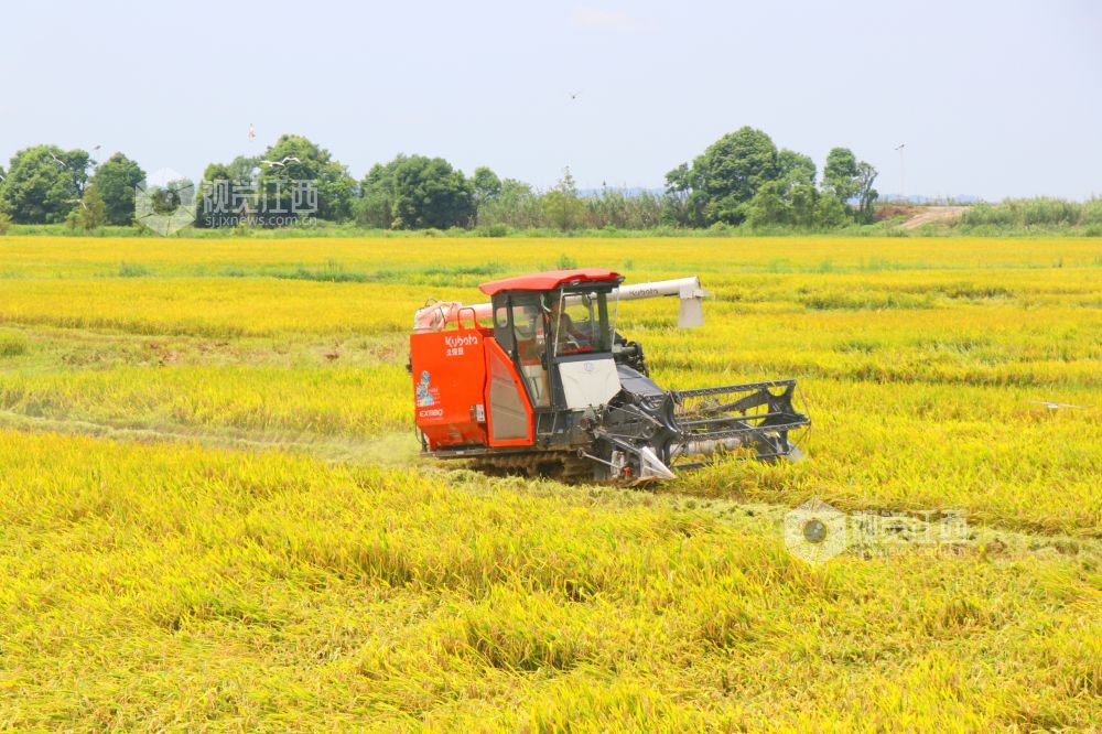 7月6日,在江西省余干县康山垦殖场大湖口分场,当地农民驾驶着收割机正在抢收早稻。