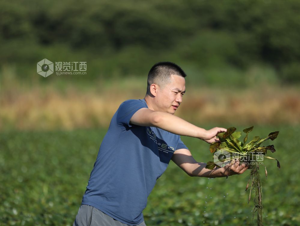 2024年7月7日,种植户正在菱角基地查看菱角长势情况。仲夏时节,江西省分宜县凤阳镇沔村村500余亩菱角种植基地,菱叶铺满池塘,随风轻轻拂动,宛如一块绿毯镶嵌于大地。预计7月中旬菱角陆续成熟,可采摘供应市场。