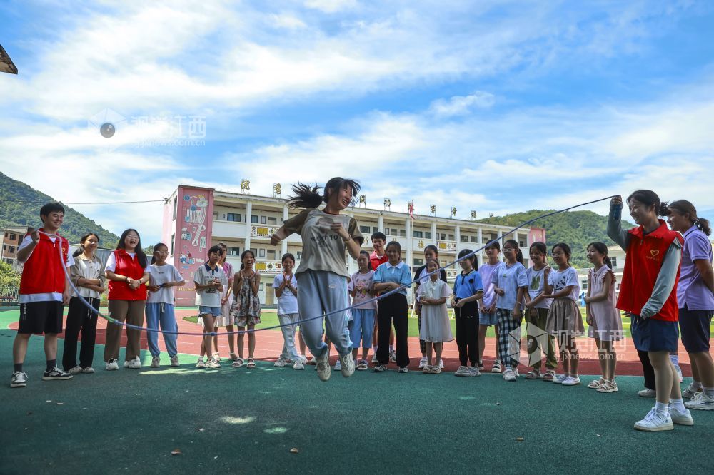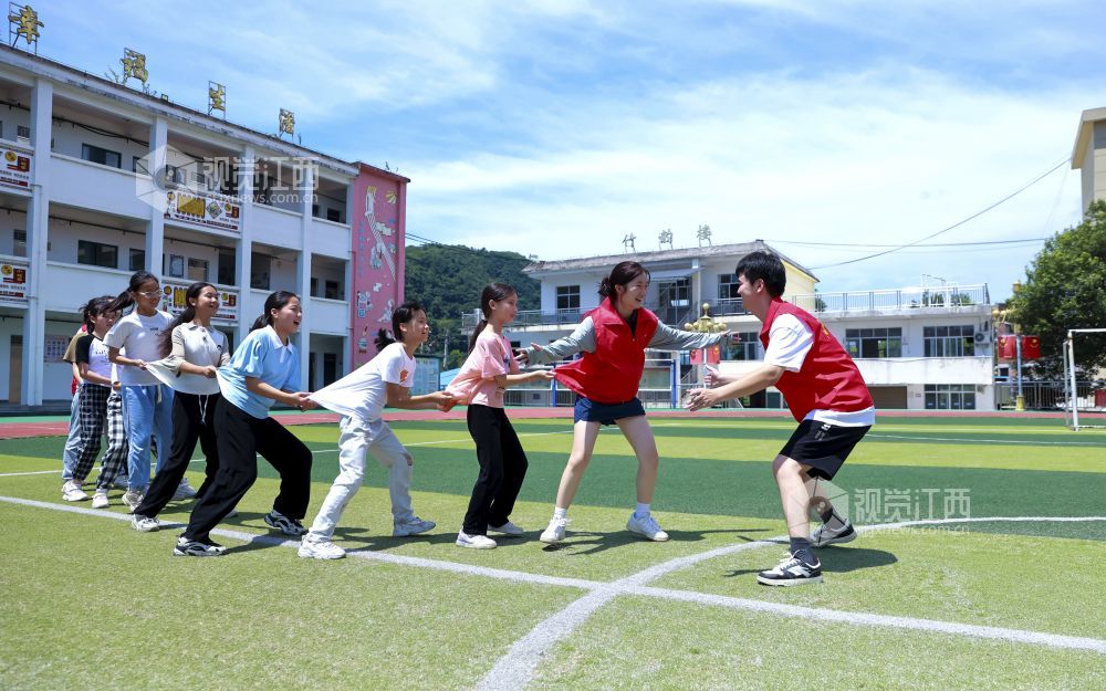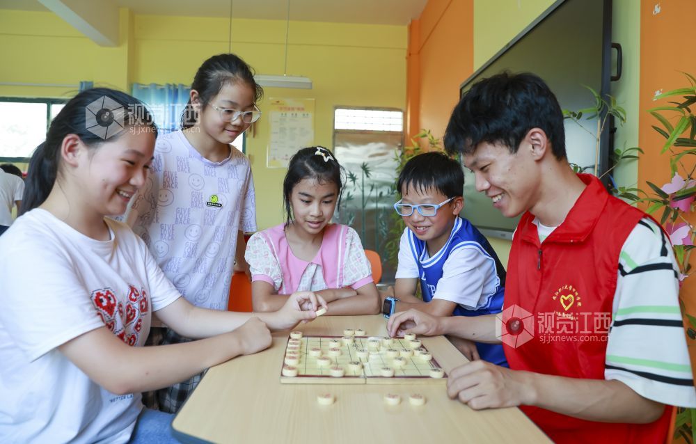 2024年7月8日,江西省瑞昌市南义镇中心小学,大学生志愿者和留守儿童们一起进行文体锻炼、益智游戏等。