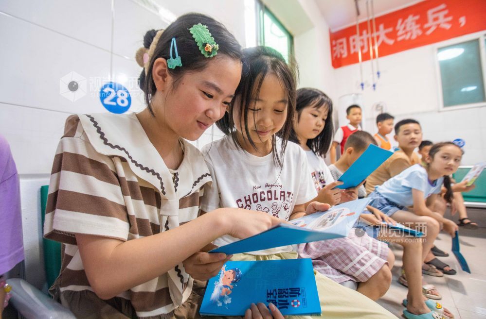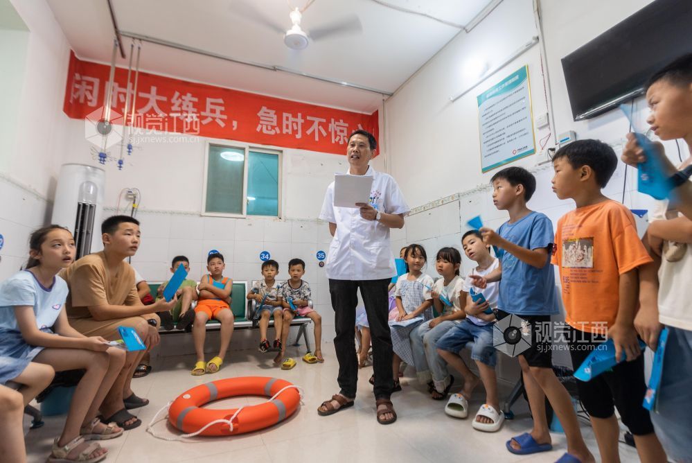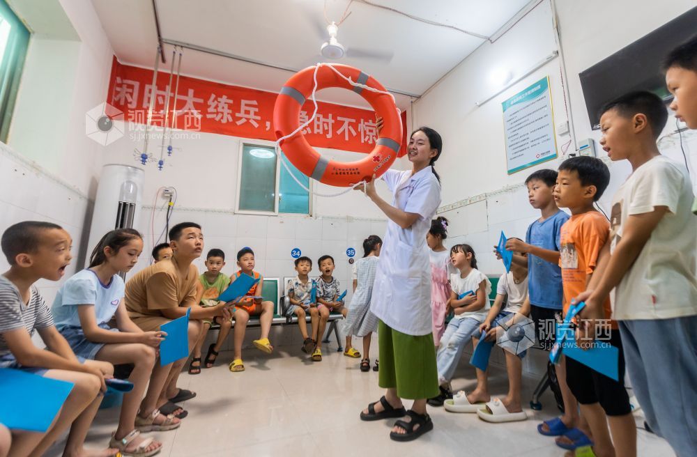 7月9日,在江西省永新县芦溪乡卫生院开展的暑假防溺水宣传活动现场,医护人员从安全意识、自救常识、救援方法等方面,向孩子们讲述了如何防止溺水、溺水时应如何开展自救等知识。