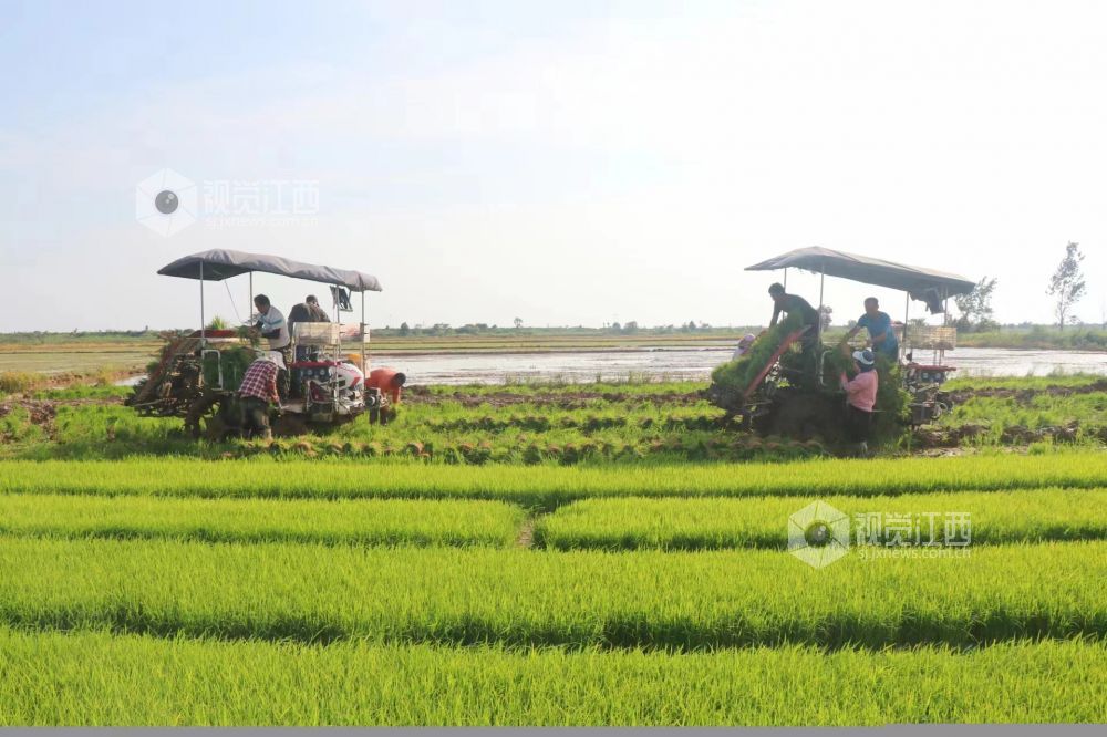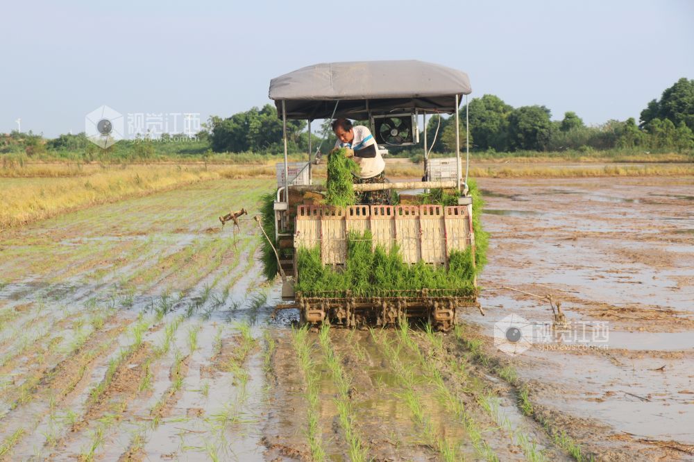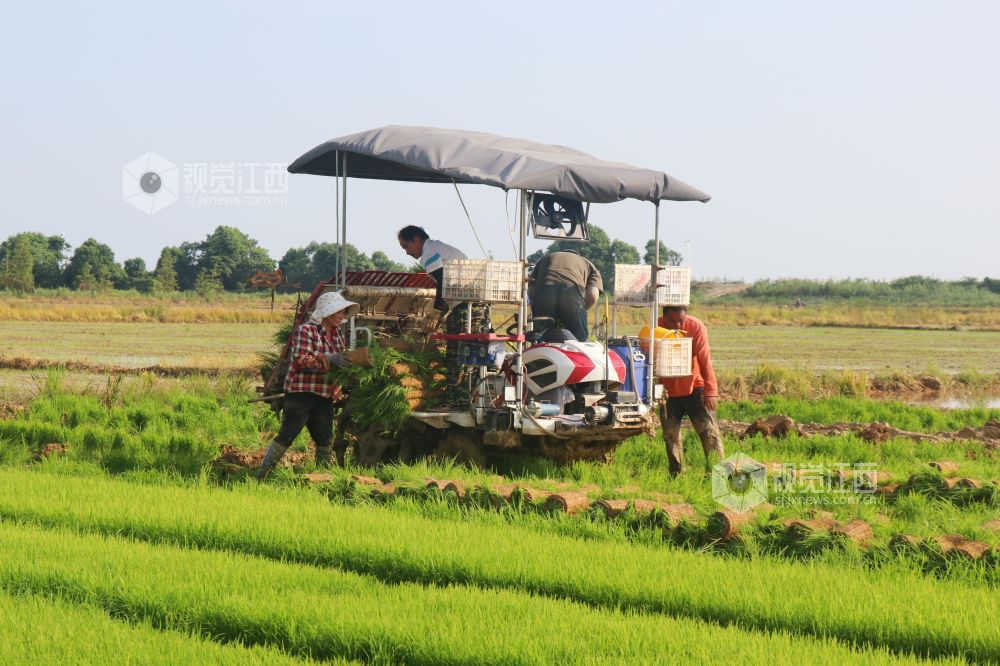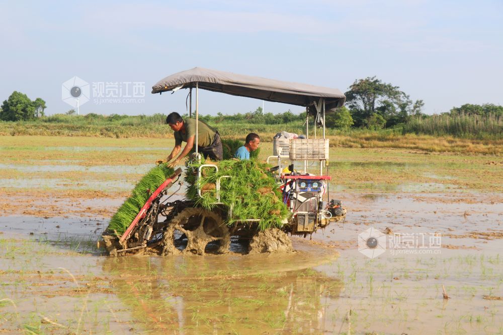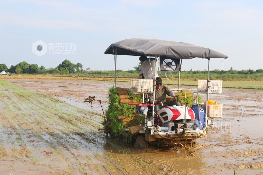 7月9日,在江西省余干县康山垦殖场大湖口分场农田里,农民驾驶插秧机进行水稻插秧。“双抢”时节,当地农民忙碌在田间地头,抢抓农时栽插秧苗,为秋粮丰收打好基础。
