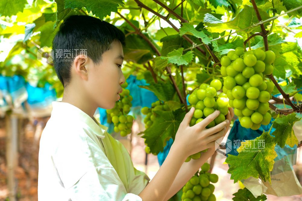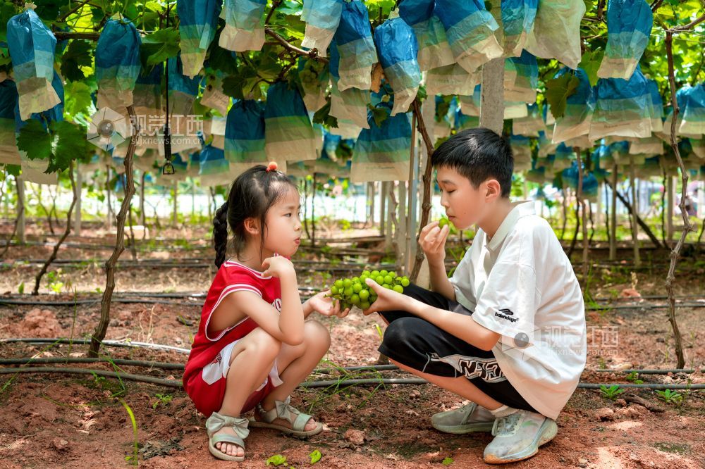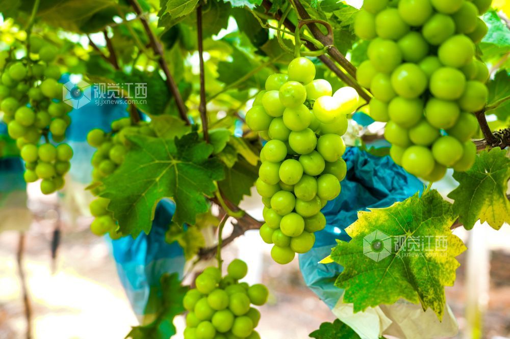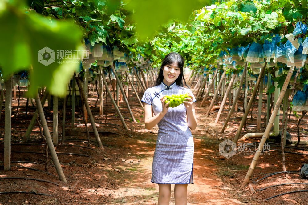 7月14日,在江西省吉安市峡江县马埠镇固源村淘乐园果业合作社葡萄园,一座座标准化种植大棚,一串串翠绿葡萄挂满枝条,吸引游客前来观赏美景,乐享采摘的乐趣。