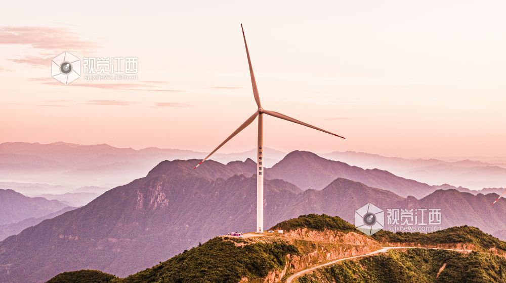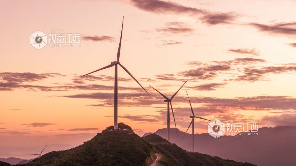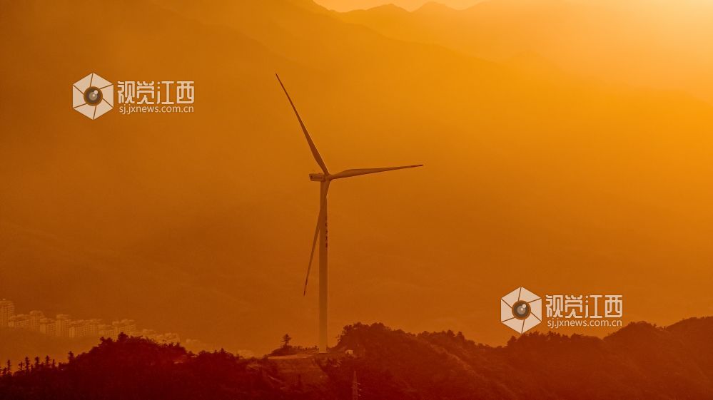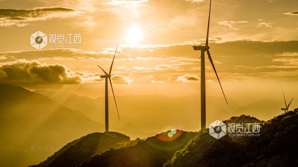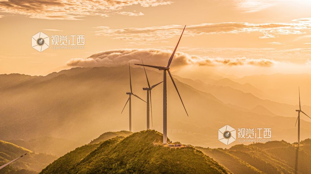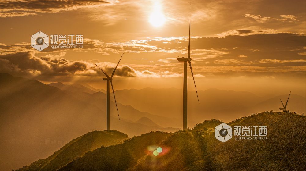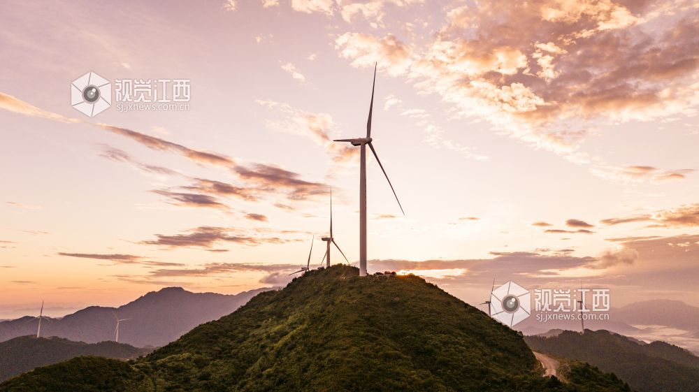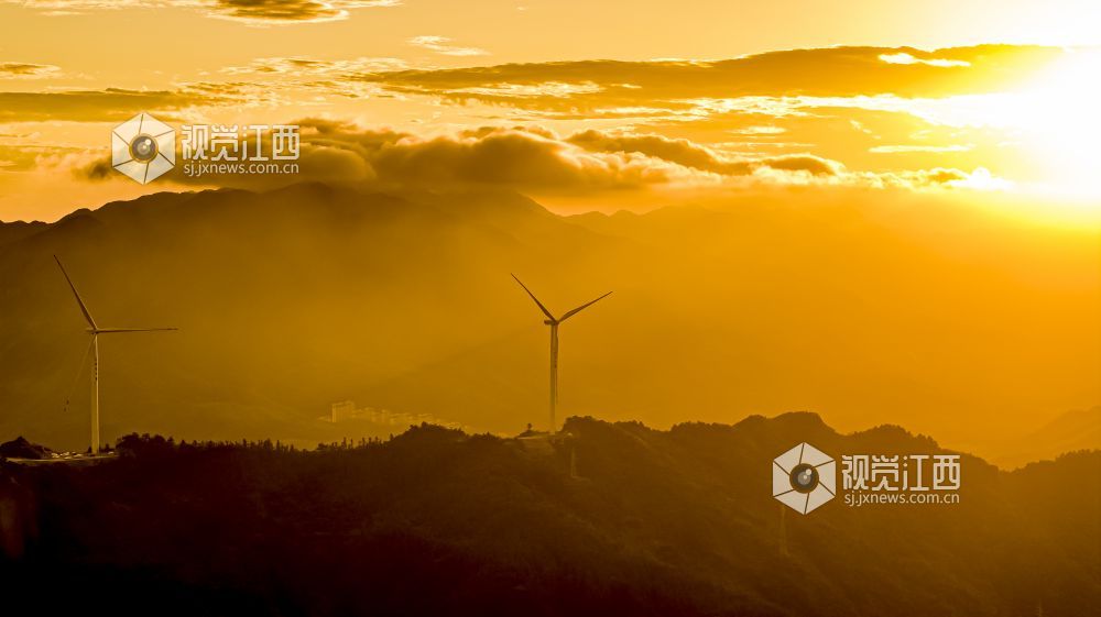 2024年7月21日,江西省宜春市靖安县八角尖,云雾缭绕,朝霞漫天,风力发电站与周围群山构成一幅美丽画卷。这里海拔1100米,虽然山下夏日炎炎,但这里却凉风习习。