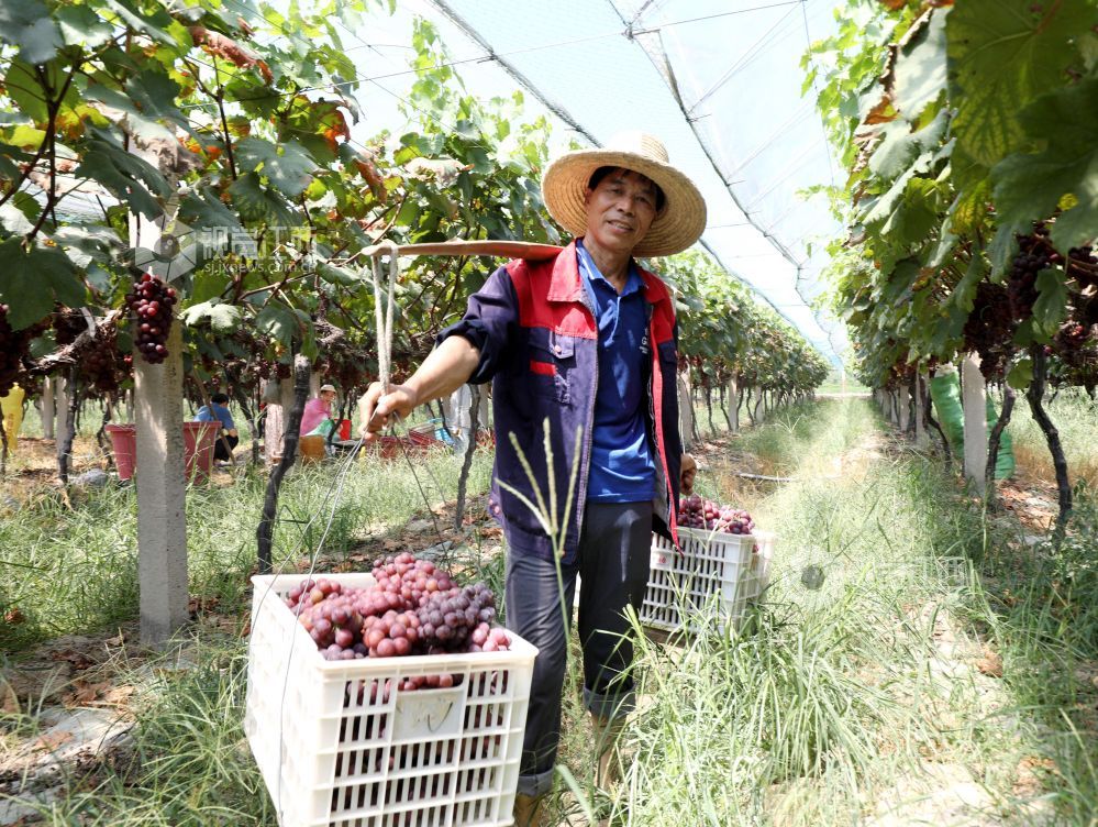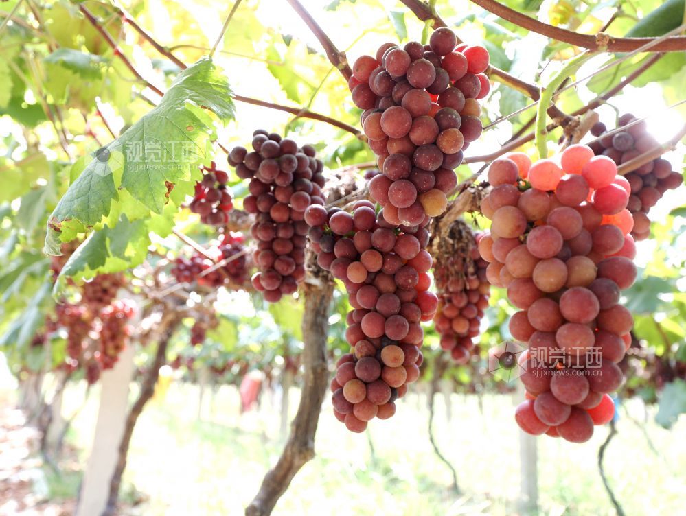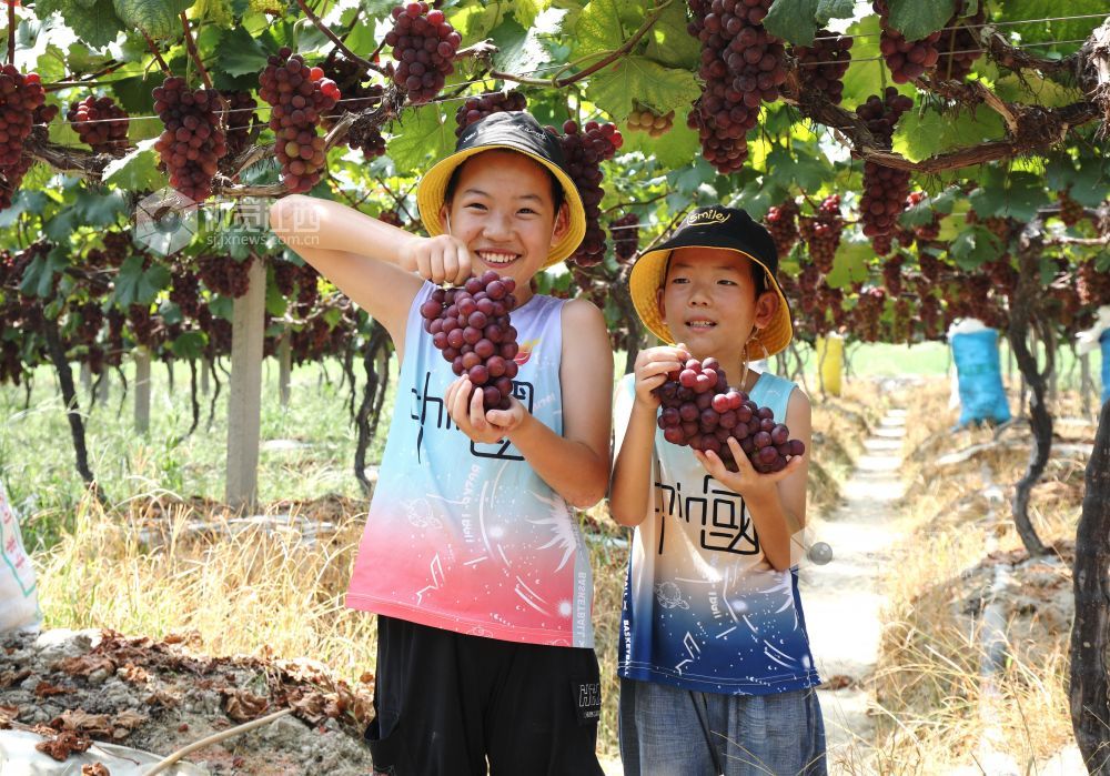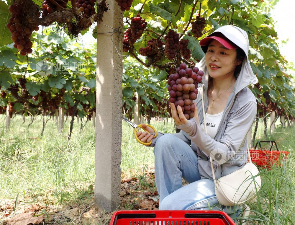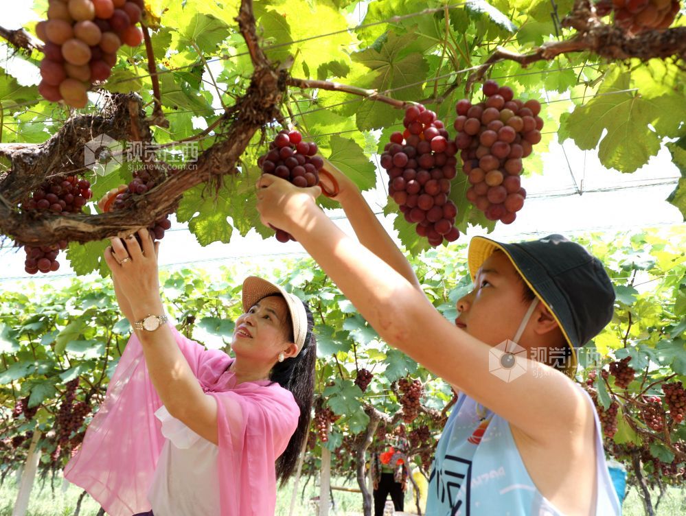2024年7月22日,江西省分宜县凤阳镇郭家村生态葡萄种植基地,果农和游客正在采摘成熟的葡萄。近年来,分宜县引导农民采取“合作社+基地+农户”的模式,因地制宜发展优质葡萄种植,促进农旅融合发展,带动农民增收致富。